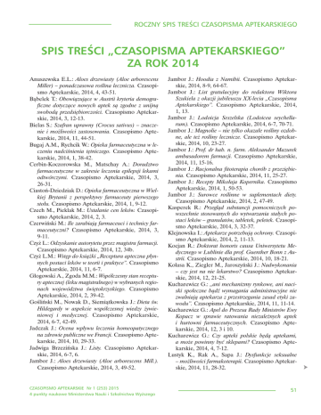 ROCZNY SPIS TREŒCI CZASOPISMA APTEKARSKIEGO SPIS TREŒCI „CZASOPISMA APTEKARSKIEGO” ZA ROK 2014 Anuszewska E.L.: Aloes drzewiasty (Aloe arborescens Miller) – ponadczasowa roœlina lecznicza. Czasopismo Aptekarskie, 2014, 4, 43-51. B¹belek T.: Obowi¹zuj¹ce w Austrii kryteria demograficzne dotycz¹ce nowych aptek s¹ zgodne z unijn¹ swobod¹ przedsiêbiorczoœci. Czasopismo Aptekarskie, 2014, 3, 12-13. Bielas S.: Szafran uprawny (Crocus sativus) – znaczenie i mo¿liwoœci zastosowania. Czasopismo Aptekarskie, 2014, 11, 44-51. Bugaj A.M., Rychcik W.: Opieka farmaceutyczna w leczeniu nadciœnienia têtniczego. Czasopismo Aptekarskie, 2014, 1, 38-42. Cerbin-Koczorowska M., Matschay A.: Doradztwo farmaceutyczne w zakresie leczenia epilepsji lekami odtwórczymi. Czasopismo Aptekarskie, 2014, 3, 26-31. Ciastoñ-Dziedziak D.: Opieka farmaceutyczna w Wielkiej Brytanii z perspektywy farmaceuty pierwszego sto³u. Czasopismo Aptekarskie, 2014, 1, 9-12. Czech M., Pieklak M.: Ustalanie cen leków. Czasopismo Aptekarskie, 2014, 2, 3. Czerwiñski M.: Ile zarabiaj¹ farmaceuci i technicy farmaceutyczni? Czasopismo Aptekarskie, 2014, 3, 9-11. Czy¿ L.: Odzyskanie autorytetu przez magistra farmacji. Czasopismo Aptekarskie, 2014, 12, 34b. Czy¿ L.M.: Wstêp do ksi¹¿ki „Receptura apteczna p³ynnych postaci leków w teorii i praktyce”. Czasopismo Aptekarskie, 2014, 11, 6-7. G³ogowski A., Zgoda M.M.: Wspó³czesny stan receptury aptecznej (leku magistralnego) w wybranych regionach województwa œwiêtokrzyskiego. Czasopismo Aptekarskie, 2014, 2, 39-42. Goœliñski M., Nowak D., Siemi¹tkowska J.: Dieta œw. Hildegardy w aspekcie wspó³czesnej wiedzy ¿ywieniowej i medycznej. Czasopismo Aptekarskie, 2014, 6-7, 42-49. Jadczak J.: Ocena wp³ywu leczenia homeopatycznego na zdrowie publiczne we Francji. Czasopismo Aptekarskie, 2014, 10, 29-33. Jadwiga Brzeziñska J.: Listy. Czasopismo Aptekarskie, 2014, 6-7, 6. Jambor J.: Aloes drzewiasty (Aloe arborescens Mill.). Czasopismo Aptekarskie, 2014, 3, 49-52. CZASOPISMO APTEKARSKIE Nr 1 (253) 2015 4 punkty naukowe Ministerstwa Nauki i Szkolnictwa Wy¿szego Jambor J.: Hoodia z Namibii. Czasopismo Aptekarskie, 2014, 8-9, 64-67. Jambor J.: List gratulacyjny do redaktora Wiktora Szukiela z okazji jubileuszu XX-lecia „Czasopisma Aptekarskiego”. Czasopismo Aptekarskie, 2014, 1, 13. Jambor J.: Lodoicja Seszelska (Lodoicea seychellarum). Czasopismo Aptekarskie, 2014, 6-7, 70-71. Jambor J.: Magnolie – nie tylko okaza³e roœliny ozdobne, ale te¿ roœliny lecznicze. Czasopismo Aptekarskie, 2014, 10, 23-27. Jambor J.: Prof. dr hab. n. farm. Aleksander Mazurek ambasadorem farmacji. Czasopismo Aptekarskie, 2014, 11, 15-16. Jambor J.: Racjonalna fitoterapia chorób z przeziêbienia. Czasopismo Aptekarskie, 2014, 11, 25-27. Jambor J.: Recepty Miko³aja Kopernika. Czasopismo Aptekarskie, 2014, 1, 50-53. Jambor J.: Surowce roœlinne w suplementach diety. Czasopismo Aptekarskie, 2014, 2, 47-49. Kasperek R.: Przegl¹d substancji pomocniczych powszechnie stosowanych do wytwarzania sta³ych postaci leków – granulatów, tabletek, peletek. Czasopismo Aptekarskie, 2014, 3, 32-37. Klejnowska I.: Aptekarze potrzebuj¹ ochrony. Czasopismo Aptekarskie, 2014, 2, 11-13. Kocjan R.: Doktorat honoris causa Uniwersytetu Medycznego w Lublinie dla prof. Guenther Bonn z Austrii. Czasopismo Aptekarskie, 2014, 10, 18-21. Kolasa K., Ziegler M., Jaroszyñski J.: Nadwykonania – czy jest na nie lekarstwo? Czasopismo Aptekarskie, 2014, 12, 21-25. Kucharewicz G.: „ani mechanizmy rynkowe, ani naciski spo³eczne b¹dŸ wymagania administracyjne nie zwalniaj¹ aptekarza z przestrzegania zasad etyki zawodu”. Czasopismo Aptekarskie, 2014, 11, 11-14. Kucharewicz G.: Apel do Prezesa Rady Ministrów Ewy Kopacz w sprawie ratowania niezale¿nych aptek i hurtowni farmaceutycznych. Czasopismo Aptekarskie, 2014, 12, 3 i 10. Kucharewicz G.: Czy apteki polskie bêd¹ aptekami, a mo¿e powinny byæ sklepami? Czasopismo Aptekarskie, 2014, 4, 7-12. Lustyk K., Rak A., Sapa J.: Dysfunkcje seksualne – mo¿liwoœci farmakoterapii. Czasopismo Aptekarskie, 2014, 11, 28-32. 51 ➤ ROCZNY SPIS TREŒCI CZASOPISMA APTEKARSKIEGO ➤ £azowski J.: 73. Œwiatowy Kongres Farmacji i Nauk Farmacetycznych FIP. Czasopismo Aptekarskie, 2014, 1, 47-49. £azowski J.: Wybrane referaty z 37. Œwiatowego Kongresu Farmacji i Nauk Farmaceutycznych FIP. Czasopismo Aptekarskie, 2014, 6-7, 62-66. £azowski J., Salis J.: Czy prze³om w leczeniu zaawansowanego czerniaka? Czasopismo Aptekarskie, 2014, 8-9, 51-58. Magowska A.: Dawne nadzieje i nowe ograniczenia wytwarzania przetworów roœlinnych w œwietle 15. Sejmiku Zielarskiego. Czasopismo Aptekarskie, 2014, 10, 48-53. Magowska A.: Zgromadzenia zakonne w medyczno-farmaceutycznej tradycji Œl¹ska i Zag³êbia. Czasopismo Aptekarskie, 2014, 2, 50-51. Marsza³³ L.: Spis treœci ksi¹¿ki „Receptura apteczna p³ynnych postaci leków w teorii i praktyce”. Czasopismo Aptekarskie, 2014, 11, 8-9. Marsza³³ M.: Nadu¿ywanie i odurzanie siê lekami OTC w Polsce. Czasopismo Aptekarskie, 2014, 5, 9-14. Marsza³³ M.: Niebezpieczeñstwa zwi¹zane z powszechnym dostêpem do leków. Czasopismo Aptekarskie, 2014, 5, 3. Merks P.: Opieka farmaceutyczna w Wielkiej Brytanii w opiniach polskich farmaceutów. Czasopismo Aptekarskie, 2014, 12, 11-15. Merks P.: Urodzi³em siê, by byæ farmaceut¹... Czasopismo Aptekarskie, 2014, 2, 10. Merks P., KuŸnicki D.: System opieki zdrowotnej w Finlandii. Czasopismo Aptekarskie, 2014, 6-7, 9-12. Murañski R., Równicka-Zubik J.: Higiena jamy ustnej u u¿ytkowników ruchomych protez akrylowych w aspekcie rozwoju stomatopatii protetycznych. Czasopismo Aptekarskie, 2014, 12, 27-33. Nowak D.: Aspekty zdrowotne i technologiczne stosowania inuliny i oligofruktozy. Czasopismo Aptekarskie, 2014, 2, 33-38. Nowak D., Goœliñski M.: Wartoœæ od¿ywcza i walory zdrowotne jagniêciny. Czasopismo Aptekarskie, 2014, 10, 39-45. Nowak D., Malak S.: Spo¿ycie napo