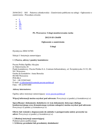 28/04/2012 S83 Państwa członkowskie - Zamówienie publiczne na usługi - Ogłoszenie o zamówieniu - Procedura otwarta • • • • • I. II. III. IV. VI. PL-Warszawa: Usługi monitorowania ruchu 2012/S 83-136458 Ogłoszenie o zamówieniu Usługi Dyrektywa 2004/18/WE Sekcja I: Instytucja zamawiająca I.1)Nazwa, adresy i punkty kontaktowe Poczta Polska Spółka Akcyjna ul. Rakowiecka 26 Punkt kontaktowy: Poczta Polska S.A. Centrum Infrastruktury, ul. Świętokrzyska 31/33, 00941 Warszawa Osoba do kontaktów: Anna Borecka 00-940 Warszawa POLSKA Tel.: +48 225053442 E-mail: [email protected] Faks: +48 225053480 Adresy internetowe: Ogólny adres instytucji zamawiającej: www.poczta-polska.pl Więcej informacji można uzyskać pod adresem: Powyższy(-e) punkt(-y) kontaktowy(-e) Specyfikacje i dokumenty dodatkowe (w tym dokumenty dotyczące dialogu konkurencyjnego oraz dynamicznego systemu zakupów) można uzyskać pod adresem: Powyższy(-e) punkt(-y) kontaktowy(-e) Oferty lub wnioski o dopuszczenie do udziału w postępowaniu należy przesyłać na adres: Powyższy(-e) punkt(-y) kontaktowy(-e) I.2)Rodzaj instytucji zamawiającej Podmiot prawa publicznego I.3)Główny przedmiot lub przedmioty działalności Inny: usługi pocztowe I.4)Udzielenie zamówienia w imieniu innych instytucji zamawiających Instytucja zamawiająca dokonuje zakupu w imieniu innych instytucji zamawiających: nie Sekcja II: Przedmiot zamówienia II.1)Opis II.1.1)Nazwa nadana zamówieniu przez instytucję zamawiającą: Usługa lokalizacji i monitorowania pojazdów samochodowych za pomocą urządzeń systemu GPS z bezpośrednią transmisją danych w oparciu o wykonany i wdrożony przez Wykonawcę Moduł raportowania i rozliczeń eksploatacyjnych. II.1.2)Rodzaj zamówienia oraz lokalizacja robót budowlanych, miejsce realizacji dostawy lub świadczenia usług Usługi Kategoria usług: nr 5: Usługi telekomunikacyjne Kod NUTS PL II.1.3)Informacje na temat zamówienia publicznego, umowy ramowej lub dynamicznego systemu zakupów (DSZ) Ogłoszenie dotyczy zawarcia umowy ramowej II.1.4)Informacje na temat umowy ramowej II.1.5)Krótki opis zamówienia lub zakupu Przedmiotem zamówienia jest świadczenie w jednostkach organizacyjnych Zamawiającego usługi lokalizacji i monitorowania pojazdów samochodowych za pomocą urządzeń systemu GPS z bezpośrednią transmisją danych w oparciu o wdrożony przez Wykonawcę Moduł raportowania i rozliczeń eksploatacyjnych wraz z jego dokumentacją. Przedmiot zamówienia obejmuje w szczególności: 1) zamontowanie zestawów urządzeń w 4 750 pojazdach wskazanych przez Zamawiającego. W trakcie trwania Umowy wszystkie zestawy urządzeń są własnością Wykonawcy. Po zakończeniu Umowy zestawy urządzeń przechodzą na własność Zamawiającego. 2) uruchomienie i udostępnienie oraz utrzymanie przez Wykonawcę przez okres 48 miesięcy, Systemu przesyłania wszystkich danych z urządzeń zamontowanych w pojazdach, na serwer Wykonawcy, ich przechowywanie oraz udostępnianie Zamawiającemu danych skonfigurowanych zgodnie z wymaganiami Zamawiającego, poprzez szyfrowane z wykorzystaniem certyfikatu 256 bitowego wystawionego przez uprawniony urząd certyfikujący połączenie internetowe. 3) przeszkolenie przed uruchomieniem Systemu na warunkach i w terminach uzgodnionych z Zamawiającym: a) do 400 pracowników Zamawiającego pełniących funkcję użytkownika w zakresie obsługi Systemu, b) 25 pracowników Zamawiającego pełniących funkcje administratorów i trenerów, w zakresie obsługi Systemu i administracji Systemem. 4) opracowanie i przekazanie Zamawiającemu przed uruchomieniem Systemu: a) instrukcji użytkowania dla każdego zamontowanego w pojeździe urządzenia lub zestawu urządzeń, b) podręcznika użytkowania Systemu w liczbie 400 szt. w wersji papierowej oraz elektronicznej, c) podręcznika administratora Systemu w liczbie 25 szt. w wersji papierowej oraz elektronicznej, d) pełnej dokumentacji technicznej umożliwiającej właściwą, zgodną z przeznaczeniem instalację, konfigurację i eksploatację systemu w pełnym zakresie jego funkcjonalności umożliwiającą samodzielną eksploatację systemu przez Zamawiającego, e) dokumentacji bezpieczeństwa tj.: polityka bezpieczeństwa systemu i procedury bezpiecznej eksploatacji. 5) dokonanie przez Wykonawcę demontażu/montażu (na jego koszt) zestawów urządzeń z pojazdu pracującego w Systemie na inny pojazd (np. w przypadku awarii pojazdu, jego eliminacji). Liczba tego typu operacji nie będzie większa niż 3000 w całym okresie obowiązywania Umowy, 6) przeprowadzenie przez Wykonawcę przeglądów konserwacyjnych i gwarancyjnych zestawów urządzeń, zgodnie z wymaganiami producenta, nie rzadziej, niż co 6 miesięcy, 7) uruchomienie przez Wykonawcę zgodnie z Harmonogramem w infrastrukturze teleinformatycznej Zamawiającego i na jego serwerach oprogramowania zawierającego dane wolnozmienne (serwera map) z automatyczną aktualizacją. 3. Wykonawca zobowiązuje się do zainstalowania Modułu raportowania i rozliczeń eksploatacyjnych na serwerach Zamawiającego, przeniesienia danych gromadzonych od dnia uruchomienia Systemu oraz jego aktualizację do końca obowiązywania Umowy oraz przekazania dokumentacji tego Modułu i udzielenia licencji na korzystanie z Modułu i dokumentacji. 4. W przypadku podjęcia decyzji o zakupie Modułu lokalizacji pojazdów wraz z rejestrowaniem zdarzeń, Wykonawca na pisemne żądanie złożone przez Zamawiającego w terminie określonym w Harmonogramie, zobowiązuje się do jego zainstalowania, skonfigurowania i uruchomienia na serwerach Zamawiającego oraz udzielenia licencji na korzystanie z tego Modułu. W skład Modułu wchodzą oprogramowanie i niezbędne urządzenia wspomagające, zgodnie ze specyfikacją Systemu. Moduł powinien współpracować z Modułem raportowania i rozliczeń eksploatacyjnych. Nie skorzystanie przez Zamawiającego z powyższego uprawnienia nie może sta