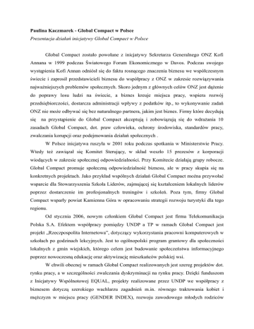 Paulina Kaczmarek - Global Compact w Polsce Prezentacja działań inicjatywy Global Compact w Polsce Global Compact zostało powołane z inicjatywy Sekretarza Generalnego ONZ Kofi Annana w 1999 podczas Światowego Forum Ekonomicznego w Davos. Podczas swojego wystąpienia Kofi Annan odniósł się do faktu rosnącego znaczenia biznesu we współczesnym świecie i zaprosił przedstawicieli biznesu do współpracy z ONZ w zakresie rozwiązywania najważniejszych problemów społecznych. Skoro jednym z głównych celów ONZ jest dążenie do poprawy losu ludzi na świecie, a biznes kreuje miejsca pracy, wspiera rozwój przedsiębiorczości, dostarcza administracji wpływy z podatków itp., to wykonywanie zadań ONZ nie może odbywać się bez naturalnego partnera, jakim jest biznes. Firmy które decydują się na przystąpienie do Global Compact akceptują i zobowiązują się do wdrażania 10 zasadach Global Compact, dot. praw człowieka, ochrony środowiska, standardów pracy, zwalczania korupcji oraz podejmowania działań społecznych . W Polsce inicjatywa ruszyła w 2001 roku podczas spotkania w Ministerstwie Pracy. Wtedy też zawiązał się Komitet Sterujący, w skład weszło 15 prezesów z korporacji wiodących w zakresie społecznej odpowiedzialności. Przy Komitecie działają grupy robocze. Global Compact promuje społeczną odpowiedzialność biznesu, ale w pracy skupia się na konkretnych projektach. Jako przykład wspólnych działań Global Compact można przywołać wsparcie dla Stowarzyszenia Szkoła Liderów, zajmującej się kształceniem lokalnych liderów poprzez dostarczenie im profesjonalnych treningów i szkoleń. Poza tym, firmy Global Compact wsparły powiat Kamienna Góra w opracowaniu strategii rozwoju turystyki dla tego regionu. Od stycznia 2006, nowym członkiem Global Compact jest firma Telekomunikacja Polska S.A. Efektem współpracy pomiędzy UNDP a TP w ramach Global Compact jest projekt „Rzeczpospolita Internetowa”, dotyczący wykorzystania pracowni komputerowych w szkołach po godzinach lekcyjnych. Jest to ogólnopolski program grantowy dla społeczności lokalnych z gmin wiejskich, którego celem jest budowanie społeczeństwa informacyjnego poprzez nowoczesną edukację oraz aktywizację mieszkańców polskiej wsi. W chwili obecnej w ramach Global Compact realizowanych jest szereg projektów dot. rynku pracy, a w szczególności zwalczania dyskryminacji na rynku pracy. Dzięki funduszom z Inicjatywy Wspólnotowej EQUAL, projekty realizowane przez UNDP we współpracy z biznesem dotyczą szerokiego wachlarzu zagadnień m.in. równego traktowania kobiet i mężczyzn w miejscu pracy (GENDER INDEX), rozwoju zawodowego młodych rodziców (RODZIC-PRACOWNIK), rozwoju elastycznych form zatrudniania (ELASTAN). Ponadto UNDP wraz z partnerami pracuje nad stałym zwiększaniem zatrudnienia osób niepełnosprawnych fizycznie, ale sprawnych intelektualnie (MISARN) oraz dorosłych osób z autyzmem (RAIN MAN). Szczególnie ciekawy jest projekt Gender Index w ramach którego prowadzony jest pierwszy w Polsce konkurs na firmę równych szans oraz Przewodnik Dobrych Praktyk z zakresu równości kobiet i mężczyzn w miejscu pracy. W ramach tych i innych projektów, Global Compact służy jako platforma współdziałania biznesu innych aktorów na rzecz rozwiązania konkretnych problemów.