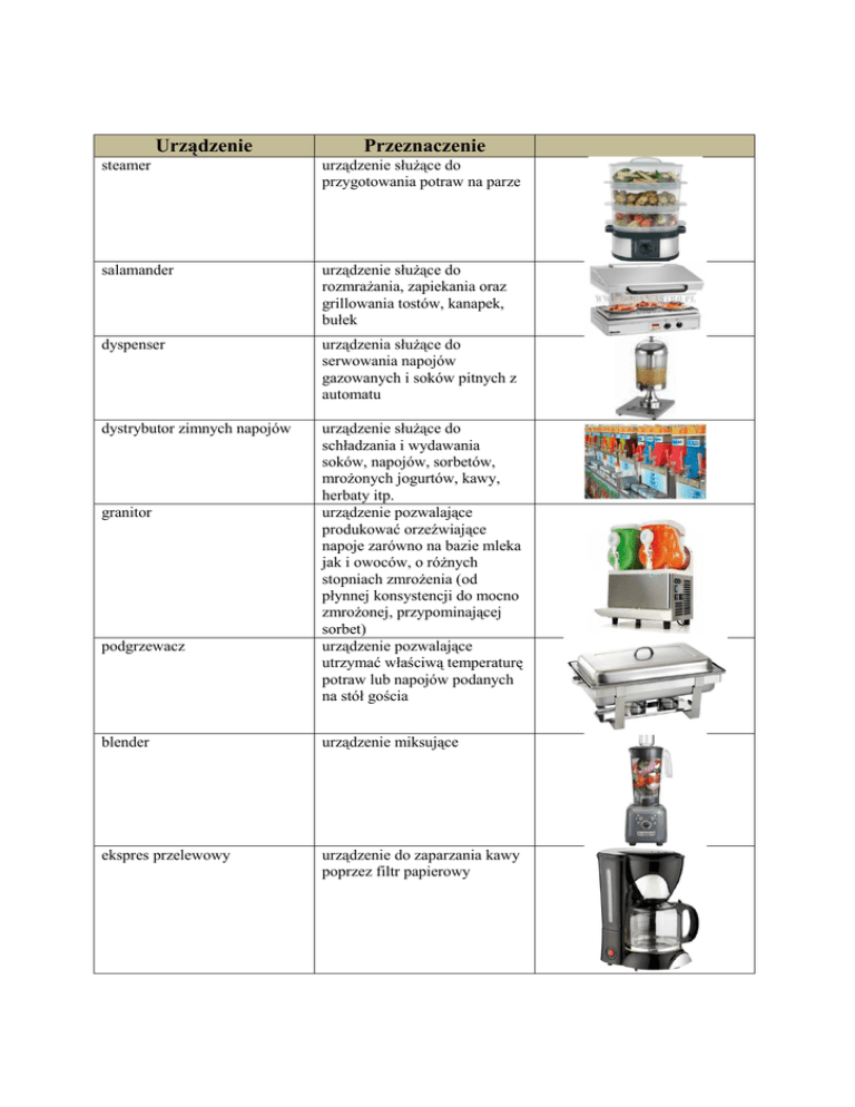 Urządzenie Przeznaczenie steamer urządzenie służące do przygotowania potraw na parze salamander urządzenie służące do rozmrażania, zapiekania oraz grillowania tostów, kanapek, bułek dyspenser urządzenia służące do serwowania napojów gazowanych i soków pitnych z automatu dystrybutor zimnych napojów urządzenie służące do schładzania i wydawania soków, napojów, sorbetów, mrożonych jogurtów, kawy, herbaty itp. urządzenie pozwalające produkować orzeźwiające napoje zarówno na bazie mleka jak i owoców, o różnych stopniach zmrożenia (od płynnej konsystencji do mocno zmrożonej, przypominającej sorbet) urządzenie pozwalające utrzymać właściwą temperaturę potraw lub napojów podanych na stół gościa granitor podgrzewacz blender urządzenie miksujące ekspres przelewowy urządzenie do zaparzania kawy poprzez filtr papierowy ekspres kolbowy ekspres ciśnieniowy perkolator urządzenie do zaparzania kawy wyposażone w ręcznie obsługiwany uchwyt (kolbę) z sitkiem; na takie sitko aplikuje się zmieloną kawę, ubija i montuje do urządzenia; po każdorazowym zaparzeniu kawy sitko należy opróżnić z fusów i wyczyścić urządzenie, w którym woda o temperaturze 95– 98°C przy jednoczesnym wysokim ciśnieniu i napowietrzeniu jednokrotnie przepuszczana jest przez zmieloną kawę; zastosowana metoda filtracyjna zapewnia doskonałą ekstrakcję kawy, wyługowanie olejków eterycznych i utworzenie kremowej pianki (cremy) na powierzchni kawy. urządzenia do zaparzania kawy zbożowej, herbaty i ziół; urządzenie to wykorzystuje system perkolacji (otrzymanie wyciągu przez przepuszczanie płynu przez substancję) warnik zaparzacz do wody, urządzenie wykorzystywane do przygotowywania gorących napojów podgrzewacz do czekolady urządzenie do podgrzewania i serwowania gorącej czekolady bemar urządzenie do przechowywania gotowych dań w temp. 70–75°C np. do podania kiełbasek na gorąco w serwisie bufetowym kociołek urządzenie do przechowywania gorących dań wózek kelnerski może posiadać dwie lub trzy półki; jest to urządzenie przystosowane do transportu i dystrybucji dużej ilości potraw podgrzewacze do talerzy urządzenie do podgrzewania i utrzymywania w cieple talerzy griddle grill urządzenie zbudowane z dwóch płyt z wmontowanymi grzałkami elektrycznymi między którymi umieszcza się element do smażenia beztłuszczowego lekki i łatwo rozkładany stojak pod tacę tray jack