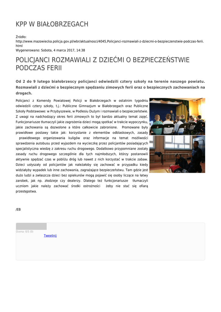 KPP W BIAŁOBRZEGACH Źródło: http://www.mazowiecka.policja.gov.pl/wbr/aktualnosci/4045,Policjanci-rozmawiali-z-dziecmi-o-bezpieczenstwie-podczas-ferii. html Wygenerowano: Sobota, 4 marca 2017, 14:38 POLICJANCI ROZMAWIALI Z DZIEĆMI O BEZPIECZEŃSTWIE PODCZAS FERII Od 2 do 9 lutego białobrzescy policjanci odwiedzili cztery szkoły na terenie naszego powiatu. Rozmawiali z dziećmi o bezpiecznym spędzaniu zimowych ferii oraz o bezpiecznych zachowaniach na drogach. Policjanci z Komendy Powiatowej Policji w Białobrzegach w ostatnim tygodniu odwiedzili cztery szkoły, t.j.: Publiczne Gimnazjum w Białobrzegach oraz Publiczne Szkoły Podstawowe: w Przybyszewie, w Podlesiu Dużym i rozmawiali o bezpieczeństwie. Z uwagi na nadchodzący okres ferii zimowych to był bardzo aktualny temat zajęć. Funkcjonariusze tłumaczyli jakie zagrożenia dzieci mogą spotkać w trakcie wypoczynku, jakie zachowania są dozwolone a które całkowicie zabronione. Promowane były prawidłowe postawy takie jak: korzystanie z elementów odblaskowych, zasady prawidłowego organizowania kuligów oraz informacje na temat możliwości sprawdzenia autobusu przed wyjazdem na wycieczkę przez policjantów posiadających specjalistyczna wiedzę z zakresu ruchu drogowego. Dodatkowo przypomniane zostały zasady ruchu drogowego szczególnie dla tych najmłodszych, którzy postanowili aktywnie spędzać czas w pobliżu dróg lub nawet z nich korzystać w trakcie zabaw. Dzieci usłyszały od policjantów jak należałoby się zachować w przypadku kiedy widziałyby wypadek lub inne zachowania, zagrażające bezpieczeństwu. Tam gdzie jest dużo ludzi a zwłaszcza dzieci bez opiekunów mogą pojawić się osoby liczące na łatwy zarobek, jak np. złodzieje czy dealerzy. Dlatego też funkcjonariusze uczniom jakie należy zachować środki ostrożności przestępstwa. /EB Ocena: 0/5 (0) Tweetnij tłumaczyli żeby nie stać się ofiarą