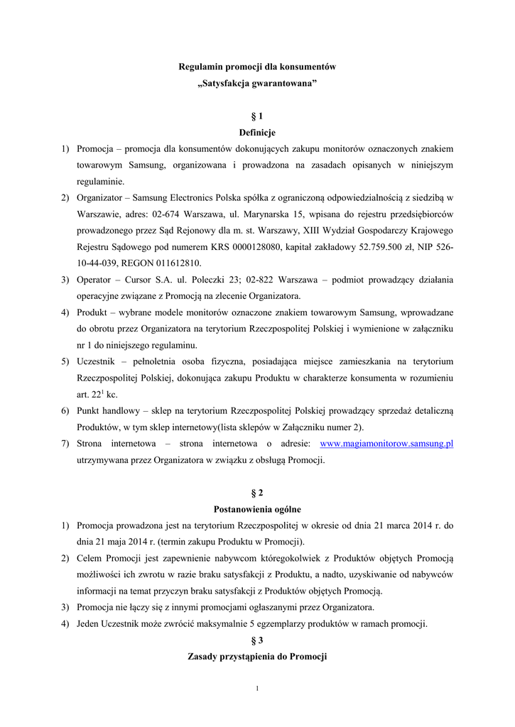 Regulamin promocji dla konsumentów „Satysfakcja gwarantowana” §1 Definicje 1) Promocja – promocja dla konsumentów dokonujących zakupu monitorów oznaczonych znakiem towarowym Samsung, organizowana i prowadzona na zasadach opisanych w niniejszym regulaminie. 2) Organizator – Samsung Electronics Polska spółka z ograniczoną odpowiedzialnością z siedzibą w Warszawie, adres: 02-674 Warszawa, ul. Marynarska 15, wpisana do rejestru przedsiębiorców prowadzonego przez Sąd Rejonowy dla m. st. Warszawy, XIII Wydział Gospodarczy Krajowego Rejestru Sądowego pod numerem KRS 0000128080, kapitał zakładowy 52.759.500 zł, NIP 52610-44-039, REGON 011612810. 3) Operator – Cursor S.A. ul. Poleczki 23; 02-822 Warszawa – podmiot prowadzący działania operacyjne związane z Promocją na zlecenie Organizatora. 4) Produkt – wybrane modele monitorów oznaczone znakiem towarowym Samsung, wprowadzane do obrotu przez Organizatora na terytorium Rzeczpospolitej Polskiej i wymienione w załączniku nr 1 do niniejszego regulaminu. 5) Uczestnik – pełnoletnia osoba fizyczna, posiadająca miejsce zamieszkania na terytorium Rzeczpospolitej Polskiej, dokonująca zakupu Produktu w charakterze konsumenta w rozumieniu art. 221 kc. 6) Punkt handlowy – sklep na terytorium Rzeczpospolitej Polskiej prowadzący sprzedaż detaliczną Produktów, w tym sklep internetowy(lista sklepów w Załączniku numer 2). 7) Strona internetowa – strona internetowa o adresie: www.magiamonitorow.samsung.pl utrzymywana przez Organizatora w związku z obsługą Promocji. §2 Postanowienia ogólne 1) Promocja prowadzona jest na terytorium Rzeczpospolitej w okresie od dnia 21 marca 2014 r. do dnia 21 maja 2014 r. (termin zakupu Produktu w Promocji). 2) Celem Promocji jest zapewnienie nabywcom któregokolwiek z Produktów objętych Promocją możliwości ich zwrotu w razie braku satysfakcji z Produktu, a nadto, uzyskiwanie od nabywców informacji na temat przyczyn braku satysfakcji z Produktów objętych Promocją. 3) Promocja nie łączy się z innymi promocjami ogłaszanymi przez Organizatora. 4) Jeden Uczestnik może zwrócić maksymalnie 5 egzemplarzy produktów w ramach promocji. §3 Zasady przystąpienia do Promocji 1 1) Warunkiem koniecznym udziału w Promocji jest zakup przez Uczestnika w sprzedaży detalicznej w Punkcie Handlowym w okresie trwania Promocji jednego z Produktów objętych Promocją, oraz spełnienie pozostałych warunków Promocji określonych w niniejszym Regulaminie. 2) Z zastrzeżeniem dalszych Postanowień Regulaminu, Organizator przyznaje Uczestnikowi Promocji, który w Okresie trwania Promocji kupi jeden z Produktów objętych Promocją, prawo do zwrotu Produktu objętego Promocją w terminie 30 dni kalendarzowych od daty jego zakupu i otrzymania równowartości ceny brutto tego Produktu wskazanego w dowodzie zakupu – w razie braku satysfakcji z tego produktu.. 3) W celu przystąpienia do Promocji, Uczestnik Promocji zobowiązany jest: a) wypełnić w całości formularz zamieszczony na Stronie Internetowej www.magiamonitorow.samsung.pl (dalej: „Formularz”) i wysłać za pośrednictwem tej strony prawidłowo wypełniony Formularz, zawierający prawdziwe i aktualne dane Uczestnika, wraz ze scanem lub zdjęciem dowodu zakupu Produktu objętego Promocją (dalej: „Zgłoszenie”). W Formularzu należy (i) podać dane osobowe Uczestnika (imię, nazwisko, adres) (ii) wskazać zakupiony Produkt objęty Promocją oraz miejsce zakupu, a także opisać przyczyny zwrotu Produktu objętego Promocją, z zastrzeżeniem punktu 5 §4 poniżej. Dodatkowo, do Formularza Uczestnik powinien załączyć scan lub zdjęcie dowodu zakupu Produktu objętego Promocją wraz z wymienionym na tym dowodzie zakupu modelem Produktu objętego Promocją. b) potwierdzić w Formularzu zapoznanie się i akceptację Regulaminu oraz złożyć oświadczenie o wyrażeniu zgody, o której mowa w punkcie 3 § 6 Regulaminu. 4) Udział w Promocji biorą tylko poprawne i w całości wypełnione Formularze, tj. Formularze, które spełniają wymagania wskazane w Regulaminie. §4 Zasady zwrotu Produktu objętego Promocją oraz zwrotu równowartości ceny brutto tego Produktu 1) W przypadku spełnienia przez Uczestnika powyższych warunków przystąpienia do Promocji, Uczestnik może dokonać zwrotu Produktu objętego Promocją i uzyskać zwrot równowartości ceny brutto uiszczonej za ten Produkt, pod warunkiem, że: a) Produkt objęty Promocją jest sprawny (bez fizycznych uszkodzeń) i kompletny (posiada w momencie jego zwrotu te same elementy wewnętrzne i zewnętrzne, które istniały przy jego zakupie), b) Produkt objęty Promocją nie posiada widocznych, zewnętrznych uszkodzeń lub zarysowań, c) wraz z Produktem objętym Promocją zostaną przez Uczestnika zwrócone dodatkowe akcesoria związane z danym Produktem objętym Promocją oraz dokumenty dotyczące tego 2 produktu (karta gwarancyjna, instrukcja obsługi, dowód zakupu), które Uczestnik otrzymał przy zakupie Produktu objętego Promocją. 2) W przypadku spełnienia przez Uczestnika warunków określonych w Regulaminie, w terminie 10 dni kalendarzowych od daty Zgłoszenia Operator skontaktuje się z Uczestnikiem, za pomocą wiadomości wysłanej na adres e-mail (podany przez Uczestnika w Zgłoszeniu) w celu potwierdzenia zgłoszenia. 3) W celu uzyskania zwrotu równowartości ceny brutto zakupionego Produktu, Uczestnik powinien: a) Zwrócić produkt w Punkcie Handlowym, w którym dokonał zakupu Produktu objętego promocją z Produktem opisanym w pkt. 1 § 4, a w przypadku zakupu dokonanego w sklepie internetowym wymienionym w załączniku nr 2 do Regulaminu dokonać zwrotu towaru na swój koszt w sposób i na adres wskazany w regulaminie danego sklepu internetowego. b) Do zwracanego produktu dołączyć: - dowód zakupu potwierdzający dokonanie zakupu Produktu objętego promocją, który był dołączony w formie skanu bądź zdjęcia do zgłoszenia zarejest