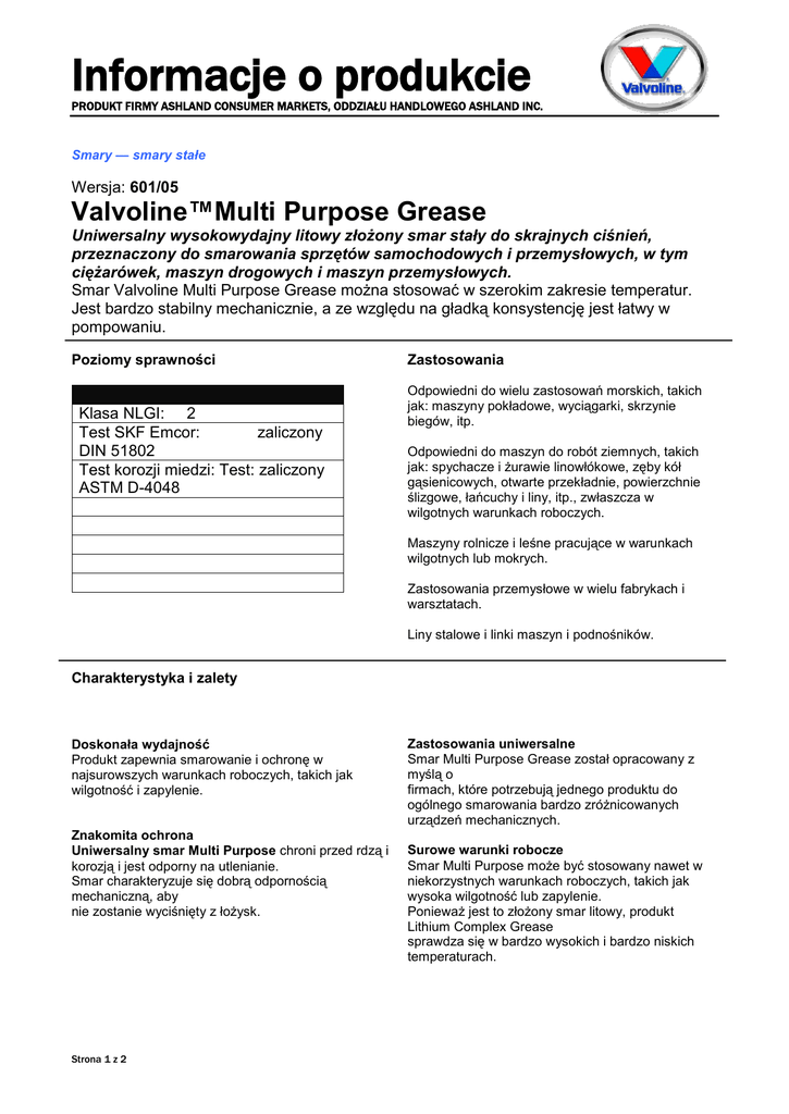 Informacje o produkcie PRODUKT FIRMY ASHLAND CONSUMER MARKETS, ODDZIAŁU HANDLOWEGO ASHLAND INC. Smary — smary stałe Wersja: 601/05 Valvoline™Multi Purpose Grease Uniwersalny wysokowydajny litowy złożony smar stały do skrajnych ciśnień, przeznaczony do smarowania sprzętów samochodowych i przemysłowych, w tym ciężarówek, maszyn drogowych i maszyn przemysłowych. Smar Valvoline Multi Purpose Grease można stosować w szerokim zakresie temperatur. Jest bardzo stabilny mechanicznie, a ze względu na gładką konsystencję jest łatwy w pompowaniu. Poziomy sprawności Klasa NLGI: 2 Test SKF Emcor: zaliczony DIN 51802 Test korozji miedzi: Test: zaliczony ASTM D-4048 Zastosowania Odpowiedni do wielu zastosowań morskich, takich jak: maszyny pokładowe, wyciągarki, skrzynie biegów, itp. Odpowiedni do maszyn do robót ziemnych, takich jak: spychacze i żurawie linowłókowe, zęby kół gąsienicowych, otwarte przekładnie, powierzchnie ślizgowe, łańcuchy i liny, itp., zwłaszcza w wilgotnych warunkach roboczych. Maszyny rolnicze i leśne pracujące w warunkach wilgotnych lub mokrych. Zastosowania przemysłowe w wielu fabrykach i warsztatach. Liny stalowe i linki maszyn i podnośników. Charakterystyka i zalety Doskonała wydajność Produkt zapewnia smarowanie i ochronę w najsurowszych warunkach roboczych, takich jak wilgotność i zapylenie. Znakomita ochrona Uniwersalny smar Multi Purpose chroni przed rdzą i korozją i jest odporny na utlenianie. Smar charakteryzuje się dobrą odpornością mechaniczną, aby nie zostanie wyciśnięty z łożysk. Strona 1 z 2 Zastosowania uniwersalne Smar Multi Purpose Grease został opracowany z myślą o firmach, które potrzebują jednego produktu do ogólnego smarowania bardzo zróżnicowanych urządzeń mechanicznych. Surowe warunki robocze Smar Multi Purpose może być stosowany nawet w niekorzystnych warunkach roboczych, takich jak wysoka wilgotność lub zapylenie. Ponieważ jest to złożony smar litowy, produkt Lithium Complex Grease sprawdza się w bardzo wysokich i bardzo niskich temperaturach. Informacje o produkcie PRODUKT FIRMY ASHLAND CONSUMER MARKETS, ODDZIAŁU HANDLOWEGO ASHLAND INC. Bezpieczeństwo People Who Know, Use Valvoline™ Niniejszy produkt prawdopodobnie nie stwarza znaczącego zagrożenia dla zdrowia lub bezpieczeństwa, o ile jest używany prawidłowo w odpowiednim zastosowaniu. Kartę charakterystyki (MSDS) można uzyskać na życzenie od lokalnego dystrybutora lub pobrać ją z witryny pod adresem http://msds.ashland.com Działając w ponad 100 krajach na całym świecie, firma Valvoline to wiodący sprzedawca, dystrybutor i producent wysokiej jakości produktów i usług samochodowych i przemysłowych. Do produktów tej firmy należą smary samochodowe, m. in. MaxLife™ — pierwszy olej silnikowy o formule przeznaczonej specjalnie do pojazdów o wyższym przebiegu; płyny przekładniowe, oleje przekładniowe, smary hydrauliczne, chemikalia motoryzacyjne, produkty specjalne; smary oraz produkty do układu chłodzenia. Ochrona środowiska Zużyty olej i smar należy oddawać do odpowiedniego punktu zbiórki. Nie spuszczać do ścieków, gleby lub cieków wodnych. Aby uzyskać więcej informacji na temat produktów i usług firmy Valvoline, odwiedź www.valvolineeurope.com Charakterystyczne właściwości Charakterystyka typowych właściwości jest oparta na aktualnie produkowanym preparacie. W przyszłości produkcja będzie zgodna ze specyfikacjami Valvoline™, natomiast mogą wystąpić zmiany tej charakterystyki. Autor: AdG Zastępuje - 601/04 Smar stały Multi Purpose Klasa NLGI Mydlany Penetracja po ugniataniu, 25ºC. ASTM D-217 2 Lepkość oleju, mm /s w temperaturze 40ºC. ASTM D-445 2 Lepkość oleju, mm /s w temperaturze 100ºC. ASTM D-445 Temperatura kroplenia ºC ASTM D-566 Temperatura nanoszenia ºC. Kolor Konsystencja Ciężar właściwy w temperaturze 15.6°C. 2 Złożony litowy 265-295 160 15.5 300 -20 do + 180 Czerwony Gładka/lepka 0.950 Niniejsze informacje dotyczą wyłącznie produktów wytwarzanych w następujących lokalizacjach: Europa *Znak towarowy będący własnością osoby trzeciej ™ Znak towarowy Ashland lub przedsiębiorstw zależnych, zarejestrowany w różnych krajach © 2011, Ashland Uważa się, że wszelkie informacje oraz dane przedstawione w niniejszym dokumencie są dokładne i wiarygodne, ale nie mogą być traktowane jako gwarancja, gwarancja wyraźna lub dorozumiana, gwarancja przydatności handlowej lub przydatności do określonego celu, lub reprezentacja, wyraźna lub dorozumiana, za którą Ashland Inc. i jej spółki zależne ponoszą odpowiedzialność prawną. Strona 2 z 2