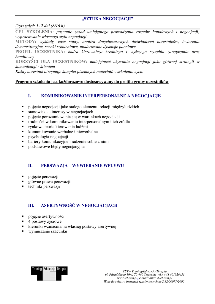 „SZTUKA NEGOCJACJI” Czas zajęć: 1- 2 dni (8/16 h) CEL SZKOLENIA: poznanie zasad umiejętnego prowadzenia rozmów handlowych i negocjacji; wypracowanie własnego stylu negocjacji METODY: wykłady, case study, analiza dotychczasowych doświadczeń uczestników, ćwiczenia demonstracyjne, scenki szkoleniowe, moderowane dyskusje panelowe PROFIL UCZESTNIKA: kadra kierownicza średniego i wyższego szczebla zarządzania oraz handlowcy KORZYŚCI DLA UCZESTNIKÓW: umiejętność używania negocjacji jako głównej strategii w komunikacji z klientem Każdy uczestnik otrzymuje komplet pisemnych materiałów szkoleniowych. Program szkolenia jest każdorazowo dostosowywany do profilu grupy uczestników I. pojęcie negocjacji jako stałego elementu relacji międzyludzkich stanowiska a interesy w negocjacjach pojęcie porozumiewania się w warunkach negocjacji trudności w komunikowaniu interpersonalnym i ich źródła rynkowa teoria kierowania ludźmi komunikowanie werbalne i niewerbalne psychologia negocjacji bariery komunikacyjne i radzenie sobie z nimi podstawowe błędy negocjacyjne II. PERSWAZJA – WYWIERANIE WPŁYWU pojęcie perswazji główne prawa perswazji techniki perswazji III. KOMUNIKOWANIE INTERPERSONALNE A NEGOCJACJE ASERTYWNOŚĆ W NEGOCJACJACH pojęcie asertywności 4 postawy życiowe kierunki wzmacniania własnej postawy asertywnej wymuszanie szacunku TET – Trening-Edukacja-Terapia ul. Piłsudskiego 19/4, 70-460 Szczecin; tel.: +48 601926431 www.tet.com.pl; e-mail: [email protected] Wpis do rejestru instytucji szkoleniowych nr 2.32/00071/2006 IV. NEGOCJACJE A KONFLIKT pojęcie konfliktu interpersonalnego źródła konfliktów góra lodowa konfliktu 8 ścieżek rozwiązywania konfliktów interpersonalnych konflikt przy stole negocjacyjnym V. TRUDNE SYTUACJE W NEGOCJACJACH techniki manipulacji i obrona przed nimi pojęcie stresu; mechanizm powstawania stresu opanowanie emocji i gniewu techniki rozwiązywania trudnych sytuacji „trudni” ludzie VI. TRENING EFEKTYWNYCH NEGOCJACJI przygotowanie do negocjacji wybór właściwej strategii negocjacyjnej procedury otwarcia negocjacji style negocjacji przezwyciężanie konfliktu w negocjacjach taktyki negocjacji triki negocjacyjne analiza indywidualnego stylu negocjacji TET – Trening-Edukacja-Terapia ul. Piłsudskiego 19/4, 70-460 Szczecin; tel.: +48 601926431 www.tet.com.pl; e-mail: [email protected] Wpis do rejestru instytucji szkoleniowych nr 2.32/00071/2006