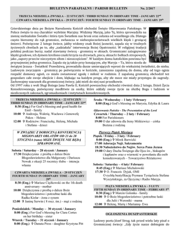 BIULETYN PARAFIALNY / PARISH BULLETIN No. 2/2017 TRZECIA NIEDZIELA ZWYKŁA – 22 STYCZEŃ / THIRD SUNDAY IN ORDINARY TIME - JANUARY 22nd CZWARTA NIEDZIELA ZWYKŁA – 29 STYCZEŃ / FOURTH SUNDAY IN ORDINARY TIME – JANUARY 29th Czterdziestego dnia po Bożym Narodzeniu Kościół obchodzi Święto Ofiarowania Pańskiego. W Polsce święto to ma charakter wybitnie Maryjny. Widzimy Maryję, jako Tę, która sprowadziła na ziemię niebiańskie Światło i która tym Światłem nas broni oraz osłania od wszelkiego zła. Dlatego często bierzemy do rąk gromnice, zwłaszcza w niebezpieczeństwach wielkich klęsk i grożącej śmierci. Poświęcone 2 lutego świece, jakby widomy znak Bożej Jasności, zapala się w trudnych życiowych chwilach po to, aby „zadziałała” interwencja Bożej Opatrzności. W religijnej tradycji polskiej podczas burzy, nadal stawiamy świecę - gromnicę w oknach. Gromnicami zażegnywano klęski gradowe, ich dymem kreślono znaki krzyża na drzwiach, piecu, oknach i belkach stropowych, jako „zapory przeciw nieczystym siłom i nieszczęściom”. W każdym domu katolickim powinna być przynajmniej jedna gromnica. Zapala się ją także przy konającym, aby Maryja – Ta, która niosła do świątyni Jezusa - Światłość Prawdziwą, prowadziła dusze umierających wprost do wiekuistej światłości, do nieba. Ludowym zwyczajem - gromnicę po poświęceniu w kościele, zanoszono zapaloną do domu, aby od tego ognia rozpalić domowy ogień, co miało zwiastować zgodę i miłość w rodzinie. Z zapaloną gromnicą obchodził też gospodarz całe swoje obejście i dom, klękając na każdym progu, aby złe moce nie miały przystępu do zagrody. Zachowajmy szacunek dla gromnicznej świecy, jaki mieli do niej nasi przodkowie. Od 1997 roku z woli Sługi Bożego Jana Pawła II, Kościół powszechny obchodzi również dnia 2 lutego, Dzień Życia Konsekrowanego, poświęcony modlitwie za osoby, które oddały swoje życie na służbę Bogu i ludziom w niezliczonych zakonach, zgromadzeniach i instytutach konsekrowanych. TRZECIA NIEDZIELA ZWYKŁA – 22 STYCZEŃ THIRD SUNDAY IN ORDINARY TIME – JANUARY 22nd 8:30 (Eng.) For God’s blessing and good health for Emil - family 10:00 Andrzeja, Walerię, Wacława i Genowefę Pakos – Helena 12:00 Rodziców: Franciszkę, Helenę, Michała i Stefana - dzieci W ZWIĄZKU Z DOROCZNĄ KONFERENCJĄ MISJONARZY OBLATÓW OD 23 do 28 STYCZNIA (rano) MSZE ŚWIĘTE NIE BĘDĄ SPRAWOWANE. Sobota / Saturday – 28 styczeń / January 17:30 Dziękczynna z prośbą o dalsze Boże Błogosławieństwo dla Małgorzaty i Dariusza Nowak z okazji 25 rocznicy ślubu – intencja własna CZWARTA NIEDZIELA ZWYKŁA – 29 STYCZEŃ FOURTH SUNDAY IN ORDINARY TIME – JANUARY 29th 8:30 (Eng.) Mariusz Ciężkowski on the 1th death anniversary - mother 10:00 Dziękczynna z prośbą o dalsze Boże błogosławieństwo i potrzebne łaski dla Radka Kielar - żona z synem 12:00 Janinę Serwin ( 8 rocz. śm.) - mąż z rodziną Poniedziałek / Monday – 30 styczeń / January 8:00 (Eng.) For God’s blessing for Clara Cortes on her birthday - sister Wtorek / Tuesday – 31 styczeń / January 8:00 (Eng.) Danuta Press - daughter Krystyna Pitt Środa / Wednesday – 1 luty/ February 8:00 (Eng.) God’s blessing on Marysia, Edytka & Laura Ofiarowanie Pańskie - The Presentation of the Lord Czwartek / Thursday – 2 luty / February 8:00 For Parishioners 19:00 O dar zdrowia dla Ireny Miśkiewicz – córka Bożena z rodziną Pierwszy Piątek Miesiąca Piątek / Friday – 3 luty / February 8:00 (Eng.) Mirek Barwicki 17:00 Adoracja Najś. Sakramentu 18:30 Nabożeństwo do Najśw. Serca Pana Jezusa 19:00 O dary Ducha Świętego dla Ojca św., biskupów i kapłanów oraz o wierność w powołaniu dla osób konsekrowanych – Towarzystwo Różańcowe Sobota / Saturday – 4 luty/ February 8:45 (Eng.) Mariusz Michalowski 17:30 O. Francois Dyjak, OMI O rychłą beatyfikację Prymasa Tysiąclecia Stefana Wyszyńskiego, za Ojczyznę i Radio Maryja. PIĄTA NIEDZIELA ZWYKŁA – 5 LUTY FIFTH SUNDAY IN ORDINARY TIME – FEBRUARY 5th 8:30 (Eng.) Marcin Golonka - family 10:00 O Boże błogosławieństwo i potrzebne łaski dla Julii i Weroniki - mama 12:00 Helenę, Marię i Mariannę- Ewa OGŁOSZENIA DUSZPASTERSKIE Ludowy poeta Józef Strug, tak przed wielu laty pisał o Gromnicznej świecy: „Gdy życie nasze dobiegnie do końca, Gdy Bóg ostatnie godziny policzy, Niech nam zaświeci, jak promienie słońca, Światło gromnicy. Gdy nasze czoło pot śmiertelny zrosi, Gdy nasze łoże obstąpią szatani, Twojej obrony niech każdy uprosi Gromniczna Pani! Kiedy nad nami zawisną czarne chmury, Gdy na wsze strony lecą błyskawice, Gdy ciemność straszna od dołu do góry: Święćmy gromnicę! Matko Najświętsza! My nędzni grzesznicy, Pod Twoją obronę się uciekamy, Przed Twym obrazem, przy świetle gromnicy, Ciebie błagamy! (…) Bądź nam Matką w życiu i przy zgonie, Niech Twoja łaska zawsze nam przyświeca, Niech nasza miłość ku Tobie zapłonie”. WSPOMNIENIE ŚW. BŁAŻEJA - 3 lutego Kościół obchodzi pamiątkę męczeństwa św. Błażeja. W tym dniu w czasie Mszy św. kapłan pobłogosławi świece ku czci św. Błażeja i udzieli nimi błogosławieństwa obecnym w świątyni wiernym, tradycyjnie dotykając gardła skrzyżowanymi świecami, zwane „Błażejkami” (w formie krzyża św. Andrzeja). ZESTAWY KOPERT NIEDZIELNYCH NA ROK 2017. W sali pod kościołem są do odebrania zestawy kopert niedzielnych na rok 2017. Osoby, które nie miały w roku 2016 swojego zestawu, proszę o zgłoszenie się do biura parafialnego. Proszę nie używać kopert z 2016 roku. POKWITOWANIA DO INCOME TAX - za rok 2016 będzie można odebrać w sali pod kościołem 12 i 19 lutego po Mszach Św. Bóg zapłać wszystkim ofiarodawcom. LEKTORZY – Nowy plan czytań jest gotowy do odebrania w zakrystii. PODZIĘKOWANIE – Naszą wdzięczność pragniemy wyrazić Komitetowi Impre