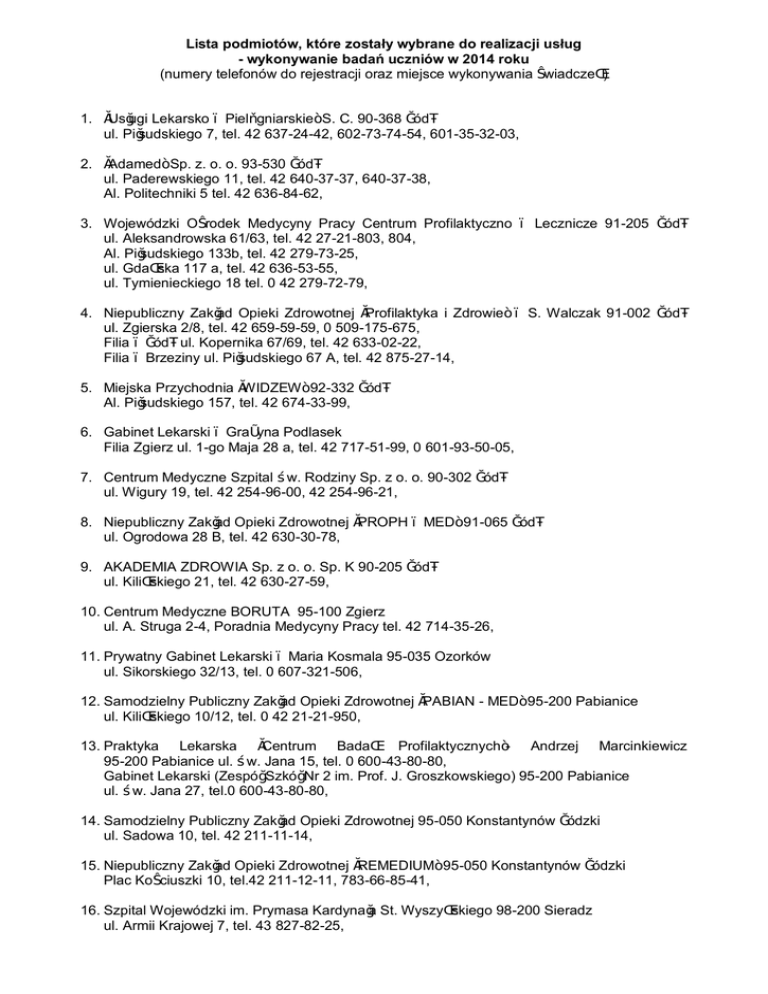 Lista podmiotów, które zostały wybrane do realizacji usług - wykonywanie badań uczniów w 2014 roku (numery telefonów do rejestracji oraz miejsce wykonywania świadczeń) 1. „Usługi Lekarsko – Pielęgniarskie” S. C. 90-368 Łódź ul. Piłsudskiego 7, tel. 42 637-24-42, 602-73-74-54, 601-35-32-03, 2. „Adamed” Sp. z. o. o. 93-530 Łódź ul. Paderewskiego 11, tel. 42 640-37-37, 640-37-38, Al. Politechniki 5 tel. 42 636-84-62, 3. Wojewódzki Ośrodek Medycyny Pracy Centrum Profilaktyczno – Lecznicze 91-205 Łódź ul. Aleksandrowska 61/63, tel. 42 27-21-803, 804, Al. Piłsudskiego 133b, tel. 42 279-73-25, ul. Gdańska 117 a, tel. 42 636-53-55, ul. Tymienieckiego 18 tel. 0 42 279-72-79, 4. Niepubliczny Zakład Opieki Zdrowotnej „Profilaktyka i Zdrowie” – S. Walczak 91-002 Łódź ul. Zgierska 2/8, tel. 42 659-59-59, 0 509-175-675, Filia – Łódź ul. Kopernika 67/69, tel. 42 633-02-22, Filia – Brzeziny ul. Piłsudskiego 67 A, tel. 42 875-27-14, 5. Miejska Przychodnia „WIDZEW” 92-332 Łódź Al. Piłsudskiego 157, tel. 42 674-33-99, 6. Gabinet Lekarski – Grażyna Podlasek Filia Zgierz ul. 1-go Maja 28 a, tel. 42 717-51-99, 0 601-93-50-05, 7. Centrum Medyczne Szpital Św. Rodziny Sp. z o. o. 90-302 Łódź ul. Wigury 19, tel. 42 254-96-00, 42 254-96-21, 8. Niepubliczny Zakład Opieki Zdrowotnej „PROPH – MED” 91-065 Łódź ul. Ogrodowa 28 B, tel. 42 630-30-78, 9. AKADEMIA ZDROWIA Sp. z o. o. Sp. K 90-205 Łódź ul. Kilińskiego 21, tel. 42 630-27-59, 10. Centrum Medyczne BORUTA 95-100 Zgierz ul. A. Struga 2-4, Poradnia Medycyny Pracy tel. 42 714-35-26, 11. Prywatny Gabinet Lekarski – Maria Kosmala 95-035 Ozorków ul. Sikorskiego 32/13, tel. 0 607-321-506, 12. Samodzielny Publiczny Zakład Opieki Zdrowotnej „PABIAN - MED” 95-200 Pabianice ul. Kilińskiego 10/12, tel. 0 42 21-21-950, 13. Praktyka Lekarska „Centrum Badań Profilaktycznych”- Andrzej Marcinkiewicz 95-200 Pabianice ul. Św. Jana 15, tel. 0 600-43-80-80, Gabinet Lekarski (Zespół Szkół Nr 2 im. Prof. J. Groszkowskiego) 95-200 Pabianice ul. Św. Jana 27, tel.0 600-43-80-80, 14. Samodzielny Publiczny Zakład Opieki Zdrowotnej 95-050 Konstantynów Łódzki ul. Sadowa 10, tel. 42 211-11-14, 15. Niepubliczny Zakład Opieki Zdrowotnej „REMEDIUM” 95-050 Konstantynów Łódzki Plac Kościuszki 10, tel.42 211-12-11, 783-66-85-41, 16. Szpital Wojewódzki im. Prymasa Kardynała St. Wyszyńskiego 98-200 Sieradz ul. Armii Krajowej 7, tel. 43 827-82-25, 17. „ZDROWIE” Sp. z. o. o. Zespół Poradni „ZDROWIE” N ZOZ 98-200 Sieradz Al. Pokoju 7, tel. 0 43 822-19-99, 18. „TRES – MED.” Sp. z o. o. 98-200 Sieradz ul. Krakowskie Przedmieście 10, Niepubliczny Zakład Opieki Zdrowotnej „ALFA” ul. Krakowskie Przedmieście 10, tel. 43 827-14-41 i fax. 43 826-31-89, 19. Zduńskowolski Szpital Powiatowy Sp. z o. o. 98-220 Zduńska Wola ul. Królewska 29, Zespół Poradni - Poradnia Medycyny Pracy ul. Osmolińska 6, tel. 43 823-43-61, 20. PPHU „TOMKAR” S. C. PPL Zespół Poradni „ZDROWIE” 99-200 Poddębice ul. Zielona 2a, tel. 43 678-95-00, ul. Krasickiego 11A, tel. 43 678-88-00, Przychodnia Wielospecjalistyczna Uniejów ul. Orzechowa 6, tel. 0 603-208-408, 21. Wojewódzki Szpital Zespolony 96-100 Skierniewice ul. Rybickiego 1, Poradnia Medycyny Pracy ul. Wita Stwosza 1, tel. 46 833-33-40, 22. Niepubliczny Zakład Opieki Zdrowotnej „Judyta” 96-100 Skierniewice ul. Reymonta 16, tel. 46 832-57-66, 23. Tomaszowskie Centrum Zdrowia Sp. z o. o. 97-200 Tomaszów Mazowiecki Poradnia Medycyny Pracy ul. Graniczna 63, tel. 44 725-72-19, 24. Niepubliczny Zakład Opieki Zdrowotnej „MED - KOM” Jolanta Frąc 97-200 Tomaszów Mazowiecki ul. Fabryczna 36, tel. 0 608-350-841, 25. Powiatowy Zespół Opieki Zdrowotnej 97-300 Piotrków Trybunalski ul. Dmowskiego 47, tel. 44 645-11-02, 44 645-11-63, 26. Szpital Wojewódzki im. Jana Pawła II 97-400 Bełchatów ul. Czapliniecka 123, tel. 44 635-84-32, 27. Szpital Powiatowy 97-500 Radomsko ul. Jagiellońska 36, tel. 44 685-47-22, 28. Niepubliczny Zakład Opieki Zdrowotnej „MEDYK” 97-500 Radomsko ul. Batorego 3, tel. 44 685-02-70, 29. Niepubliczny Zakład Opieki Zdrowotnej „PROMED” 97-500 Radomsko ul. Miła 5, tel. 44 682-17-70, 44 682-17-71, 30. Samodzielny Publiczny Zakład Opieki Zdrowotnej PRP FAMILIA ul. Armii Krajowej 34, tel. 44 683-15-51, ul. Przedborska 39/41, tel. 44 683-15-50, 97-500 Radomsko 31. SP ZOZ Szpital Powiatowy im. E. Biernackiego 26-300 Opoczno Gabinet Medycyny Pracy ul. Szpitalna 1, tel. 44 754-48-33, 32. Niepubliczny Zakład Opieki Zdrowotnej „VITA - MED” S. C. 26-300 Opoczno ul. Partyzantów 1a, tel. 44 755-01-37, 44 754-20-46, 33. Niepubliczny Zakład Opieki Zdrowotnej „VADEMECUM” 98-300 Wieluń Os. Wyszyńskiego 41, tel. 43 843-54-44, 34. Samodzielny Publiczny Zakład Opieki Zdrowotnej 96-200 Rawa Mazowiecka Przychodnia Rejonowo – Specjalistyczna ul. Niepodległości 8, tel. 46 814-20-65, 35. Niepubliczny Zakład Opieki Zdrowotnej „RAW - MEDICA” 96-200 Rawa Mazowiecka ul. Słowackiego 68, tel. 46 814-40-12, 46 814-72-00, 36. Gabinet Lekarski – Ryszard Kądziela 96-200 Rawa Mazowiecka ul. Jana III Sobieskiego 97, tel. 46 815-18-59, 0 600-153-955, 37. Niepubliczny Zakład Opieki Zdrowotnej „VITAMED” Medycyna Pracy 99-300 Kutno ul. Kościuszki 52, tel. 24 388-04-81, 0 606-919-518, 38. Niepubliczny Zakład Opieki Zdrowotnej „ISOX” 99-300 Kutno ul. Oporowska 4, tel. 24 254-83-00, 0 691-11-05-02, 39. Prywatny Gabinet Lekarski - Małgorzata Sembrat 99-320 Żychlin Żychlin ul. Marchlewskiego 1, tel. 24 285-10-90, Kutno ul. Zamkowa 6/I, tel. 24 254-39-76, 40. Zespół Opieki Zdrowotnej 99-400 Łowicz ul. Ułańska 28, te. 46 837-56-11 wew.266, 41. Samodzielny Publiczny Zakład Opieki Zdrowotnej 97-425 Zelów ul. Żeromskiego 21 tel.44 634-11-20, 42. Zespół Opieki Zdrowotnej 99-100 Łęczyca ul. Zachodnia 6, tel. 24 388-26-01 do 09 wew. 219, 43. Powiatowe Centrum Zdrowia Sp.z o. o. 95-060 Brz