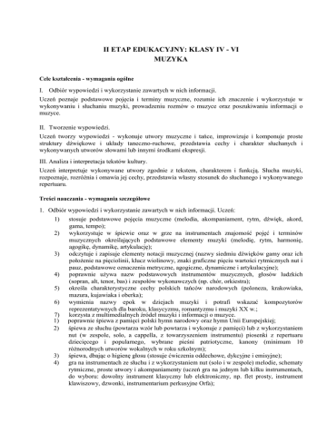 II ETAP EDUKACYJNY: KLASY IV - VI MUZYKA Cele kształcenia - wymagania ogólne I. Odbiór wypowiedzi i wykorzystanie zawartych w nich informacji. Uczeń poznaje podstawowe pojęcia i terminy muzyczne, rozumie ich znaczenie i wykorzystuje w wykonywaniu i słuchaniu muzyki, prowadzeniu rozmów o muzyce oraz poszukiwaniu informacji o muzyce. II. Tworzenie wypowiedzi. Uczeń tworzy wypowiedzi - wykonuje utwory muzyczne i tańce, improwizuje i komponuje proste struktury dźwiękowe i układy taneczno-ruchowe, przedstawia cechy i charakter słuchanych i wykonywanych utworów słowami lub innymi środkami ekspresji. III. Analiza i interpretacja tekstów kultury. Uczeń interpretuje wykonywane utwory zgodnie z tekstem, charakterem i funkcją. Słucha muzyki, rozpoznaje, rozróżnia i omawia jej cechy, przedstawia własny stosunek do słuchanego i wykonywanego repertuaru. Treści nauczania - wymagania szczegółowe 1. Odbiór wypowiedzi i wykorzystanie zawartych w nich informacji. Uczeń: 1) 2) 3) 4) 5) 6) 7) 1) 2) 3) 4) stosuje podstawowe pojęcia muzyczne (melodia, akompaniament, rytm, dźwięk, akord, gama, tempo); wykorzystuje w śpiewie oraz w grze na instrumentach znajomość pojęć i terminów muzycznych określających podstawowe elementy muzyki (melodię, rytm, harmonię, agogikę, dynamikę, artykulację); odczytuje i zapisuje elementy notacji muzycznej (nazwy siedmiu dźwięków gamy oraz ich położenie na pięciolinii, klucz wiolinowy, znaki graficzne pięciu wartości rytmicznych nut i pauz, podstawowe oznaczenia metryczne, agogiczne, dynamiczne i artykulacyjne); poprawnie używa nazw podstawowych instrumentów muzycznych, głosów ludzkich (sopran, alt, tenor, bas) i zespołów wykonawczych (np. chór, orkiestra); określa charakterystyczne cechy polskich tańców narodowych (poloneza, krakowiaka, mazura, kujawiaka i oberka); wymienia nazwy epok w dziejach muzyki i potrafi wskazać kompozytorów reprezentatywnych dla baroku, klasycyzmu, romantyzmu i muzyki XX w.; korzysta z multimedialnych źródeł muzyki i informacji o muzyce. poprawnie śpiewa z pamięci polski hymn narodowy oraz hymn Unii Europejskiej; śpiewa ze słuchu (powtarza wzór lub powtarza i wykonuje z pamięci) lub z wykorzystaniem nut (w zespole, solo, a cappella, z towarzyszeniem instrumentu) piosenki z repertuaru dziecięcego i popularnego, wybrane pieśni patriotyczne, kanony (minimum 10 różnorodnych utworów wokalnych w roku szkolnym); śpiewa, dbając o higienę głosu (stosuje ćwiczenia oddechowe, dykcyjne i emisyjne); gra na instrumentach ze słuchu i z wykorzystaniem nut (solo i w zespole) melodie, schematy rytmiczne, proste utwory i akompaniamenty (uczeń gra na jednym lub kilku instrumentach, do wyboru: dowolny instrument klasyczny lub elektroniczny, np. flet prosty, instrument klawiszowy, dzwonki, instrumentarium perkusyjne Orfa); 5) 6) 7) 8) 9) odtwarza ruchem i gestodźwiękami proste rytmy i schematy rytmiczne, wykonuje kroki, figury i układy taneczne poloneza i krakowiaka, tańców ludowych (szczególnie własnego regionu) oraz podstawowe kroki wybranych tańców towarzyskich; tworzy proste struktury rytmiczne, sygnały dźwiękowe, swobodne akompaniamenty, prosty dwugłos (burdon, nagłos), ilustracje dźwiękowe do scen sytuacyjnych, tekstów literackich i obrazów (samodzielnie i pod kierunkiem nauczyciela); tworzy improwizacje ruchowe do muzyki; tworzy według ustalonych zasad improwizacje wokalne i instrumentalne (ćwiczenie wykonuje samodzielnie i pod kierunkiem nauczyciela z wykorzystaniem instrumentów wskazanych w pkt. 4 lub wykonanych przez uczniów); tworzy wypowiedzi o muzyce za pomocą środków pozamuzycznych - odzwierciedla graficznie cechy muzyki i form muzycznych, rysuje, maluje i układa teksty do muzyki, opisuje słowami cechy i charakter słuchanych utworów. 1. Analiza i interpretacja tekstów kultury. Uczeń: 1) 2) 3) 4) 5) 6) 7) świadomie odbiera muzykę - słucha (słuchanie analityczne, ukierunkowane przez nauczyciela na wybrane cechy utworu) wybranych dzieł literatury muzycznej (w całości lub fragmentów) reprezentatywnych dla kolejnych epok (od średniowiecza do XX w.) oraz dla muzyki jazzowej i rozrywkowej, słucha polskich pieśni patriotycznych oraz utworów ludowych w postaci oryginalnej i stylizowanej ; rozpoznaje cechy i budowę utworu muzycznego - określa nastrój, tempo, dynamikę, fakturę jednogłosową i wielogłosową, rozróżnia podstawowe formy muzyczne (A, AB, ABAi, rondo, wariacje); rozróżnia podstawowe głosy ludzkie (sopran, alt, tenor, bas), rodzaje zespołu wykonawczego (soliści, orkiestra symfoniczna, różne typy chórów i zespołów), określa grupy instrumentów (strunowe - smyczkowe, szarpane, uderzane; dęte drewniane i blaszane; perkusyjne) i główne instrumenty z tych grup; rozpoznaje charakterystyczne cechy polskich tańców narodowych (poloneza, krakowiaka, mazura, kujawiaka i oberka); charakteryzuje wybrane utwory muzyczne wysłuchane i omówione na zajęciach oraz inne, określając cechy muzyki, które decydują o charakterze utworu; porządkuje chronologicznie postacie kompozytorów - J. S. Bach, W. A. Mozart, L. van Beethoven, F. Chopin, S. Moniuszko, W. Lutosławski; interpretuje (gra i śpiewa) utwory zgodnie ze wskazówkami wykonawczymi umieszczonymi w nutach oraz własnym odczuwaniem muzyki.