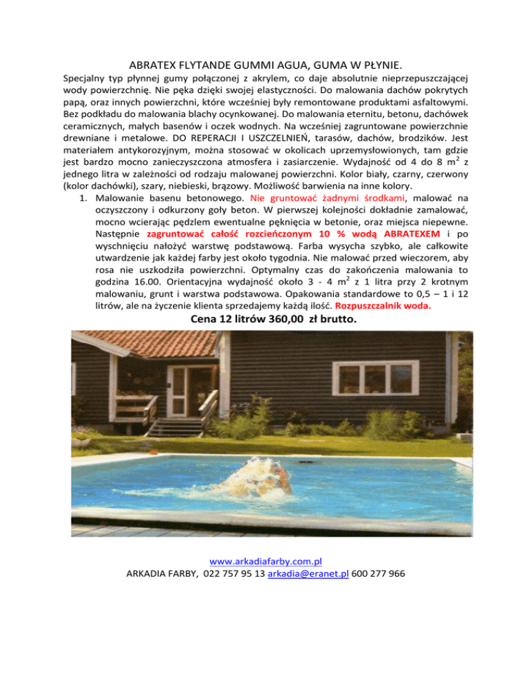 ABRATEX FLYTANDE GUMMI AGUA, GUMA W PŁYNIE. Specjalny typ płynnej gumy połączonej z akrylem, co daje absolutnie nieprzepuszczającej wody powierzchnię. Nie pęka dzięki swojej elastyczności. Do malowania dachów pokrytych papą, oraz innych powierzchni, które wcześniej były remontowane produktami asfaltowymi. Bez podkładu do malowania blachy ocynkowanej. Do malowania eternitu, betonu, dachówek ceramicznych, małych basenów i oczek wodnych. Na wcześniej zagruntowane powierzchnie drewniane i metalowe. DO REPERACJI I USZCZELNIEO, tarasów, dachów, brodzików. Jest materiałem antykorozyjnym, można stosowad w okolicach uprzemysłowionych, tam gdzie jest bardzo mocno zanieczyszczona atmosfera i zasiarczenie. Wydajnośd od 4 do 8 m 2 z jednego litra w zależności od rodzaju malowanej powierzchni. Kolor biały, czarny, czerwony (kolor dachówki), szary, niebieski, brązowy. Możliwośd barwienia na inne kolory. 1. Malowanie basenu betonowego. Nie gruntowad żadnymi środkami, malowad na oczyszczony i odkurzony goły beton. W pierwszej kolejności dokładnie zamalowad, mocno wcierając pędzlem ewentualne pęknięcia w betonie, oraz miejsca niepewne. Następnie zagruntowad całośd rozcieoczonym 10 % wodą ABRATEXEM i po wyschnięciu nałożyd warstwę podstawową. Farba wysycha szybko, ale całkowite utwardzenie jak każdej farby jest około tygodnia. Nie malowad przed wieczorem, aby rosa nie uszkodziła powierzchni. Optymalny czas do zakooczenia malowania to godzina 16.00. Orientacyjna wydajnośd około 3 - 4 m2 z 1 litra przy 2 krotnym malowaniu, grunt i warstwa podstawowa. Opakowania standardowe to 0,5 – 1 i 12 litrów, ale na życzenie klienta sprzedajemy każdą ilośd. Rozpuszczalnik woda. Cena 12 litrów 360,00 zł brutto. www.arkadiafarby.com.pl ARKADIA FARBY, 022 757 95 13 [email protected] 600 277 966