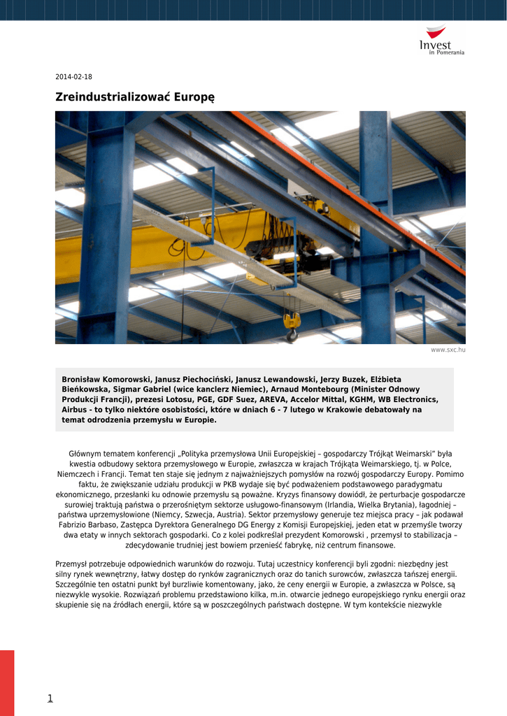 2014-02-18 Zreindustrializować Europę www.sxc.hu Bronisław Komorowski, Janusz Piechociński, Janusz Lewandowski, Jerzy Buzek, Elżbieta Bieńkowska, Sigmar Gabriel (wice kanclerz Niemiec), Arnaud Montebourg (Minister Odnowy Produkcji Francji), prezesi Lotosu, PGE, GDF Suez, AREVA, Accelor Mittal, KGHM, WB Electronics, Airbus - to tylko niektóre osobistości, które w dniach 6 - 7 lutego w Krakowie debatowały na temat odrodzenia przemysłu w Europie. Głównym tematem konferencji „Polityka przemysłowa Unii Europejskiej – gospodarczy Trójkąt Weimarski” była kwestia odbudowy sektora przemysłowego w Europie, zwłaszcza w krajach Trójkąta Weimarskiego, tj. w Polce, Niemczech i Francji. Temat ten staje się jednym z najważniejszych pomysłów na rozwój gospodarczy Europy. Pomimo faktu, że zwiększanie udziału produkcji w PKB wydaje się być podważeniem podstawowego paradygmatu ekonomicznego, przesłanki ku odnowie przemysłu są poważne. Kryzys finansowy dowiódł, że perturbacje gospodarcze surowiej traktują państwa o przerośniętym sektorze usługowo-finansowym (Irlandia, Wielka Brytania), łagodniej – państwa uprzemysłowione (Niemcy, Szwecja, Austria). Sektor przemysłowy generuje tez miejsca pracy – jak podawał Fabrizio Barbaso, Zastępca Dyrektora Generalnego DG Energy z Komisji Europejskiej, jeden etat w przemyśle tworzy dwa etaty w innych sektorach gospodarki. Co z kolei podkreślał prezydent Komorowski , przemysł to stabilizacja – zdecydowanie trudniej jest bowiem przenieść fabrykę, niż centrum finansowe. Przemysł potrzebuje odpowiednich warunków do rozwoju. Tutaj uczestnicy konferencji byli zgodni: niezbędny jest silny rynek wewnętrzny, łatwy dostęp do rynków zagranicznych oraz do tanich surowców, zwłaszcza tańszej energii. Szczególnie ten ostatni punkt był burzliwie komentowany, jako, że ceny energii w Europie, a zwłaszcza w Polsce, są niezwykle wysokie. Rozwiązań problemu przedstawiono kilka, m.in. otwarcie jednego europejskiego rynku energii oraz skupienie się na źródłach energii, które są w poszczególnych państwach dostępne. W tym kontekście niezwykle 1 istotnym jest aby sprząc politykę przemysłową z polityką klimatyczną i energetyczną Unii Europejskiej. Paweł Olechnowicz, prezes Grupy Lotos, przedstawił w tym zakresie ciekawe statystyki: emisja CO2 na mieszkańca w Stanach Zjednoczonych wynosi 17 ton rocznie, w UE – 7 ton. W Niemczech emisja ta jest wyższa niż w Polsce, mimo, że to nasi zachodni sąsiedzi są uważani za „zielonych” w tym zakresie. Wniosek nasuwa się sam: w kwestii polityki klimatycznej i energetycznej Europa musi być bardziej elastyczna jeśli chce odbudowywać przemysł. Niezwykle ciekawy wykład wygłosił również profesor Uniwersytetu Cambridge, Ha-Joon Chang. Profesor Chang nakreślił zadania, jakich powinna podjąć się Europa aby zreindustrializować gospodarkę: wyznaczyć sobie konkretne cele, zwiększyć nakłady na badania i rozwój, rozbudować wczesne szkolnictwo zawodowe oraz postawić na wąskie specjalizacje. Zwłaszcza kwestia nakładów na działalność badawczo-rozwojową wydaje się istotna. Jak podkreślał profesor, w latach 1950 – 1990 47-65% nakładów inwestycyjnych na B+R w Stanach Zjednoczonych pochodziło ze środków federalnych, w Europie w tym samym okresie - 30%. Stany Zjednoczone silnie inwestowały w przemysł kosmiczny i obronny, co z kolei napędzało inne sektory przemysłowe. Tylko przewagą technologiczną Europa może konkurować z resztą świata, a na to potrzebne są nakłady inwestycyjne. W konferencji wzięła udział również inicjatywa Invest in Pomerania, dla której kwestia odnowy przemysłu jest niezwykle ważna. Obecnie w regionie reindustrializacja najsilniej odznacza się w sektorze stoczniowym. Trójmiejskie firmy realizują liczne projekty z zakresu projektowania, budowy i remontów statków oraz produkcji dla sektora morskiej energetyki wiatrowej. Widoczna jest specjalizacja, nacisk kładziony jest na wysoką jakość produktów, realizowane są nowe działania badawczo rozwojowe. Sektor stoczniowy na Pomorzu jest doskonałym przykładem na to, że reindustrializacja jest koncepcją słuszną i że trzeba dalej działać w kierunku odnowy przemysłowych gałęzi gospodarki. Autor Mikołaj Trunin [email protected] 2