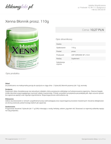 Apteka Współczesna ul. Podwale 15, 85-111 Bydgoszcz +48 52 345 65 81 Xenna Błonnik prosz. 110g Cena: 10,27 PLN Opis słownikowy Dawka - Opakowanie 110 g Postać prosz. Producent USP ZDROWIE SP. Z O.O Rodzaj Suplement Substancja czynna - Opis produktu Skład: (w przeliczeniu na maksymalną porcję do spożycia w ciągu dnia - 2 łyżeczki) błonnik pszenny (ok 11g), aromaty Działanie: Suplement diety charakteryzuje się naturalnym składem, który pozytywnie oddziałuje na funkcjonowanie organizmu. Stanowi bogate źródło błonnika wspomagającego czynność układu trawiennego. Przede wszystkim przyśpiesza perystaltykę jelit, daje uczucie sytości (co ogranicza apetyt) oraz reguluje wypróżnienia. Wspomaga proces odchudzania się. Wskazania: Zaleca się stosowanie w ramach uzupełnienia kuracji odchudzającej oraz wspomagania procesów trawiennych i leczenia dolegliwości ze strony przewodu pokarmowego (takich jak zaparcia). Dawkowanie: Przyjmować doustnie 2 łyżeczki (ok 11 g/24h) mieszając z wodą, herbatą, sokiem, jogurtem itd. Stosować co najmniej szklankę napoju na 5,5g preparatu. Plik wygenerowano: 04-03-2017 Powered by TCPDF (www.tcpdf.org) Oprogramowanie sklepu: AptusShop