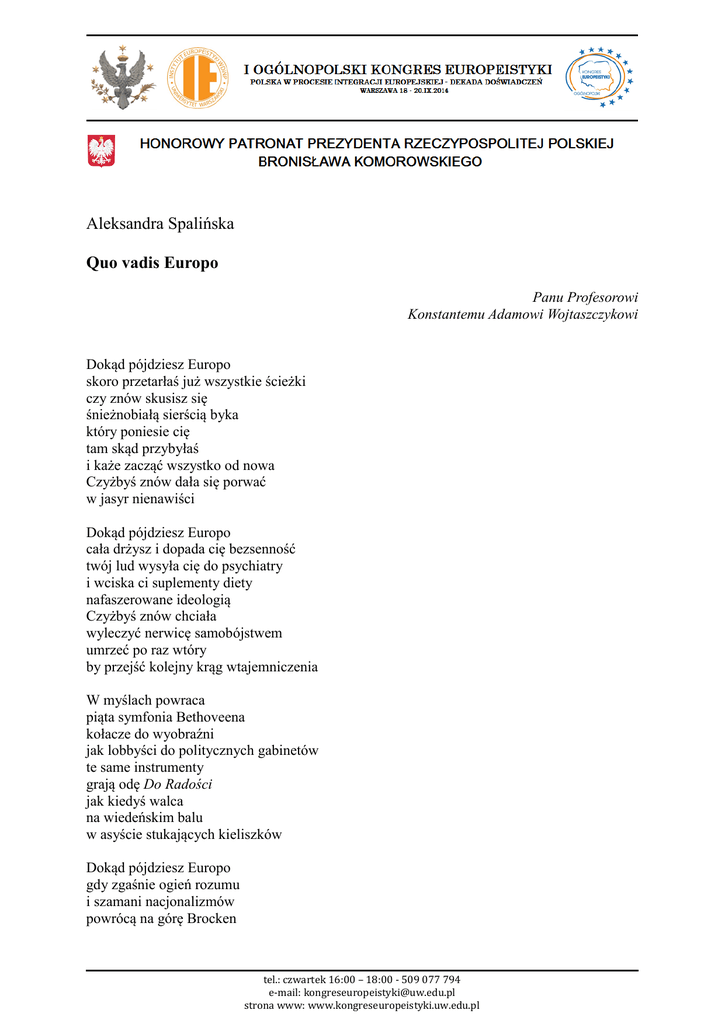 Aleksandra Spalińska Quo vadis Europo Panu Profesorowi Konstantemu Adamowi Wojtaszczykowi Dokąd pójdziesz Europo skoro przetarłaś już wszystkie ścieżki czy znów skusisz się śnieżnobiałą sierścią byka który poniesie cię tam skąd przybyłaś i każe zacząć wszystko od nowa Czyżbyś znów dała się porwać w jasyr nienawiści Dokąd pójdziesz Europo cała drżysz i dopada cię bezsenność twój lud wysyła cię do psychiatry i wciska ci suplementy diety nafaszerowane ideologią Czyżbyś znów chciała wyleczyć nerwicę samobójstwem umrzeć po raz wtóry by przejść kolejny krąg wtajemniczenia W myślach powraca piąta symfonia Bethoveena kołacze do wyobraźni jak lobbyści do politycznych gabinetów te same instrumenty grają odę Do Radości jak kiedyś walca na wiedeńskim balu w asyście stukających kieliszków Dokąd pójdziesz Europo gdy zgaśnie ogień rozumu i szamani nacjonalizmów powrócą na górę Brocken tel.: czwartek 16:00 – 18:00 - 509 077 794 e-mail: [email protected] strona www: www.kongreseuropeistyki.uw.edu.pl świętować Noc Walpurgii Gdy barbarzyńcy znów podpalą Rzym twój rodzinny Rzym z którego uciekniesz i do którego powrócisz jak święty Piotr --------------------------W Pałacu Kazimierzowskim uroczysta kolacja po całym dniu dyskusji o przyszłości Europy fruwają odmienne poglądy przerywane śmiechem i ironicznymi westchnieniami Z balkonu pałacu widok na wieczorne światła kampusu w powietrzu czuć już jesień nowe wyzwania i nowe pytania Quo vadis Europo Wrzesień 2014 r., I Ogólnopolski Kongres Europeistyki tel.: czwartek 16:00 – 18:00 - 509 077 794 e-mail: [email protected] strona www: www.kongreseuropeistyki.uw.edu.pl