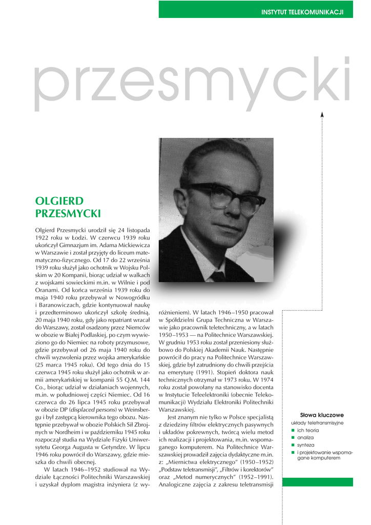 INSTYTUT TELEKOMUNIKACJI przesmycki OLGIERD PRZESMYCKI Olgierd Przesmycki urodził się 24 listopada 1922 roku w Łodzi. W czerwcu 1939 roku ukończył Gimnazjum im. Adama Mickiewicza w Warszawie i został przyjęty do liceum matematyczno-fizycznego. Od 17 do 22 września 1939 roku służył jako ochotnik w Wojsku Polskim w 20 Kompanii, biorąc udział w walkach z wojskami sowieckimi m.in. w Wilnie i pod Oranami. Od końca września 1939 roku do maja 1940 roku przebywał w Nowogródku i Baranowiczach, gdzie kontynuował naukę i przedterminowo ukończył szkołę średnią. 20 maja 1940 roku, gdy jako repatriant wracał do Warszawy, został osadzony przez Niemców w obozie w Białej Podlaskiej, po czym wywieziono go do Niemiec na roboty przymusowe, gdzie przebywał od 26 maja 1940 roku do chwili wyzwolenia przez wojska amerykańskie (25 marca 1945 roku). Od tego dnia do 15 czerwca 1945 roku służył jako ochotnik w armii amerykańskiej w kompanii 55 Q.M. 144 Co., biorąc udział w działaniach wojennych, m.in. w południowej części Niemiec. Od 16 czerwca do 26 lipca 1945 roku przebywał w obozie DP (displaced persons) w Weinsbergu i był zastępcą kierownika tego obozu. Następnie przebywał w obozie Polskich Sił Zbrojnych w Nordheim i w październiku 1945 roku rozpoczął studia na Wydziale Fizyki Uniwersytetu Georga Augusta w Getyndze. W lipcu 1946 roku powrócił do Warszawy, gdzie mieszka do chwili obecnej. W latach 1946 –1952 studiował na Wydziale Łączności Politechniki Warszawskiej i uzyskał dyplom magistra inżyniera (z wy- różnieniem). W latach 1946 –1950 pracował w Spółdzielni Grupa Techniczna w Warszawie jako pracownik teletechniczny, a w latach 1950 –1953 — na Politechnice Warszawskiej. W grudniu 1953 roku został przeniesiony służbowo do Polskiej Akademii Nauk. Następnie powrócił do pracy na Politechnice Warszawskiej, gdzie był zatrudniony do chwili przejścia na emeryturę (1991). Stopień doktora nauk technicznych otrzymał w 1973 roku. W 1974 roku został powołany na stanowisko docenta w Instytucie Teleelektroniki (obecnie Telekomunikacji) Wydziału Elektroniki Politechniki Warszawskiej. Jest znanym nie tylko w Polsce specjalistą z dziedziny filtrów elektrycznych pasywnych i układów pokrewnych, twórcą wielu metod ich realizacji i projektowania, m.in. wspomaganego komputerem. Na Politechnice Warszawskiej prowadził zajęcia dydaktyczne m.in. z: „Miernictwa elektrycznego” (1950 –1952) „Podstaw teletransmisji”, „Filtrów i korektorów” oraz „Metod numerycznych” (1952–1991). Analogiczne zajęcia z zakresu teletransmisji Słowa kluczowe układy teletransmisyjne n ich teoria n analiza n synteza n i projektowanie wspomagane komputerem INSTYTUT TELEKOMUNIKACJI P prowadził także w Wieczorowej Szkole Inżynierskiej (1955 –1966), na kursach magisterskich zorganizowanych przy Politechnice Warszawskiej Przez Instytut Łączności (1955–1960) oraz w Instytucie Telekomunikacji Politechniki Warszawskiej na Studium Podyplomowym Telekomunikacji, którego był kierownikiem w latach 1978 –1982. Był opiekunem ponad 90 prac dyplomowych, z których wiele zostało wyróżnionych, a kilka nagrodzonych. W 1976 roku otrzymał dyplom najlepszego dydaktyka. Opracował 8 skryptów i reskryptów dydaktycznych dla studentów, w tym 2 skrypty współautorskie Podstawy teletransmisji. Jest autorem bądź współautorem 5 książek naukowych i technicznych, w tym autorem obszernej monografii Filtry elektryczne (WKŁ, 1962) oraz rozszerzonego wydania rosyjskiego Projektirowanije elektriczeskich lestnicznych filtrow (Swiaź, Moskwa 1968). Ponadto jest autorem lub współautorem ponad 50 artykułów naukowych i technicznych, 13 publikacji popularyzatorskich z zakresu programowania mikrokomputerów. Jest też twórcą ponad 90 programów dla komputerów, m.in. IBM PC, w tym ponad 30 unikatowych, opartych na opracowanych przez siebie metodach. Między innymi te metody prezentował na ponad 25 konferencjach, seminariach i kursach specjalistycznych. Przez wiele lat był konsultantem naukowym i doradcą technicznym w 5 jednostkach naukowo-badawczych i produkcyjnych. W Instytucie Telekomunikacji Politechniki Warszawskiej był kierownikiem Pracowni Filtrów i Korektorów (1971–1991), zastępcą dyrektora ds. nauki (1975) i ds. nauczania (1979 –1982) oraz kierownikiem Zakłady Systemów Teletransmisyjnych (1987– –1991). W 1971 roku utworzył w Pracowni Filtrów i Korektorów wydawnictwo publikujące opracowania naukowe i techniczne pracowników tej Pracowni w zeszytach serii „Podstawowej” i „ETO” (od 1991 roku wydano około 70 tytułów) oraz w 1974 roku — wydawnictwo Instytutu Telekomunikacji Politechniki Warszawskiej publikujące opracowania w zeszytach serii „Komunikaty i Referaty”. Był promotorem 3 rozpraw doktorskich oraz recenzentem i konsultantem kilkunastu takich rozpraw. Był ponadto członkiem Rady Wydziału Elektroniki Politechniki Warszawskiej oraz Komisji Egzaminów Doktorskich na tym Wydziale do chwili wprowadzenia restrykcyjnej Ustawy o szkolnictwie wyższym z dnia 12 września 1990 roku. W ramach prac naukowo-badawczych zaprojektował ponad 60 układów teletransmisyjnych (głównie filtrów i zwrotnic elektrycznych) wdrożonych do produkcji (m.in. W Polskich Zakładach Teletransmisyjnych i Zakładach OMIG). Za osiągnięcia naukowe, naukowo-badawcze, dydaktyczno-wychowawcze i popularyzatorskie otrzymał Nagrody Rektora Politechniki Warszawskiej, Ministra Łączności, Przewodniczącego Komitetu Nauki i Techniki oraz Przewodniczącego Wydziału IV Polskiej Akademii Nauk, Nagrodę Stowarzyszenia Elektryków Polskich „za wyróżniającą się książkę z zakresu elektryki napisaną i wydaną w kraju w latach 1959 –1968” (książka Filtry elektryczne), Nagrodę Wydawnictwa Epoka za publikacje z serii „Konkrety” (1986), a także około 10 odznaczeń, w tym: Medal Komisji Edukacji Narodowej (1976), Złotą Odz