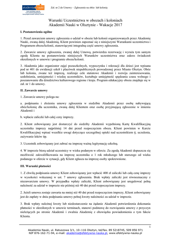 Zał. nr 2 do Umowy – Zgłoszenie na obóz lub kolonię Warunki Uczestnictwa w obozach i koloniach Akademii Nauki w Olsztynie - Wakacje 2017 I. Postanowienia ogólne 1. Przed zawarciem umowy zgłoszenia o udział w obozie lub kolonii organizowanych przez Akademię Nauki, zwaną dalej Akademią, Klient powinien zapoznać się z niniejszymi Warunkami uczestnictwa i Programem obozu/kolonii, stanowiącymi integralną część umowy zgłoszenia. 2. Zawarcie umowy zgłoszenia, zwanej dalej Umową, potwierdza rezerwację i wyraża tym samym zgodę Klienta na postanowienia niniejszych Warunków uczestnictwa oraz zakres świadczeń określonych w umowie i programie obozu/kolonii. 3. Akademia jako organizator zajęć pozaszkolnych, wypoczynku i rekreacji dla dzieci jest wpisana pod nr 401 do ewidencji szkół i placówek niepublicznych prowadzonej przez Miasto Olsztyn. Obóz lub kolonia, zwane też imprezą, realizuje cele statutowe Akademii i rozwija zainteresowania, uzdolnienia, umiejętności i wiedzę uczestników, kształtuje umiejętność spędzania czasu wolnego i poszanowanie dla dziedzictwa kulturowego regionu i kraju. Program edukacyjny obozu znajduje się w zał. nr 1 do umowy. II. Zawarcie umowy 1. Zawarcie umowy polega na: a. podpisaniu i złożeniu umowy zgłoszenia w siedzibie Akademii przez osobę nabywającą obóz/kolonię dla uczestnika, zwaną dalej Klientem oraz osobę przyjmującą zgłoszenie w imieniu Akademii i b. wpłacie zaliczki lub całej ceny imprezy. 2. Klient zobowiązany jest dostarczyć do siedziby Akademii wypełnioną Kartę Kwalifikacyjną uczestnika imprezy najpóźniej 14 dni przed rozpoczęciem obozu. Klient powinien w Karcie Kwalifikacyjnej wpisać wszelkie uwagi dotyczące szczególnej opieki nad uczestnikiem tj. uczulenia, zażywanie leków itp. 3. Uczestnik zobowiązany jest zabrać na imprezę ważną legitymację szkolną. 4. W imprezie biorą udział uczestnicy w wieku podanym w ofercie. Za zgodą Akademii dopuszcza się możliwość zakwalifikowania na imprezę uczestnika o 1 rok młodszego lub starszego od wieku podanego w ofercie w sytuacji, gdy Klient zgłasza na imprezę osoby spokrewnione. III. Warunki płatności 1. Z chwilą podpisania umowy Klient zobowiązany jest wpłacić 400 zł zaliczki lub całą cenę imprezy w wysokości wskazanej w ust. 7 umowy zgłoszenia. Brak wpłaty zaliczki jest równoznaczny z niezawarciem umowy. W przypadku wpłaty zaliczki, Klient zobowiązany jest uregulować pełną należność za udział w imprezie nie później niż 40 dni przed rozpoczęciem imprezy. 2. Jeżeli umowa zostaje zawarta na mniej niż 40 dni przed rozpoczęciem imprezy, Klient zobowiązany jest do zapłaty w dniu podpisania umowy pełnej kwoty należności za udział w imprezie. 3. Brak wpłaty należnej kwoty lub niedostarczenie na żądanie Akademii potwierdzenia dokonania płatności w określonych w umowie terminach, stanowi podstawę do rozwiązania umowy z przyczyn nieleżących po stronie Akademii i zwalnia Akademię z obowiązku powiadomienia o tym fakcie Klienta. 1 Akademia Nauki, ul. Ratuszowa 3/1, 10–116 Olsztyn, tel/fax. 89 5218745, 509 856 971 NIP 876-162-71-94, e-mail: [email protected], www.efektywna-nauka.pl Zał. nr 2 do Umowy – Zgłoszenie na obóz lub kolonię 4. Za datę dokonania płatności przyjmuje się dzień wpłaty gotówkowej w siedzibie Akademii lub dzień wpływu należności na rachunek bankowy Akademii w PKO BP Oddział w Olsztynie nr 20 1440 1228 0000 0000 0643 5505. 5. Po zawarciu Umowy Klientowi nie przysługują żadne rabaty i bonusy oferowane w późniejszym terminie, o ile takie będą. 6. Przy zawarciu umowy na obóz „Bądź jak detektyw Sherlock Holmes” do 30 maja 2017 r. Akademia zapewnia Uczestnikowi drugą bezpłatną lekcję jazdy konnej na lonży z instruktorem. W ramach programu obozu każdy Uczestnik obozu otrzyma jedną 15-minutową bezpłatną lekcję jazdy konnej na lonży z instruktorem. 7. Klient może zamówić dla uczestnika obozu „Bądź jak detektyw Sherlock Holmes” kolejne lekcje jazdy konnej. Opłatę za nie Klient wniesie na miejscu obozu bezpośrednio u właściciela stadniny koni Janczary i zgodnie z jego cennikiem. 8. Upusty należne Klientowi wskazane są w ust. 5 umowy – zgłoszenia. IV. Realizacja Umowy 1. Akademia zobowiązuje się do świadczenia usług zgodnie z programem imprezy. 2. W czasie trwania imprezy Uczestnik ma prawo do korzystania ze wszystkich świadczeń zawartych w programie lub umowie. 3. Przedstawiciel Akademii, kierownik obozu/kolonii zapewnia sprawny przebieg obozu zgodnie z programem, dba o wysoką jakość świadczonych usług, przyjmuje reklamacje i podejmuje stosowne działania w celu ich wyjaśnienia. Klient może skontaktować się z kierownikiem obozu/kolonii dzwoniąc w trakcie obozu na kom. 604 983 377. 4. Na życzenie Uczestników i za zgodą kierownika obozu/kolonii program obozu może ulec zmianie o ile nie spowoduje ona utrudnienia w realizacji pozostałej części programu lub zwiększenia kosztów. 5. Klient może przenieść wszystkie przysługujące mu z tytułu umowy uprawnienia i obowiązki na inną osobę pod warunkiem, że osoba ta spełnia niniejsze Warunki uczestnictwa i je akceptuje. O przeniesieniu praw Klient ma obowiązek poinformować Akademię w trybie natychmiastowym. Poinformowanie o zmianie w terminie krótszym niż 7 dni przed rozpoczęciem imprezy jest bezskuteczne. Za wszelkie koszty związane ze zmianą uczestnictwa oraz uregulowaniu należności za uczestnictwo w imprezie odpowiadają solidarnie Klient oraz osoba przejmująca jego uprawnienia. 6. Jeżeli w czasie trwania imprezy Akademia nie może wykonać przewidzianych w umowie usług stanowiących istotną część programu, zobowiązana jest do zapewnienia świadczeń zastępczych. Zorganizowanie świadczeń zastępczych o tym samym standardzie nie stanowi wady usług. Klient nie może z tego powodu zgłaszać roszczeń do Akademii. 7. Akademia nie 