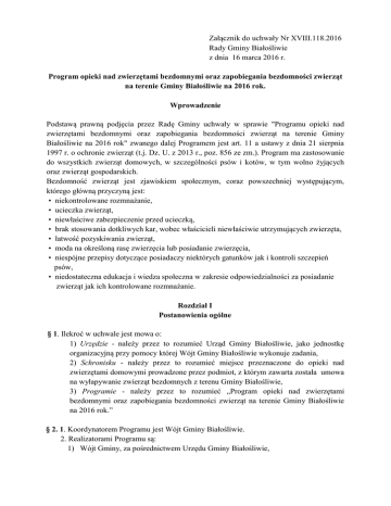 Załącznik do uchwały Nr XVIII.118.2016 Rady Gminy Białośliwie z dnia 16 marca 2016 r. Program opieki nad zwierzętami bezdomnymi oraz zapobiegania bezdomności zwierząt na terenie Gminy Białośliwie na 2016 rok. Wprowadzenie Podstawą prawną podjęcia przez Radę Gminy uchwały w sprawie "Programu opieki nad zwierzętami bezdomnymi oraz zapobiegania bezdomności zwierząt na terenie Gminy Białośliwie na 2016 rok" zwanego dalej Programem jest art. 11 a ustawy z dnia 21 sierpnia 1997 r. o ochronie zwierząt (t.j. Dz. U. z 2013 r., poz. 856 ze zm.). Program ma zastosowanie do wszystkich zwierząt domowych, w szczególności psów i kotów, w tym wolno żyjących oraz zwierząt gospodarskich. Bezdomność zwierząt jest zjawiskiem społecznym, coraz powszechniej występującym, którego główną przyczyną jest: • niekontrolowane rozmnażanie, • ucieczka zwierząt, • niewłaściwe zabezpieczenie przed ucieczką, • brak stosowania dotkliwych kar, wobec właścicieli niewłaściwie utrzymujących zwierzęta, • łatwość pozyskiwania zwierząt, • moda na określoną rasę zwierzęcia lub posiadanie zwierzęcia, • niespójne przepisy dotyczące posiadaczy niektórych gatunków jak i kontroli szczepień psów, • niedostateczna edukacja i wiedza społeczna w zakresie odpowiedzialności za posiadanie zwierząt jak ich kontrolowane rozmnażanie. Rozdział I Postanowienia ogólne § 1. Ilekroć w uchwale jest mowa o: 1) Urzędzie - należy przez to rozumieć Urząd Gminy Białośliwie, jako jednostkę organizacyjną przy pomocy której Wójt Gminy Białośliwie wykonuje zadania, 2) Schronisku - należy przez to rozumieć miejsce przeznaczone do opieki nad zwierzętami domowymi prowadzone przez podmiot, z którym zawarta została umowa na wyłapywanie zwierząt bezdomnych z terenu Gminy Białośliwie, 3) Programie - należy przez to rozumieć „Program opieki nad zwierzętami bezdomnymi oraz zapobiegania bezdomności zwierząt na terenie Gminy Białośliwie na 2016 rok.” § 2. 1. Koordynatorem Programu jest Wójt Gminy Białośliwie. 2. Realizatorami Programu są: 1) Wójt Gminy, za pośrednictwem Urzędu Gminy Białośliwie, 2) Organizacje pozarządowe działające na terenie gminy, których celem statutowym jest ochrona zwierząt, współpracując z Urzędem Gminy Białośliwie, 3) Schronisko dla Bezdomnych Zwierząt z którym zawarta została stosowna umowa na wykonywanie usług. Rozdział II Cele i zadania Programu § 3.1. Celem Programu jest zapobieganie bezdomności zwierząt na terenie Gminy Białośliwie oraz opieka nad zwierzętami bezdomnymi. 2. Zadania priorytetowe Programu to: 1) zapewnienie opieki bezdomnym zwierzętom z terenu Gminy Białośliwie, 2) sprawowanie opieki nad wolno żyjącymi kotami, w tym ich dokarmianie, 3) odławianie bezdomnych zwierząt, 4) ograniczenie populacji bezdomnych zwierząt poprzez sterylizację albo kastrację, w szczególności psów i kotów, 5) poszukiwanie nowych właścicieli dla bezdomnych zwierząt, 6) usypianie ślepych miotów, 7) wskazanie gospodarstwa rolnego w celu zapewnienia miejsca dla zwierząt gospodarskich, 8) zapewnienie całodobowej opieki weterynaryjnej w przypadku zdarzeń z udziałem zwierząt, 9) edukacja i promowanie prawidłowych postaw oraz zachowań człowieka w stosunku do zwierząt. Rozdział III Opieka nad zwierzętami § 4. § 5. Zapewnienie opieki bezdomnym zwierzętom z terenu gminy Białośliwie realizują: 1) schronisko CYWIL z siedzibą w Rybowo 51, 62-130 Gołańcz, prowadzone przez FHU ZIBI - Schronisko CYWIL Zbigniew Chmielewski poprzez przyjmowanie zwierząt bezdomnych dostarczanych do schroniska przez Urząd Gminy Białośliwie lub działając na zlecenie Urzędu (telefoniczne zgłoszenie przez pracownika Urzędu Gminy), 2) Urząd poprzez wskazanie gospodarstwa rolnego, zapewniającego tymczasowe miejsce dla zwierząt gospodarskich, na podstawie zawartego porozumienia z osobą prowadząca gospodarstwo rolne przy ul. 4 Stycznia 71 w Białośliwiu, posiadającą odpowiednie warunki w celu zapewnienia opieki nad zwierzętami gospodarskimi, 3) organizacje pozarządowe poprzez realizację zadań publicznych, obejmujących opiekę nad zwierzętami bezdomnymi. Sprawowanie opieki nad kotami wolno żyjącymi, w tym ich dokarmianie realizują: 1) Urząd Gminy Białośliwie poprzez: a. zakup i wydawanie karmy społecznym opiekunom kotów wolno żyjących, b. odławianie oraz wydawanie skierowań na leczenie zwierząt chorych lub w złej kondycji, 2) organizacje pozarządowe poprzez realizację zadań publicznych obejmujących opiekę nad kotami wolno żyjącymi oraz podejmowanie interwencji w sprawach kotów wolno żyjących. § 6. Poszukiwanie nowych właścicieli dla bezdomnych zwierząt realizują: 1) Schronisko CYWIL Zbigniew Chmielewski w Rybowie, poprzez działania pozyskiwania nowych właścicieli zdolnych zapewnić im należyte warunki bytowe, 2) Urząd poprzez promocję adopcji zwierząt ze schroniska, 3) Urząd poprzez prowadzenie działań informacyjno-promocyjnych dla pozyskania nowych właścicieli, między innymi umieszczając ogłoszenia na stronach internetowych Gminy Białośliwie, 4) Organizacje pozarządowe promując i prowadząc akcje adopcyjne. § 7. Zapewnienie całodobowej opieki weterynaryjnej w przypadkach zdarzeń drogowych z udziałem zwierząt realizują: 1) schronisko poprzez zapewnienie dyżurów lekarza weterynarii w schronisku, 2) Urząd poprzez zlecenie i skierowanie do zakładu leczniczego dla zwierząt w zakresie opieki weterynaryjnej zwierzętom bezdomnym i kotom wolno żyjącym z terenu gminy Białośliwie. § 8. Usypianie ślepych miotów zwierząt, zgodnie z art. 11 a ust. 2 pkt 6 ustawy o ochronie zwierząt realizuje schronisko poprzez dokonywanie przez lekarza weterynarii zabiegów usypiania ślepych miotów zwierząt aktualnie przebywających w schronisku. § 9. Ograniczanie populacji bezdomnych zwierząt poprzez sterylizację i kastrację zwierząt domowy