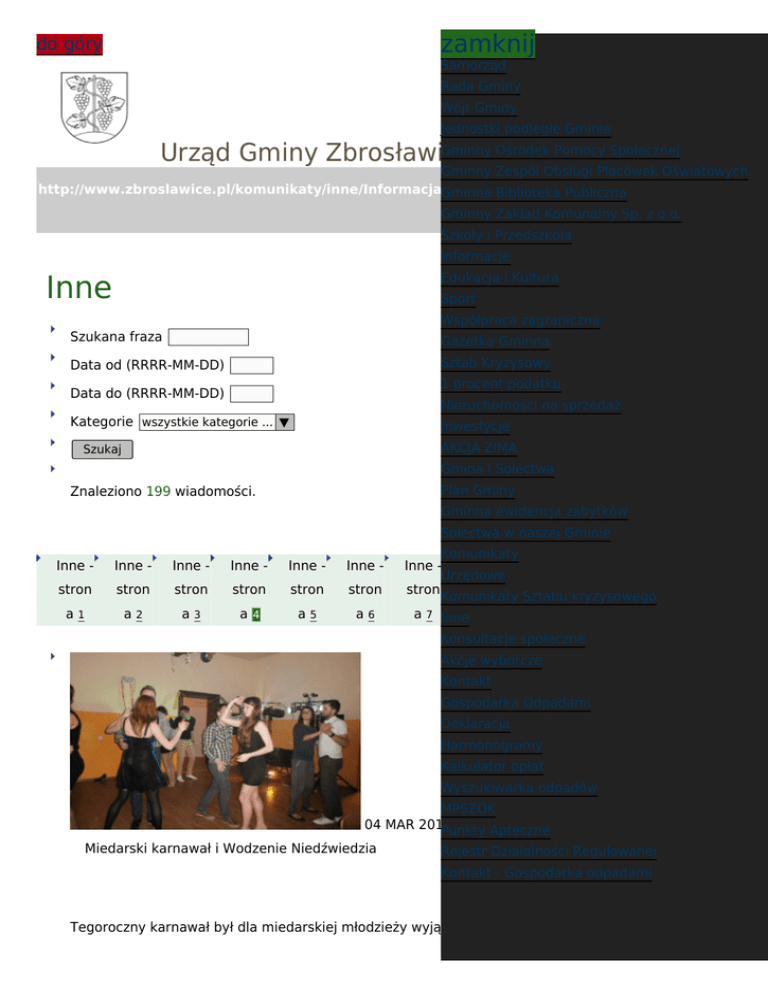 zamknij do góry Samorząd Rada Gminy Wójt Gminy Jednostki podległe Gminie Gminny Ośrodek Pomocy Społecznej Urząd Gminy Zbrosławice Gminny Zespół Obsługi Placówek Oświatowych http://www.zbroslawice.pl/komunikaty/inne/Informacja-o-zamiarze-udostepnienia-kanalu-tec Gminna Biblioteka Publiczna /printpdf/st:4 Gminny Zakład Komunalny Sp. z o.o. Szkoły i Przedszkola Informacje Inne Edukacja i Kultura Sport Współpraca zagraniczna Szukana fraza Gazetka Gminna Data od (RRRR-MM-DD) Sztab Kryzysowy 1 procent podatku Data do (RRRR-MM-DD) Nieruchomości na sprzedaż Kategorie wszystkie kategorie ... ▼ Inwestycje AKCJA ZIMA Szukaj Gmina i Sołectwa Plan Gminy Znaleziono 199 wiadomości. Gminna ewidencja zabytków Sołectwa w naszej Gminie Inne - Inne - Inne - Inne - Inne - Inne - stron stron stron stron stron stron a1 a2 a3 a5 a6 a 4 Komunikaty Inne - Następ Ostatni Urzędowe stron na a Komunikaty Sztabu kryzysowego a 7 Inne Konsultacje społeczne Akcje wyborcze Kontakt Gospodarka Odpadami Deklaracja Harmonogramy Kalkulator opłat Wyszukiwarka odpadów MPSZOK 04 MAR 2014 Punkty Apteczne Miedarski karnawał i Wodzenie Niedźwiedzia kategoria: Rejestr Działalności Regulowanej Kontakt - Gospodarka odpadami Inne Tegoroczny karnawał był dla miedarskiej młodzieży wyjątkowy. 22 lutego w świetlicy gminnej zwanej "klubem", w zabawie brała udział nie tylko młodzież z Miedar, ale również ich rówieśnicy z pobliskich miejscowości. Organizatorzy zadbali o dobrą muzykę, jak i poczęstunek, a tańce i zabawy trwały do białego rana. Sołtys Miedar składa serdeczne podziękowania organizatorom i tym samym zaprasza do dalszych realizacji i 03 MAR 2014 kategoria: Znaleziono psa Inne AKTUALIZACJAwłaściciele zostali odnalezieni W dniu dzisiejszym w Zbrosławicach przy ul. Wolności znaleziono psa w typie płochacza niemieckiego bądź setera angielskiego. Właściciele bądź osoby, które rozpoznają psa na załączonym zdjęciu, proszone są o zgłoszenie się do Urzędu Gminy Zbrosławice pod nr tel. 32 233 70 40 lub 604 465 471. 12 LUT 2014 Śmieci zamiast na wysypiska trafiają do naszych płuc kategoria: Inne Choć oficjalne wyniki nie zostały jeszcze podane, to my już wiemy - Marek Minkus został wybrany Człowiekiem Roku 2013 Powiatu Tarnogórskiego!W zakończonym 3 lutego plebiscycie Dziennika Zachodniego oraz serwisu naszemiasto.pl organizowanym przez „Polskapresse” Sp. z o.o. mieszkańcy powiatu nie pozostawili wątpliwości, komu ten tytuł się należy. Marek Minkus otrzymał ponad dwukrotnie więcej głosów (1277) od Marii Ożgi, 06 LUT 2014 Zabawa karnawałowa w Wieszowie kategoria: Inne Serdecznie zapraszamy na ZABAWĘ KARNAWAŁOWĄ - WALENTYNKOWĄ, która odbędzie się 15.02.2014r w Domu Kultury w Wieszowie. Gra zespół Exel. Bilety w cenie 70 zł od pary do nabycia w świetlicy w Wieszowie. Tel.: 32 273 74 87 lub 694 502 632 W cenie biletu: kawa, ciasto, zimne napoje, o północy coś ciepłego i oczywiście WALENTYNKOWE NIESPODZIANKI! Dodatkowo można zakupić: napoje, słodycze i inne... Bawimy się: 17 GRU 2013 MZKP informuje kategoria: Inne Informujemy, że w okresie Świąt Bożego Narodzenia i Nowego Roku komunikacja autobusowa Międzygminnego Związku Komunikacji Pasażerskiej w Tarnowskich Górach funkcjonować będzie według następującego harmonogramu : DZIEŃ OBOWIĄZUJĄCY ROZKŁAD JAZDY 23.12.2013r. na dni robocze bez nauki szkolnej 24.12.2013r. na dni robocze bez nauki szkolnej z ograniczeniem kursowania w godzinach 06 GRU 2013 kategoria: UWAGA! Awaria wodociągu Inne Woda dla mieszkańców Czekanowa i Szałszy zostanie dostarczona beczkowozami. 29 PAŹ 2013 Wiadomości z gminy w smartfonach kategoria: Inne Informujemy, że nawiązaliśmy współpracę z tworcą aplikacji mobilnej SIL24, dzięki której można dostawć automatycznie nowe wiadomości z urzędowej strony bezpośrednio na telefon komórkowy. Usługa wykorzystuje istniejący mechanizm kanału RSS i już jest aktywna. Aplikacja mobilna SIL24 jest w podstawowej wersji darmowa. Można ją pobrać przez Google Play dla smartfonów z androidem, oraz App Store dla produktów firmy Apple. 16 PAŹ 2013 kategoria: Informacja z MZKP Tarnowskie Góry Inne W związku ze świętami przypadającymi w listopadzie 2013r. komunikacja autobusowa wykonywana na zlecenie MZKP Tarnowskie Góry funkcjonować będzie w następujący sposób: 1 listopada 2013r. (Wszystkich Świętych - piątek) wg rozkładów obowiązujących na niedziele i święta bez obsługi przystanków zlokalizowanych przy centrach handlowych (do obsługi linii nr 129 PKM Świerklaniec skieruje w tym dniu autobusy przegubowe); 2 03 WRZ 2013 Nowy rozkład jazdy linii nr 712 kategoria: Inne Na wniosek mieszkańców wprowadza się do realizacji od 1.09.2013 r. nowy rozkład jazdy linii nr 712, w którym wydłużono do przystanku "Zbrosławice Urząd Gminy" trasę obecnego kursu z z Przezchlebia o godz. 7.30 z równoczesnym przyspieszeniem jego odjazdu o 11 minut. W konsekwencji, odjazd autobusu w kursie następnym odbywać się będzie z przystanku przy Urzędzie Gminy z niewielkim przesunięciem czasowym w stosunku do 19 LIP 2013 kategoria: Przeniesienie numerów telefonicznych urzędu Inne W związku z planowanymi pracami związanymi z przeniesieniem numerów telefonicznych do nowego operatora informujemy, że w dniu 26 lipca mogą występować problemy z komunikacją drogą telefoniczną na numerach należących do Urzędu Gminy Zbrosławice. W razie problemów z połączeniem polecamy dzwonić na numery komórkowe podane w dziale kontakt.Za utrudnienia przepraszamy. Inne - Inne - Inne - Inne - Inne - Inne - Inne - Następ Ostatni stron stron stron stron stron stron stron na a a1 a2 a3 a5 a6 a7 a 4