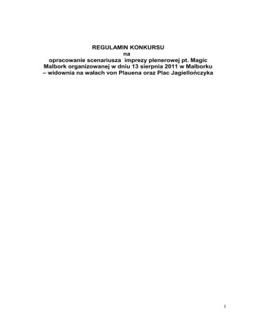 REGULAMIN KONKURSU na opracowanie scenariusza imprezy plenerowej pt. Magic Malbork organizowanej w dniu 13 sierpnia 2011 w Malborku – widownia na wałach von Plauena oraz Plac Jagiellończyka 1 ROZDZIAŁ I POSTANOWIENIA OGÓLNE 1.INFORMACJE O ZAMAWIAJĄCYM I ORGANIZATORZE KONKURSU 1.1.Zamawiającym jest Miejski Dom Kultury w Malborku reprezentowany przez dyr. Bohdana Paczkowskiego, tel. 55 272 38 52, e-mail: [email protected] 1.2.Organizatorem konkursu jest: Miejski Dom Kultury w Malborku, reprezentowany przez dyr. Bohdana Paczkowskiego 1.3.Wszelką korespondencję związaną z niniejszym konkursem należy kierować na adres: Miejski Dom Kultury. Pl.Słowiański 18, 82-200 Malbork, tel. 55 272 38 52, z oznaczeniem KONKURS – MAGIC MALBORK 1.4.Osobą upoważnioną do udzielania informacji o konkursie jest Ryszard Ignaczak, tel 55 272 38 52 fax.55 272 46 01, e-mail: [email protected] 2.FORMA KONKURSU I JEGO PODSTAWA PRAWNA 2.1.Konkurs prowadzony jest zgodnie z przepisami ustawy z dnia 29 stycznia 2004 r. Prawo zamówień publicznych (Dz. U. Z 2010 r. Nr 113, poz 759, Nr 161, poz 1078 i Nr 182 poz. 1228, zwanej dalej „ustawą” lub „PZP”., oraz zgodnie z wszelkimi aktami wykonawczymi wydanymi do ustawy, jak również zgodnie z zapisami niniejszego regulaminu) 2.2.Konkurs zorganizowany jest w formie konkursu otwartego, międzynarodowego, jednoetapowego, na opracowanie scenariusza imprezy plenerowej MAGIC-MALBORK, w którym Wykonawcy składają wnioski o dopuszczenie do udziału w konkursie, a Zamawiający dopuszcza do udziału w konkursie i zaprasza do składania prac konkursowych Wykonawców spełniających warunki udziału w konkursie. 2.3.Konkurs prowadzony i rozstrzygany jest w języku polskim. Wszystkie dokumenty, oświadczenia, zawiadomienia i wnioski, a także część opisowa konkursu muszą być przez wszystkich uczestników sporządzane w języku polskim. 2.4.Jeżeli dokumenty, o których mowa w punkcie 2.3. zostały sporządzone w języku innym niż polski, powinny zostać złożone wraz z tłumaczeniem na język polski. 2.5.Przyjęte rozwiązania powinny spełniać wymogi -Ustawa z dnia 4 lutego 1994 r. o prawie autorskim i prawach pokrewnych (Dz.U. z 2006 r., Nr 90, poz. 631 z późn. zm.). 3.TERMINY KONKURSU 3.1 3.2 Składanie wniosków o dopuszczenie do udziału w konkursie Zawiadomienie Uczestników o dopuszczenie do udziału w konkursie i 18.06.2011 20.06.2011 3.3 przekazanie zaproszenia do złożenia prac Nadsyłanie pytań 24.06.2011 (odpowiedzi na pytania) 28.06.2011 2 3.4 3.5 3.6 3.7 Termin złożenia prac konkursowych Ogłoszenie wyników konkursu Zaproszenie w trybie zamówienia z wolnej ręki Podpisanie umowy 30.06.2011 04.07.2011 19.07.2011 22.07.2011 Uwaga: Wskazane terminy mogą ulec przedłużeniu. O zmianie terminów Zamawiający niezwłocznie poinformuje Uczestników konkursu. 4.SĄD KONKURSOWY 4.1.Sąd konkursowy liczy 3 osoby. W skład Sądu wchodzą: Jolanta Leszczyńska - Przewodniczący Sądu Konkursowego, Magdalena Marszałkowska - Sędzia Referent, Roman Milanowski - Sędzia. 4.2.Do współpracy z Sądem konkursowym mogą zostać powołani eksperci, biegli lub konsultanci. O potrzebie powołania powyższych zdecyduje Sąd konkursowy. 4.3.Do pomocy w pracach Sądu konkursowego zostaje powołany Sekretarz Sądu konkursowego w osobie Pana Ryszarda Ignaczaka 5. OPIS PRZEDMIOTU KONKURSU 1.PRZEDMIOT I CEL KONKURSU 1.1.Przedmiotem konkursu jest stworzenie scenariusza plenerowego widowiska Magic Malbork oraz programu występów ulicznych Magic Malbork. 1.2.Celem konkursu jest wyłonienie najlepszego scenariusza, który łączy atrakcyjność artystyczną z możliwością sprawnej realizacji jego treści, w tym umożliwia jego realizację w ramach środków zarezerwowanych na ten cel przez Zamawiającego. 2.CZAS I MIEJSCE ORGANIZACJI IMPREZY WG SCENARIUSZA KONKURSOWEGO Malbork – 13 sierpnia 2011 Plac Jagiellończyka przy fontannie – 1700 - 2100 Widownia na wałach von Plauena w Malborku -widowisko zasadnicze godz. 2200 -2250 max. 2300 3.IDEA KONKURSU: Pomysł i szczegóły realizacyjne kolejnej edycji Magic Malbork z uwzględnieniem ducha imprezy, nawiązaniem do cykliczności oraz świeżym akcentem wraz z imprezami towarzyszącymi 6.WARUNKI ORGANIZACYJNE -ZAŁOŻENIA ORGANIZACYJNE 3 A) Zobowiązania Zamawiającego Zamawiający udostępnia lub ponosi koszty: -Udostępnienia protokolarnie Wykonawcy pomieszczenia ( istniejącej reżyserki ) przy trybunach sprzęt : w tym urządzenia do obsługi nagłośnienia i telebimu itp. (udostępnione nieodpłatnie za potwierdzeniem protokolarnym) -Udostępnienia wszelkich urządzeń ( szafek elektrycznych) niezbędnych do przeprowadzenia widowiska (udostępnione nieodpłatnie za potwierdzeniem protokolarnym) -Udostępnienia Wykonawcy sceny o wymiarach 15m x 15m (udostępnione nieodpłatnie za potwierdzeniem protokolarnym) -Udostępnienia 1 ekranu LED ( 42m kw) wraz z osprzętem ( bez obsługi ) - z uwagi na fakt, iż nagłośnienie i telebim objęte są gwarancją obsługę musi stanowić firma wskazana przez Urząd Miasta Malborka -Ochrony miejsc objętych biletowaniem na trybunach na wałach von Plauena -Zabezpieczenia medycznego miejsc i terenu objętego biletowaniem na trybunach na wałach von Plauena -Zabezpieczenia toalet dla miejsc i terenu objętego biletowaniem przy trybunach na wałach von Plauena -Oznakowania informacyjnego trybun, sektorów, sprzedaży biletów, objazdów, itp. -Ubezpieczenia ogólnego imprezy -Sprzątania całego terenu, na którym odbywać się będzie impreza Zobowiązania Wykonawcy Wykonawca zabezpiecza i zapewnia oraz ponosi koszty: 1.Transportu sceny, jej montażu i demontażu, 2.Montażu i demontażu sprzętu nagłaśniającego będącego w dyspozycji organizatora 3.Zapewnienia dodatkowego sprzętu nagłaśniającego ( w tym montażu i demontażu) niezbędnego do prawidłowego wykonania imprezy 4.Obsługi BHP oraz wszystkich prac montażowych dotyczących przygotowania imprezy