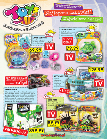 Oferta handlo wa obowiązu od 21.05 do 05 je .06.2016 Najlepsze zabawki! Największe okazje! LITTLE LIVE PETS Żółwik, który pływa i pełza po lądzie. Zaopiekuj sie nim! LITTLE LIVE PETS Myszka reagująca na dotyk, wydaje aż 25 dźwięków. super CENA! TV reklama 69,99 79,99 TV reklama 83351 125,99 89258 LITTLE LIVE PETS KUP DINO ZOOMER za1gr! OTRZYMASZ 80747 DINO ZOOMER Użyj gestów dłoni albo pilota, aby wydawać mu polecenia, oswoić Dino i budować waszą przyjaźń. Jego oczy zmienią kolor w zależności od humoru lub trybu. Dzięki czujnikom na łebku może wykrywać ruchy rąk i obiektów w wokół niego. Ma wbudowany czujnik IR, który wykrywa, kiedy pilot jest aktywny. Żółwik z basenem. Zabierz swojego ulubieńca w dowolne miejsce zabawy. TV reklama -10% 83352 WILD PETS Interaktywny pająk. Interaktywny skorpion. TV reklama 84044 PROM OCJA ! 399,99 89,99 1 opak. www.toysbox.pl 89252 89253 TV reklama REVELL JUNIOR KIT Samochody wyścigowe - Wyścigówka i Roadster Modelarstwo wielokrotnego użytku. REVELL JUNIOR KIT Samochód policyjny Samochód terenowy Modelarstwo dla najmłodszych, bez klejenia. TV reklama 79,99 1 opak. 90418 59,99 1 opak. 90420 90419 90421 REVELL Latąjacy model samolotu Rzutek wykonany z lekkiego drewna – balsy, rozpiętość skrzydeł 28 cm. TV reklama REVELL JUNIOR KIT Samochód strażacki Innowacyjny system śrub, model do złożenia bez klejenia. super CENA! 119,99 33529 7,99 AIR HOGS Hyper Disc Gigantyczny szybujący Hyper Disc! Nadmuchiwany, ma aż 90 cm średnicy! Napełnij go powietrzem lub helem i sprawdź, co potrafi! Rzucaj i rób sztuczki! Hyper Disc napełnisz za pomocą rurki dołączonej do zestawu. Możesz bawić się nim na zewnątrz. 90422 PSI PATROL Maskotka Mini Maskotki z serialu Psi Patrol, twoi wierni towarzysze we wszystkich podróżach. 29,99 1 szt. 86964 TV reklama 49,99 89384 www.toysbox.pl BIZU PREZENTOWE Zestaw Prezentowy. Edycja Specjalna. Stwórz bransoletkę bądź naszyjnik, w zestawie 8 dodatkowych ozdób! TIMMY TIME Figurki plastikowe Figurki kolekcjonerskie Timmego 10cm. 3,49 1 szt. super CENA! BIZU STUDIO Kreatywne Studio Bizu do projektowania bransoletek i naszyjnika. TV reklama 49797 FUNGUS AMUNGUS Pojemnik na toksyczne odpady Obserwuj swoje mikroby! Pojemnik z super zarazkiem pomieści 4 szalki Patriego. Mega Zestaw 10-pack -10% 69,99 1 opak. -50% 49796 40037 TV reklama FUNGUS AMUNGUS Mega Zestaw 15-pack TV 15 Fungusów, reklama a w nim dwa ukryte Fungusy oraz ulotka kolekcjonerska. 10 Fungusów, a w nim dwa ukryte Fungusy oraz ulotka kolekcjonerska. -23% 69,99 59,99 1 opak. 88405 88401 ZESTAWY KREATYWNE: piórniki do kolorowania + markery Zestawy zawierają piórniki do indywidualnych aranżacji. 88404 39,99 1 opak. 29,99 1 opak. 91506 ZESTAWY KREATYWNE: · Studio paznokci · Kreda do włosów Kompletne studio urody. Stylizacja włosów lub paznokci. 91515 91507 www.toysbox.pl 91516 STAR WARS Mówiąca maskotka 38 cm: Chewbacca, Darth Wader, R2-D2. STAR WARS Maskotka z dźwiękiem 22 cm. 89,99 49,99 1 szt. 259,99 88196 88226 39,99 149,99 1 opak. 88225 88224 STAR WARS Mówiące maskotki z zawieszką 12 cm. 23,99 1 szt. STAR WARS Mówiące maskotki 38 cm. Rey, Kylo Ren; Droid BB-8. 88194 279,99 88222 149,99 1 opak. 88223 88221 -40% STAR WARS Chewbacca Mówiąca i rycząca maskotka 35 cm. 339,99 199,99 88227 STAR WARS Maskotka mówiąca 60 cm Chewbacca Maskotka mówiąca frazy z oryginalnej ścieżki dźwiękowej, ma ruchome nogi i ramiona. Dzięki temu ustawisz zabawkę w pozycji gotowej do walki. STAR WARS Gra Perplexus Gwiazda Śmierci Pokonuj przeszkody i przemieszczaj się przez różne strefy bitwy. Gdy tylko Ci się to uda, na końcu drogi bądź przygotowany na kosmiczne fajerwerki i eksplozję świateł i dźwięków! Figura 60cm Szturmowiec żołnierz Imperium, mówiąca maskotka ruchomymi elementami. 88229 149,99 99,99 super CENA! 83805 www.toysbox.pl 199,99 88228 119,99 1 szt. DE LUXE ELECTRONIC CHICOS Kuchnia i grill 2 w 1 Zestaw do zabawy 2 w 1 zawiera piekarnik z płytą grzewczą, nad którą zawieszony jest okap, zlew z nowoczesnym kranem i pojemnik do przechowywania warzyw i owoców. Wersja De luxe dodatkowo wzbogacona jest o lodówkę oraz kuchenkę mikrofalową. Kuchnię można łatwo przekształcić w grilla. 91774 91778 91779 POJAZD MULTI GO 1+2 Wywrotka, Cysterna, Śmieciarka, Platforma budowlana, Traktor 91775 69,99 1 opak. 549,99 Multi GO posiada połączenie między nadwoziem a rozszerzeniem, a więc śmieciarka może na chwilę zmienić się w cysternę lub wywrotkę. Istnieje również możliwość podłączenia kilku przyczep. Ciągnik Zetor posiada wymienne ostrze, a przez otwarty dach można umieścić w aucie figurkę kierowcy. Zapraszamy do zabawy! 91777 91759 399,99 92261 MOLTO PARKING 7 poziomów Zbuduj własny, niepowtarzalny parking, przygotuj z wielką starannością każdy z 7 poziomów, umieść stację benzynową, auto Service, windę oraz myjnie samochodową, połącz wszystkie elementy i baw się wiele godzin. 92263 92265 POJAZD MULTI GO 1+2 ECOBOX Wywrotka, Śmieciarka, Traktor, Platforma budowlana, Cysterna Linia samochodów cieżarowych z poręcznym systemem „bayonet”, który umożliwia wymianę rozszerzeń i akcesoriów. 349,99 249,99 92260 www.toysbox.pl 92264 92262 59,99 1 opak. MONSTER TRUX Junk Truck 360 kl. /20057/ Stara śmieciarka kontenerowa przerobiona na budzącego strach monster trucka w nowej klockowej odsłonie. PROM MONSTER TRUX Dinotrux 500 kl. /20058/ Robot ze sztuczną inteligencją strzeże mieszkańców Iron Town 24 godziny na dobę. 89,99 OCJA PROM ! OCJA 88848 ACTION TOWN Mega szalony skatepark 500 kl. /1881/ Skatepark został powiększony o dodatkowe ramy do robienia trików. Trzech skejterów i jedna skejterka popisują się swoimi umiejętnościami uwieczniając je w aparacie fotograficznym. Dołącz do nich! ACTION TOWN Ranczo 420 kl. /1870/ Gospodarz właśnie przygotował auto, aby przewieźć owieczkę do strzyżenia. Pomóż mu.