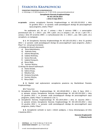 Zarządzenie Starosty Krapkowickiego Nr AO.120.30.2015 z dnia 6 maja 2015 r. w sprawie: zmiany zarządzenia Starosty Krapkowickiego nr AO.120.153.2012 z dnia 31 grudnia 2012 r. w sprawie: osób posiadających dostęp do poszczególnych opcji programu „Kadry i Płace” Na podstawie art. 34 ust. 1 ustawy z dnia 5 czerwca 1998 r. o samorządzie powiatowym (Dz. U. z 2013 r. poz. 595 z późn. zm.) w związku z art. 10 ust. 1 pkt 3 lit. c ustawy z dnia 29 września 1994 r. o rachunkowości (Dz. U. z 2013 r., poz. 330 z późn. zm.) zarządzam, co następuje: § 1. W Zarządzeniu Starosty Krapkowickiego Nr AO.120.153.2012 z dnia 31 grudnia 2012 r. w sprawie: osób posiadających dostęp do poszczególnych opcji programu „Kadry i Płace” § 1 otrzymuje brzmienie: „1) dostęp do danych płacowych: a) Ilona Adamkiewicz, b) Gabriela Osiej, c) Jolanta Niesporek, d) Izabela Wolińska, e) Iwona Kierczak, f) Izabela Pampuch, g) Borys Zdyb, h) Szymon Woźny; 2) dostęp do danych kadrowych: a) Aneta Drożdż, b) Sabina Stryja, c) Nikolina Fait, d) Grażyna Grzymek, e) Szymon Woźny, f) Borys Zdyb.” § 2. Nadzór nad wykonaniem zarządzenia powierza się Skarbnikowi Powiatu Krapkowickiego. § 3. Tracą moc: 1) Zarządzenie Starosty Krapkowickiego Nr AO.120.60.2013 z dnia 8 lipca 2013 r. w sprawie zmiany Zarządzenie Starosty Krapkowickiego Nr AO.120.153.2012 z dnia 31 grudnia 2012 r. w sprawie: osób posiadających dostęp do poszczególnych opcji programu „Kadry i Płace” w zakresie § 1 ust. 1; 2) Zarządzenie Starosty Krapkowickiego Nr AO.120.9.2014 z dnia 21 stycznia 2014 r. w sprawie zmiany Zarządzenie Starosty Krapkowickiego Nr AO.120.153.2012 z dnia 31 grudnia 2012 r. w sprawie: osób posiadających dostęp do poszczególnych opcji programu „Kadry i Płace”. § 4. Zarządzenie wchodzi w życie z dniem podjęcia, z mocą obowiązującą od dnia 1 kwietnia 2015 r. Starosta Krapkowicki /-/Maciej Sonik