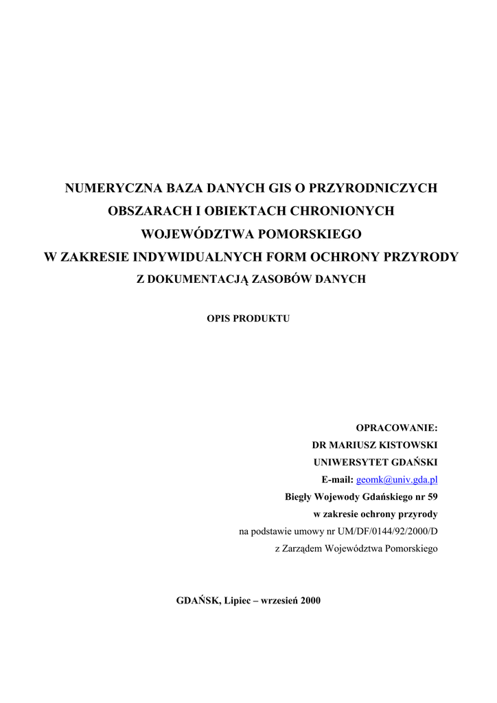 NUMERYCZNA BAZA DANYCH GIS O PRZYRODNICZYCH OBSZARACH I OBIEKTACH CHRONIONYCH WOJEWÓDZTWA POMORSKIEGO W ZAKRESIE INDYWIDUALNYCH FORM OCHRONY PRZYRODY Z DOKUMENTACJĄ ZASOBÓW DANYCH OPIS PRODUKTU OPRACOWANIE: DR MARIUSZ KISTOWSKI UNIWERSYTET GDAŃSKI E-mail: [email protected] Biegły Wojewody Gdańskiego nr 59 w zakresie ochrony przyrody na podstawie umowy nr UM/DF/0144/92/2000/D z Zarządem Województwa Pomorskiego GDAŃSK, Lipiec – wrzesień 2000 SPIS TREŚCI 1. WPROWADZENIE .................................................................................... 2 2. ZAKRES BAZY DANYCH ...................................................................... 3 3.1. Graficzna baza danych ......................................................................... 4 3.2. Tekstowa baza danych ......................................................................... 5 3. ŹRÓDŁA DANYCH .................................................................................. 9 ZAŁĄCZNIKI TABELARYCZNE • Pomniki przyrody utworzone przez administrację wojewódzką – baza tekstowa warstwy POMN_WOJ • Pomniki przyrody utworzone przez rady gmin - baza tekstowa warstwy POMN_GMI • Stanowiska bobrów – baza tekstowa warstwy STAN_BOBR • Chronione gniazda ptaków - baza tekstowa warstwy GNIAZDA • Aleje - baza tekstowa warstwy ALEJE • Użytki ekologiczne utworzone przez Wojewodów - baza tekstowa warstwy UZYTKI_WOJ • Użytki ekologiczne utworzone przez rady gmin - baza tekstowa warstwy UZYTKI_GMI • Stanowiska dokumentacyjne przyrody nieożywionej - baza tekstowa warstwy STAN_DOKUM • Zespoły przyrodniczo – krajobrazowe - baza tekstowa warstwy ZESP_PRZY_KRAJ ZAŁĄCZNIKI KARTOGRAFICZNE • Pomniki przyrody województwa pomorskiego na tle granic powiatów – stan na 30.09.2000 • Stanowiska bobra, wydry, chronione gniazda ptaków oraz ich strefy ochronne woj. pomorskiego na tle sieci wodnej – stan na 30.09.2000 • Użytki ekologiczne województwa pomorskiego na tle granic powiatów – stan na 30.09.2000 • Stanowiska dokumentacyjne przyrody nieożywionej, zespoły przyrodniczo – krajobrazowe i aleje pomnikowe woj. pomorskiego. 1 1.WPROWADZENIE Opracowanie niniejsze, wykonane na zlecenie Zarządu Województwa Pomorskiego zawiera dane, które docelowe mają stać się jednym z elementów zasobu Systemu Informacji o Terenie Województwa Pomorskiego. Stanowi ono uzupełnienie zasobu dotyczącego wielkoobszarowych form ochrony przyrody województwa, w zakresie indywidualnych form ochrony przyrody oraz wybranych elementów ochrony gatunkowej. W świetle Ustawy o Ochronie Przyrody z 1991 do indywidualnych form ochrony przyrody zalicza się: • Pomniki przyrody; • Stanowiska dokumentacyjne przyrody nieożywionej; • Użytki ekologiczne; • Zespoły przyrodniczo-krajobrazowe. Ochronę gatunkową, oprócz zapisów legislacyjnych odnoszących się bezpośrednio do konkretnych gatunków, realizuję się także poprzez ochronę miejsc i obszarów rozrodu oraz regularnego przebywania chronionych gatunków ptaków. Wymienione formy ochrony przyrody mogą być wprowadzane aktami prawnymi wydawanymi zarówno na szczeblu wojewódzkim (zarządzenia Wojewody), jak i na szczeblu gminnym (uchwały rad gmin). W praktyce, na obszarze województwa pomorskiego, w sposób masowy na szczeblu gminnym były tworzone tylko pomniki przyrody oraz użytki ekologiczne. Sytuacja ta znalazła odbicie w zawartości opracowanej bazy danych GIS, gdzie dla tych dwóch typów form ochrony wykonano odrębne warstwy dla obiektów utworzonych na szczeblu wojewódzkim i na gminnym. Numeryczna baza danych została wykonana przy użyciu oprogramowania GIS MapInfo 5.0., a następnie przekonwertowana na format oprogramowania GIS ArcView 3.1. Baza składa się z warstw informacji graficznej oraz referencyjnych informacji opisowych. Graficzna baza danych została wykonana w formie warstw wektorowych ze szczegółowością odpowiadającą skali 1:50.000, na tle rastrowych map topograficznych w tej podziałce w układzie współrzędnych 1942 zarejestrowanych w układzie współrzędnych prostokątnych płaskich 1992/19. Opracowany materiał przekazano na CD w postaci numerycznej w formatach obu typów oprogramowania GIS dla Windows oraz tekst w edytorze WORD 97 dla Windows. Dodatkowo opracowaną bazę przekazano w formie wydruków map z danymi graficznymi i tabel z danymi opisowymi (wydrukowanymi spod oprogramowania Excel 97 dla Windows) oraz niniejszego opisu produktu. 2 Źródła dla konstrukcji bazy danych stanowiły zasoby zgromadzone u Wojewódzkiego Konserwatora Przyrody w Pomorskim Urzędzie Wojewódzkim w Gdańsku oraz w filii terenowej Urzędu w Słupsku, akty prawne dotyczące utworzenia charakteryzowanych form ochrony przyrody oraz własne opracowania i wizje terenowe autora. Punkt wyjścia dla wykonania warstwy dotyczącej pomników przyrody utworzonych przez administrację wojewódzką oraz warstw dotyczących ochrony gatunkowej zwierząt stanowiło opracowanie „Cyfrowa baza danych przyrodniczych obszarów i obiektów chronionych województwa gdańskiego” wykonane w 1994 roku na zlecenie Wydziału Ochrony Środowiska Urzędu Wojewódzkiego w Gdańsku przez zespół pod kierunkiem autora niniejszego opracowania. Zakres opisowych baz danych jest nieco szerszy niż zakres przyjęty umową, gdyż autor jednocześnie z wykonaniem niniejszego opracowania realizował prace porządkujące zasób Wojewódzkiego Konserwatora Przyrody dotyczący indywidualnych form ochrony przyrody, w szczególności użytków ekologicznych. Informacje zawarte w opracowanej bazie danych pod względem merytorycznym znajdują się w gestii Wojewódzkiego Konserwatora Przyrody w Gdańsku. Zastrzega on sobie bezwarunkowe prawo do nieujawniania żadnym podmiotom zewnętrznym w stosunku do Pomorskiego Urzędu Wojewódzkiego oraz Urzędu Marszałkowskiego Województwa Pomorskiego tak oryginalnych, jak i przetworzonych informacji dotyczących stan