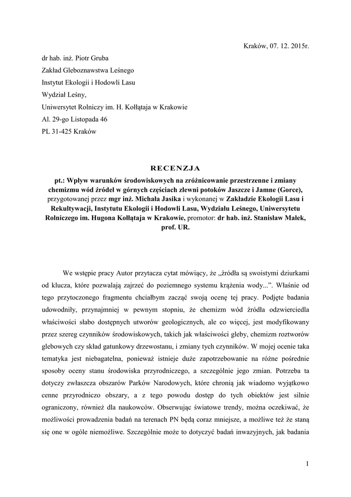 Kraków, 07. 12. 2015r. dr hab. inż. Piotr Gruba Zakład Gleboznawstwa Leśnego Instytut Ekologii i Hodowli Lasu Wydział Leśny, Uniwersytet Rolniczy im. H. Kołłątaja w Krakowie Al. 29-go Listopada 46 PL 31-425 Kraków RECENZJA pt.: Wpływ warunków środowiskowych na zróżnicowanie przestrzenne i zmiany chemizmu wód źródeł w górnych częściach zlewni potoków Jaszcze i Jamne (Gorce), przygotowanej przez mgr inż. Michała Jasika i wykonanej w Zakładzie Ekologii Lasu i Rekultywacji, Instytutu Ekologii i Hodowli Lasu, Wydziału Leśnego, Uniwersytetu Rolniczego im. Hugona Kołłątaja w Krakowie, promotor: dr hab. inż. Stanisław Małek, prof. UR. We wstępie pracy Autor przytacza cytat mówiący, że „źródła są swoistymi dziurkami od klucza, które pozwalają zajrzeć do poziemnego systemu krążenia wody...”. Właśnie od tego przytoczonego fragmentu chciałbym zacząć swoją ocenę tej pracy. Podjęte badania udowodniły, przynajmniej w pewnym stopniu, że chemizm wód źródła odzwierciedla właściwości słabo dostępnych utworów geologicznych, ale co więcej, jest modyfikowany przez szereg czynników środowiskowych, takich jak właściwości gleby, chemizm roztworów glebowych czy skład gatunkowy drzewostanu, i zmiany tych czynników. W mojej ocenie taka tematyka jest niebagatelna, ponieważ istnieje duże zapotrzebowanie na różne pośrednie sposoby oceny stanu środowiska przyrodniczego, a szczególnie jego zmian. Potrzeba ta dotyczy zwłaszcza obszarów Parków Narodowych, które chronią jak wiadomo wyjątkowo cenne przyrodniczo obszary, a z tego powodu dostęp do tych obiektów jest silnie ograniczony, również dla naukowców. Obserwując światowe trendy, można oczekiwać, że możliwości prowadzenia badań na terenach PN będą coraz mniejsze, a możliwe też że staną się one w ogóle niemożliwe. Szczególnie może to dotyczyć badań inwazyjnych, jak badania 1 gleboznawcze lub geologiczne. Nie powinno zatem dziwić, że postawiony w tej pracy cel badań uważam za bardzo mocną, jeśli nie najmocniejszą stronę przedłożonej pracy. Uwzględniając to, że w rozprawie jest postawiona jedna zasadnicza hipoteza badawcza, a ilość analiz relatywnie niewielka, to pracę można określić jako dość prostą. Z drugiej jednak strony pozyskanie znacznej ilości próbek było z pewnością bardzo pracochłonne, a opracowanie wyników jest szczegółowe. Praca ma objętość 102 stron w tym 10 stron załączników. Składa się z 7 rozdziałów oraz wykazu literatury. Przeciętnej długości „Wstęp” uzasadnia potrzebę podjęcia badań, wprowadza czytelnika w problematykę pracy aby w końcu przedstawić hipotezę badawczą. W drugim rozdziale Autor opisuje stan obecnych badań, skupiając się na problematyce klasyfikacji źródeł, następnie omawia znane badania dotyczące wpływu warunków środowiska na chemizm wód źródeł, aby o ostatniej części przybliżyć stan badań hydrologicznych w Gorcach. Rozdział trzeci jest poświęcony omówieniu terenu badań tj. położenia badanych zlewni, rzeźby terenu, warunków klimatycznych, budowy geologicznej, gleb i hydrografii. W rozdziale czwartym, zatytułowanym „Metodyka” opisano przeprowadzone prace terenowe, laboratoryjne i kameralne, w tym zastosowane procedury statystyczne. Najobszerniejszy rozdział „Wyniki badań, mieszczący się na 42 stronach, rozpoczyna się od omówienia zróżnicowania przestrzennego i sezonowego wód, następnie Autor dokonuje klasyfikacji hydrogeochemicznej źródeł i prezentuje ich zmienność czasową (w tabeli) i przestrzenną (na rycinach). W dalszej kolejności omawiana jest zmienność chemizmu źródeł, tj. zmienność przewodności, pH, mineralizacji, zawartości kationów (Ca, Mg, Na, K) i anionów (HCO3, SO4, NO3, Cl). Zachowano tu następujący schemat prezentacji wyników: w pierwszej kolejności zamieszczona jest tabela zawierająca statystyki ogólne, ale uwzględniająca również zmienność sezonową, następnie dwie ryciny prezentujące zmienność przestrzenną w ujęciu wartości bezwzględnych i wartości względnych (%). Prezentacja wyników dla każdej z wymienionych właściwości zakończona jest dwoma wykresami typu ramka-wąsy porównujących badane zlewnie w kontekście sezonowym. Wyniki badań porównawczych, a dotyczących wpływu czynników środowiskowych na chemizm wód źródeł w pierwszej kolejności przedstawiono w formie klarownych wykresów typu ramka-wąsy, na których (podobnie jak w całej pracy) prezentowano medianę, 25 i 75 percentyl oraz wartości maksymalne i minimalne. Druga część tego rozdziału to szczegółowo omówione wyniki analizy PCA. Zwięzła „Dyskusja wyników” jest zawarta na nieco ponad siedmiu stronach. 2 Omówiono tu, analogicznie do kolejności w rozdziale „Wyniki badań”: wskaźniki krenologiczne, odczyn, przewodność, klasyfikację hydrochemiczną, itd., a także wpływ składu gatunkowego na chemizm wód źródeł. Dyskusja była w głównej mierze oparta na porównaniach do wyników badań innych autorów oraz próbie kompleksowego wyjaśnienia obserwowanych zależności. W rozdziale „Podsumowanie i wnioski” Autor, kierując się dużą ostrożnością, sformułował jedynie pięć punktów. Pracę zamyka spis literatury zawierający 116 pozycji, w czym, co było dla mnie nieco zaskakujące, tylko 11 pozycji to pozycje napisane przez autorów spoza kraju. Załącznik pracy to dziesięć stron tabel zawierających zestawienia statystyczne. Kontynuując ocenę ogólną chcę podkreślić co następuje: - w pracy postawiono zrozumiałą hipotezę badawczą wynikającą z luk w dotychczasowej wiedzy i aktualnego zapotrzebowania na badania, - metodyka prac terenowych, laboratoryjnych oraz sposób opracowania statystycznego nie budzą większych zastrzeżeń, - omówienie wyników badań oraz ich dyskusja w sposób konsekwentny nawiązuje do postawionej hipotezy badawczej