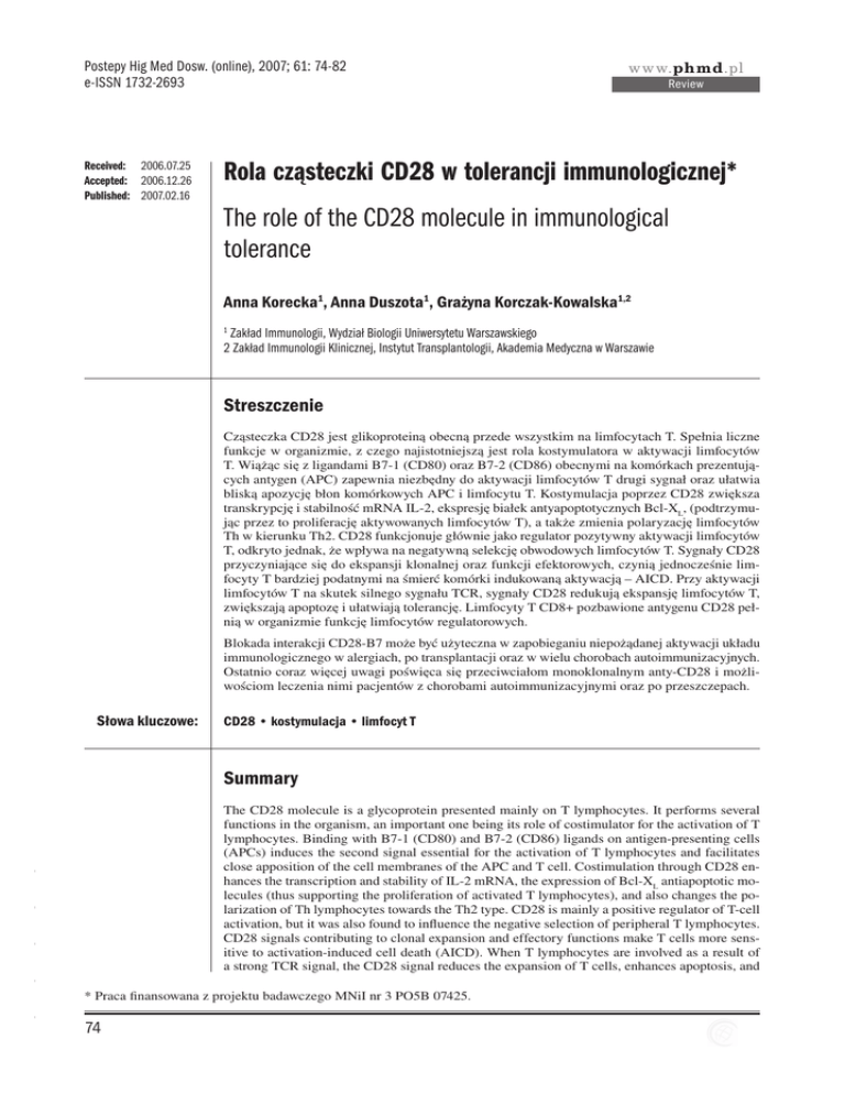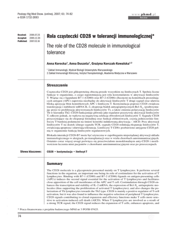 Postepy Hig Med Dosw. (online), 2007; 61: 74-82 e-ISSN 1732-2693 Received: 2006.07.25 Accepted: 2006.12.26 Published: 2007.02.16 www.phmd.pl Review Rola cząsteczki CD28 w tolerancji immunologicznej* The role of the CD28 molecule in immunological tolerance Anna Korecka1, Anna Duszota1, Grażyna Korczak-Kowalska1,2 1 Zakład Immunologii, Wydział Biologii Uniwersytetu Warszawskiego 2 Zakład Immunologii Klinicznej, Instytut Transplantologii, Akademia Medyczna w Warszawie Streszczenie Cząsteczka CD28 jest glikoproteiną obecną przede wszystkim na limfocytach T. Spełnia liczne funkcje w organizmie, z czego najistotniejszą jest rola kostymulatora w aktywacji limfocytów T. Wiążąc się z ligandami B7-1 (CD80) oraz B7-2 (CD86) obecnymi na komórkach prezentujących antygen (APC) zapewnia niezbędny do aktywacji limfocytów T drugi sygnał oraz ułatwia bliską apozycję błon komórkowych APC i limfocytu T. Kostymulacja poprzez CD28 zwiększa transkrypcję i stabilność mRNA IL-2, ekspresję białek antyapoptotycznych Bcl-XL, (podtrzymując przez to proliferację aktywowanych limfocytów T), a także zmienia polaryzację limfocytów Th w kierunku Th2. CD28 funkcjonuje głównie jako regulator pozytywny aktywacji limfocytów T, odkryto jednak, że wpływa na negatywną selekcję obwodowych limfocytów T. Sygnały CD28 przyczyniające się do ekspansji klonalnej oraz funkcji efektorowych, czynią jednocześnie limfocyty T bardziej podatnymi na śmierć komórki indukowaną aktywacją – AICD. Przy aktywacji limfocytów T na skutek silnego sygnału TCR, sygnały CD28 redukują ekspansję limfocytów T, zwiększają apoptozę i ułatwiają tolerancję. Limfocyty T CD8+ pozbawione antygenu CD28 pełnią w organizmie funkcję limfocytów regulatorowych. Blokada interakcji CD28-B7 może być użyteczna w zapobieganiu niepożądanej aktywacji układu immunologicznego w alergiach, po transplantacji oraz w wielu chorobach autoimmunizacyjnych. Ostatnio coraz więcej uwagi poświęca się przeciwciałom monoklonalnym anty-CD28 i możliwościom leczenia nimi pacjentów z chorobami autoimmunizacyjnymi oraz po przeszczepach. Słowa kluczowe: CD28 • kostymulacja • limfocyt T Summary - - - - The CD28 molecule is a glycoprotein presented mainly on T lymphocytes. It performs several functions in the organism, an important one being its role of costimulator for the activation of T lymphocytes. Binding with B7-1 (CD80) and B7-2 (CD86) ligands on antigen-presenting cells (APCs) induces the second signal essential for the activation of T lymphocytes and facilitates close apposition of the cell membranes of the APC and T cell. Costimulation through CD28 enhances the transcription and stability of IL-2 mRNA, the expression of Bcl-XL antiapoptotic molecules (thus supporting the proliferation of activated T lymphocytes), and also changes the polarization of Th lymphocytes towards the Th2 type. CD28 is mainly a positive regulator of T-cell activation, but it was also found to influence the negative selection of peripheral T lymphocytes. CD28 signals contributing to clonal expansion and effectory functions make T cells more sensitive to activation-induced cell death (AICD). When T lymphocytes are involved as a result of a strong TCR signal, the CD28 signal reduces the expansion of T cells, enhances apoptosis, and - * Praca finansowana z projektu badawczego MNiI nr 3 PO5B 07425. 74 Korecka A. i wsp. – Rola cząsteczki CD28 w tolerancji immunologicznej facilitates tolerance. CD8+ T lymphocytes, which lack the CD28 marker, play the role of regulatory cells. Blockade of the CD28-B7 interaction could be useful in preventing undesirable activation of the immune system in allergies, after transplantation, and in autoimmune diseases. Recently, more and more attention is being paid to anti-CD28 monoclonal antibodies and the possibilities of treating patients with autoimmune diseases and patients after transplantation. Key words: Full-text PDF: Word count: Tables: Figures: References: Adres autorki: Wykaz skrótów: CD28 • costimulation • lymphocyte T http://www.phmd.pl/pub/phmd/vol_61/10123.pdf 4798 — — 41 mgr Anna Korecka, Zakład Immunologii, Wydział Biologii Uniwersytetu Warszawskiego, ul. Miecznikowa 1, 02-096 Warszawa; e-mail: [email protected] APC – komórka prezentująca antygen (antigen presenting cell); DC – komórka dendrytyczna (dendritic cell); IFN – interferon; IL – interleukina; mAb – przeciwciało monoklonalne; MHC – główny układ zgodności tkankowej (major histocompatibility complex); TCR – receptor limfocytu T (T cell receptor); Th – limfocyt T pomocniczy; TNF – czynnik martwicy nowotworu (tumor necrosis factor). 1. WPROWADZENIE Cząsteczka CD28 (początkowo znana jako Tp44) po raz pierwszy została scharakteryzowana w 1980 r. przez Hansena jako nowy antygen powierzchniowy limfocytów T [9]. Dalsze badania ujawniły jego kostymulującą rolę w aktywacji tych komórek. CD28 to glikoproteina o masie 44 kDa, wiążąca się z ligandami B7-1 (CD80) oraz B7-2 (CD86) obecnymi na komórkach prezentujących antygen – APC (makrofagi, komórki dendrytyczne, limfocyty B). CD28 pełni liczne role i ma ogromne znaczenie w sprawnym funkcjonowaniu systemu immunologicznego [9]. CD28 wywiera bezpośrednie działanie na progresję cyklu komórkowego, aktywację czynników transkrypcyjnych NF-AT, NF-kB, AP-1, MYC, FOS i JUN, przebudowę chromatyny i demetylację DNA [1]. Pośrednio wpływa na różnicowanie cytotoksycznych limfocytów T, ekspansję klonalną, ekspresję innych immunoreceptorów. Zapobiega reakcji nadwrażliwości. Zmienia polaryzację limfocytów Th na korzyść Th2. W odpowiedzi humoralnej wpływa na przełączanie izotypu oraz hipermutacje somatyczne [1]. 2.1. Struktura molekuły CD28 Cząsteczka CD28 należy do nadrodziny immunoglobulin. Homologi ludzkiego genu kodującego to białko wykryto u wielu zwierząt, w tym u myszy, gdzie występuje do 77% podobieństwa z l