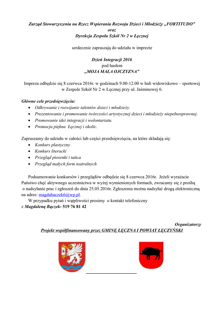 Zarząd Stowarzyszenia na Rzecz Wspierania Rozwoju Dzieci i Młodzieży „FORTITUDO” oraz Dyrekcja Zespołu Szkół Nr 2 w Łęcznej serdecznie zapraszają do udziału w imprezie Dzień Integracji 2016 pod hasłem ,,MOJA MAŁA OJCZYZNA” Impreza odbędzie się 8 czerwca 2016r. w godzinach 9.00-12.00 w hali widowiskowo – sportowej w Zespole Szkół Nr 2 w Łęcznej przy ul. Jaśminowej 6. Główne cele przedsięwzięcia: Odkrywanie i rozwijanie talentów dzieci i młodzieży. Prezentowanie i promowanie twórczości artystycznej dzieci i młodzieży niepełnosprawnej. Promowanie idei integracji i wolontariatu. Promocja piękna Łęcznej i okolic. Zapraszamy do udziału w całości lub części przedsięwzięcia, na które składają się: Konkurs plastyczny Konkurs literacki Przegląd piosenki i tańca Przegląd małych form teatralnych Podsumowanie konkursów i przeglądów odbędzie się 8 czerwca 2016r. Jeżeli wyrażacie Państwo chęć aktywnego uczestnictwa w wyżej wymienionych formach, zwracamy się z prośbą o nadsyłanie prac i zgłoszeń do dnia 25.05.2016r. Zgłoszenia można nadsyłać drogą elektroniczną na adres: [email protected]. W przypadku pytań i wątpliwości prosimy o kontakt telefoniczny z Magdaleną Bączek- 519 76 81 42 Organizatorzy Projekt współfinansowany przez GMINĘ ŁĘCZNA I POWIAT ŁĘCZYŃSKI KONKURS PLASTYCZNY Temat pracy: „MOJA MAŁA OJCZYZNA” Cel konkursu: Promocja miasta Łęczna i okolic. Odkrywanie i rozwijanie talentów, zdolności dzieci i młodzieży. Regulamin konkursu: Przedmiotem konkursu jest praca plastyczna wykonana dowolną techniką,związaną z tematem. Konkurs skierowany jest do uczniów klas I - VI szkoły podstawowej i I- III gimnazjum Format pracy: A3 lub A2 Każdy uczeń może wykonać pracę indywidualnie bądź grupowo ( w zależności od możliwości ucznia) Prace powinny być czytelnie opisane na odwrocie imieniem i nazwiskiem autora, ponadto powinny się tam znaleźć informacje: wiek autora, klasa do której uczęszcza, rodzaj niepełnosprawności( informacja tylko dla organizatorów), adres placówki,imię i nazwisko opiekuna artystycznego . Prace prosimy dostarczyć do dnia 25.05.2016r. do sekretariatu Zespołu Szkół nr 2 w Łęcznej. Prace dostarczone po wyznaczonym terminie nie będę uwzględniane w konkursie. Udział w konkursie jest jednoczesnym wyrażeniem zgody na umieszczenie pracy na wystawie pokonkursowej i publikację prac w Internecie. odczytanie wyników konkursu nastąpi podczas Dnia Integracji 2016. PRZEGLĄD PIOSENKI I TAŃCA Cele przeglądu: Prezentacja dokonań artystycznych dzieci i młodzieży Wymiana pomysłów i doświadczeń wykonawców Promowanie idei integracji przez dziecięcą i młodzieżową twórczość artystyczną Regulamin przeglądu: Przegląd skierowany jest do uczniów szkoły podstawowej i gimnazjum – soliści, zespoły wokalne i taneczne Wykonawcy prezentują piosenki lub tańce o dowolnej tematyce Jedna placówka może zgłosić 1 zespół taneczny lub 1 solistę. Kartę zgłoszeniową oraz podkład muzyczny w formacie mp3 prosimy przesłać na adres [email protected] do dnia 25.05.2016r KONKURS LITERACKI Cele konkursu: Rozbudzanie wyobraźni uczniów Zachęcanie do pokonywania trudności w realizacji własnych marzeń Budzenie w młodzieży wrażliwości, tolerancji, potrzeby otwarcia na drugiego człowieka Rozwijanie w uczniach zainteresowań literackich Regulamin przeglądu: Konkurs skierowany jest do uczniów klas VI szkoły podstawowej i I-III gimnazjum. Prace literackie mogą mieć dowolną formę np.: album, folder, opowiadanie, komiks. Temat konkursu : ,,MOJA MAŁA OJCZYZNA” Prace prosimy dostarczyć do 25.05.2016r. do sekretariatu Zespołu Szkół nr 2 w Łęcznej. Prace dostarczone po wyznaczonym terminie nie będę uwzględniane w konkursie. PRZEGLĄD MAŁYCH FORM TEATRALNYCH Cele przeglądu: Budzenie w młodzieży wrażliwości, tolerancji, potrzeby otwarcia na drugiego człowieka. Rozwijanie w uczniach zainteresowań teatralnych. Regulamin przeglądu: Przegląd skierowany jest do uczniów szkoły podstawowej i gimnazjum. Forma teatralna dowolna. Czas trwania spektaklu do 10 minut. Jedna placówka może zgłosić jeden spektakl. Dekoracje i rekwizyty zespół przygotowuje we własnym zakresie. Prosimy o wypełnienie ZGODY NA WYKORZYSTANIE WIZERUNKU DZIECKA. Wypełnione zgody prosimy dostarczyć organizatorom w dniu imprezy. Szczegółowe informacje-Magdalena Bączek -telefon 519 76 81 42 ZGODA NA WYKORZYSTANIE WIZERUNKU DZIECKA …......................................................... Łęczna, dnia.......................... …......................................................... (imię i nazwisko rodzica/opiekuna) Oświadczam, że wyrażam zgodę na umieszczenie zdjęć i materiałów filmowych zawierających wizerunek mojego dziecka zarejestrowany podczas pobyty mojego dziecka na imprezie integracyjnej -Dzień Integracji 2016 w dniu 08.06.2016. Wyrażenie zgody jest jednoznaczne z tym, iż zdjęcia i filmy mogą zostać umieszczone w gablotach, kronikach, w materiałach promocyjnych, gazetkach i na stronie internetowej Zespołu Szkół Nr2 w Łęcznej. Wykorzystanie wizerunku dziecka ma na celu promowanie działalności szkoły oraz osiągnięć i umiejętności dziecka. …...................................................................................................................................... (imię i nazwisko dziecka) Podstawa prawna: 1. Ustawa o ochronie danych osobowych (tekst jedn.: Dz. U. Z 2002 nr 101, poz. 926ze zm.); 2. Ustawa o prawie autorskim i prawach pokrewnych ( tekst jedn. : Dz.U.z 2006r. Nr 90, poz. 631 ze zm.) ….............................................................................................................................................................................. ZGODA NA WYKORZYSTANIE WIZERUNKU DZIECKA …......................................................... Łęczna, dnia...............