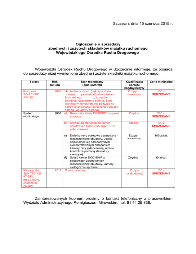 Szczecin, dnia 15 czerwca 2015 r. Ogłoszenie o sprzedaży zbędnych i zużytych składników majątku ruchomego Wojewódzkiego Ośrodka Ruchu Drogowego Wojewódzki Ośrodek Ruchu Drogowego w Szczecinie informuje, że posiada do sprzedaży niżej wymienione zbędne i zużyte składniki majątku ruchomego. Sprzęt Komputer SONY VAIO AW11Z System monitoringu Rok zakupu Stan techniczny (opis usterek) 2008 Uszkodzony ekran (pęknięty - brak obrazu) i pęknięta obudowa ekranu. Brak jednego z 2 dysków twardych, uszkodzona bateria. Stan techniczny komputera nie pozwala na dalszą eksploatację (konieczna wymiana ekranu i obudowy ekranu). 2008 a) Rejestrator Ganz DR16NRT - w pełni sprawny. b) Klawiatura sterująca do kamer obrotowych Ganz ZCA-SC201 - w pełni sprawna. c) Klimatyzator Split TSC 126 9T BTV, moc 3100W, chłodzenie 2600W Dwie kamery obrotowe zewnętrzne rozszczelnione obudowy, usterki objawiające się samoczynnym niekontrolowanym obracaniem kamery przy jednoczesnej utracie kontroli za pomocą klawiatury sterującej. d) Sześć kamer DCC-501F w obudowach zewnętrznych rozszczelnione obudowy, kamery elektrycznie sprawne. 2011 Rozszczelniony Kwalifikacja sprzętu zbędny/zużyty Zużyty (uszkodzony) Cena minimalna Zbędny 300 zł SPRZEDANE Zbędny 100 zł SPRZEDANE Zużyty 100 zł/szt. 100 zł SPRZEDANE (uszkodzony) Zbędny Zużyty (uszkodzony) 30 zł/szt. 130 zł SPRZEDANE Zainteresowanych kupnem prosimy o kontakt telefoniczny z pracownikiem Wydziału Administracyjnego Remigiuszem Mirowskim, tel. 91 44 25 838.