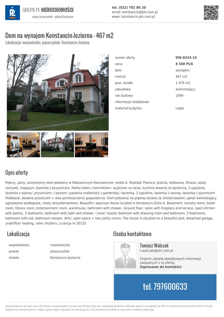 tel. (022) 702 86 20 email: [email protected] www: konstancin.pln.com.pl Dom na wynajem Konstancin-Jeziorna - 467 m2 Lokalizacja: mazowieckie, piaseczyński, Konstancin-Jeziorna numer oferty DW-8243-15 cena 8 500 PLN dom wynajem, metraż 467 m2 pow. działki 1 479 m2 zabudowa wolnostojący rok budowy 1999 informacje dodatkowe materiał budynku cegła Opis oferty Piękny, jasny, przestronny dom położony w Malowniczym Konstancinie- strefa A. Rozkład: Piwnica: pralnia, kotłownia, fitness, pokój rozrywki, magazyn, łazienka z prysznicem, Parter:solon z kominkiem i wyjściem na taras, kuchnia otwarta ze spiżarnią, 3 sypialnie, łazienka z wanną i prysznicem, I poziom: sypialnia małżeńska z garderobą i łązienką, 3 sypialnie, łazienka z wanną. łazienka z pysznicem Poddasze: otwarta przestrzeń + dwa pomieszczenia gospodarcze. Dom położony na pięknej działce ze strodzrzewiem, garaż wolnostojący, ogrzewanie podłogowe, rolety antywłamaniowe. Beautiful, spacious House located in Konstancin-Zone A. Basement: laundry room, boiler room, fitness room, entertainment room, warehouse, bathroom with shower, Ground floor: solon with fireplace and terrace, open kitchen with pantry, 3 bedrooms, bathroom with bath and shower, I level: master bedroom with dressing room and bathroom, 3 bedrooms, bathroom with tub, bathroom shower. Attic: open space + two utility rooms. The house is situated on a beautiful plot, detached garage, underfloor heating, roller shutters. Licencja nr 20155 Lokalizacja Osoba kontaktowa Tomasz Walczak województwo mazowieckie powiat piaseczyński [email protected] miasto Konstancin-Jeziorna Chętnie udzielę dodatkowych informacji związanych z tą ofertą. Zapraszam do kontaktu! tel. 797600633 Zawsze dążymy do tego, aby informacje o proponowanych przez nas ofertach były jak najbardziej dokładne. Niekiedy jednak, ze względu na fakt, iż uzyskujemy je od osób trzecich nie jest możliwe ich zweryfikowanie, wobec czego należy traktować je orientacyjnie i nie stanowią one oferty w rozumieniu kodeksu cywilnego.