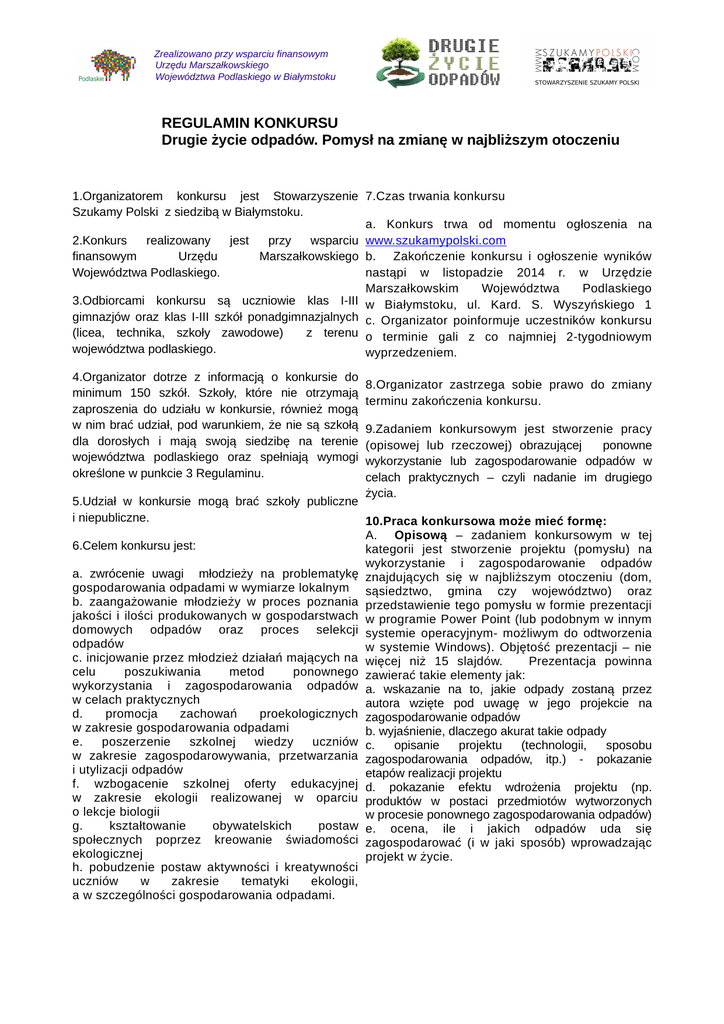 Zrealizowano przy wsparciu finansowym Urzędu Marszałkowskiego Województwa Podlaskiego w Białymstoku REGULAMIN KONKURSU Drugie życie odpadów. Pomysł na zmianę w najbliższym otoczeniu 1.Organizatorem konkursu jest Stowarzyszenie 7.Czas trwania konkursu Szukamy Polski z siedzibą w Białymstoku. a. Konkurs trwa od momentu ogłoszenia na 2.Konkurs realizowany jest przy wsparciu www.szukamypolski.com finansowym Urzędu Marszałkowskiego b. Zakończenie konkursu i ogłoszenie wyników Województwa Podlaskiego. nastąpi w listopadzie 2014 r. w Urzędzie Marszałkowskim Województwa Podlaskiego 3.Odbiorcami konkursu są uczniowie klas I-III w Białymstoku, ul. Kard. S. Wyszyńskiego 1 gimnazjów oraz klas I-III szkół ponadgimnazjalnych c. Organizator poinformuje uczestników konkursu (licea, technika, szkoły zawodowe) z terenu o terminie gali z co najmniej 2-tygodniowym województwa podlaskiego. wyprzedzeniem. 4.Organizator dotrze z informacją o konkursie do minimum 150 szkół. Szkoły, które nie otrzymają zaproszenia do udziału w konkursie, również mogą w nim brać udział, pod warunkiem, że nie są szkołą dla dorosłych i mają swoją siedzibę na terenie województwa podlaskiego oraz spełniają wymogi określone w punkcie 3 Regulaminu. 8.Organizator zastrzega sobie prawo do zmiany terminu zakończenia konkursu. 9.Zadaniem konkursowym jest stworzenie pracy (opisowej lub rzeczowej) obrazującej ponowne wykorzystanie lub zagospodarowanie odpadów w celach praktycznych – czyli nadanie im drugiego życia. 5.Udział w konkursie mogą brać szkoły publiczne i niepubliczne. 10.Praca konkursowa może mieć formę: A. Opisową – zadaniem konkursowym w tej 6.Celem konkursu jest: kategorii jest stworzenie projektu (pomysłu) na wykorzystanie i zagospodarowanie odpadów a. zwrócenie uwagi młodzieży na problematykę znajdujących się w najbliższym otoczeniu (dom, gospodarowania odpadami w wymiarze lokalnym sąsiedztwo, gmina czy województwo) oraz b. zaangażowanie młodzieży w proces poznania przedstawienie tego pomysłu w formie prezentacji jakości i ilości produkowanych w gospodarstwach w programie Power Point (lub podobnym w innym domowych odpadów oraz proces selekcji systemie operacyjnym- możliwym do odtworzenia odpadów w systemie Windows). Objętość prezentacji – nie c. inicjowanie przez młodzież działań mających na więcej niż 15 slajdów. Prezentacja powinna celu poszukiwania metod ponownego zawierać takie elementy jak: wykorzystania i zagospodarowania odpadów a. wskazanie na to, jakie odpady zostaną przez w celach praktycznych autora wzięte pod uwagę w jego projekcie na d. promocja zachowań proekologicznych zagospodarowanie odpadów w zakresie gospodarowania odpadami b. wyjaśnienie, dlaczego akurat takie odpady e. poszerzenie szkolnej wiedzy uczniów c. opisanie projektu (technologii, sposobu w zakresie zagospodarowywania, przetwarzania zagospodarowania odpadów, itp.) - pokazanie i utylizacji odpadów etapów realizacji projektu f. wzbogacenie szkolnej oferty edukacyjnej d. pokazanie efektu wdrożenia projektu (np. w zakresie ekologii realizowanej w oparciu produktów w postaci przedmiotów wytworzonych o lekcje biologii w procesie ponownego zagospodarowania odpadów) g. kształtowanie obywatelskich postaw e. ocena, ile i jakich odpadów uda się społecznych poprzez kreowanie świadomości zagospodarować (i w jaki sposób) wprowadzając ekologicznej projekt w życie. h. pobudzenie postaw aktywności i kreatywności uczniów w zakresie tematyki ekologii, a w szczególności gospodarowania odpadami. Zrealizowano przy wsparciu finansowym Urzędu Marszałkowskiego Województwa Podlaskiego w Białymstoku Do oceny w konkursie będą dopuszczone zarówno te prace, które obrazują pomysł na przetworzenie odpadów w sposób możliwy potencjalnie do zastosowania (np. budowa zakładu wytwarzającego przedmioty z nakrętek, budowa spalarni, itp.), jak też prace wskazujące na technologie, sposoby przetwarzania odpadów jeszcze nieznane i niewykorzystane na świecie. W tej kategorii dodatkowo punktowane będą prace konkursowe, do których zostaną dołączone przedmioty ilustrujące efekt realizacji pomysłu na przetworzenie odpadów (np. przedmiot użytkowy wytworzony z nakrętek w powołanym do życia zakładzie). Załączone przedmioty powinny mieć charakter użytkowy - służyć jako przedmioty codziennego użytku lub ozdobie pomieszczeń. B. Rzeczową – praca plastyczna, przestrzenna, inna z wykorzystaniem odpadów. Prace te muszą mieć charakter użytkowy - służyć mają jako przedmioty codziennego użytku lub ozdobie pomieszczeń, a ich wielkość nie może przekroczyć wymiarów 1mx1mx1m. Prace rzeczowe mogą mieć formę np. plakatu (o dowolnej tematyce: np. pejzaż, martwa natura, portret, abstrakcja, inne), biżuterii, przyborników, pudełek, zabawek, mebli, itp. Dodatkowo taka praca powinna zostać zobrazowana w postaci prezentacji w programie Power Point (lub podobnym w innym systemie operacyjnymmożliwym do odtworzenia w systemie Windows) ukazującej ideę, pomysł, przebieg powstawania i kolejne etapy tworzenia pracy oraz wyjaśnienie i opis dotyczący cech użytkowych pracy. Prezentacja nie może być dłuższa niż 10 slajdów. Do pracy będzie załączona „wizytówka”, w której autor umieści takie informacje jak: rodzaj i ilość odpadów, które zostały wykorzystane do stworzenia pracy oraz wykorzystanie użytkowe przedmiotu w codziennym życiu. pracy do siedziby Organizatora konkursu. 14. Prace należy składać osobiście (w godz. 9.00 – 15.00) ub przesyłać na adres siedziby Stowarzyszenia Szukamy Polski: ul. Młynowa 17, 15-404 Białystok (III piętro) z dopiskiem: Konkurs „Drugie życie odpadów”. 15. Organizator zastrzega sobie prawo do zmiany terminu przyjmowania prac, o czym poinformuje na stronie www.szukamypolski.com. 16. Prace, które wpłynęły po terminie nie będą podlegały ocenie konkursowe