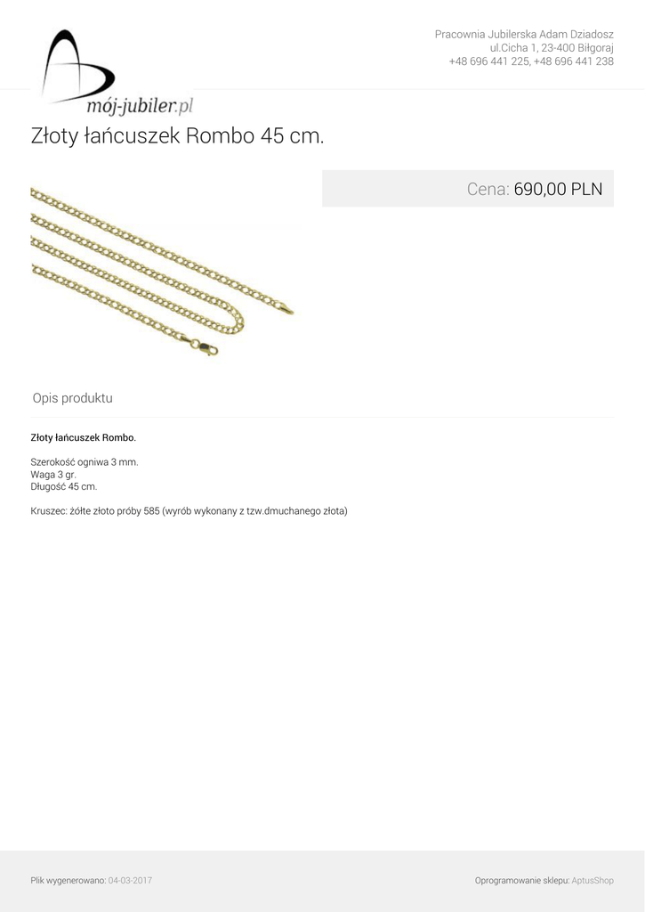 Pracownia Jubilerska Adam Dziadosz ul.Cicha 1, 23-400 Biłgoraj +48 696 441 225, +48 696 441 238 Złoty łańcuszek Rombo 45 cm. Cena: 690,00 PLN Opis produktu Złoty łańcuszek Rombo. Szerokość ogniwa 3 mm. Waga 3 gr. Długość 45 cm. Kruszec: żółte złoto próby 585 (wyrób wykonany z tzw.dmuchanego złota) Plik wygenerowano: 04-03-2017 Powered by TCPDF (www.tcpdf.org) Oprogramowanie sklepu: AptusShop