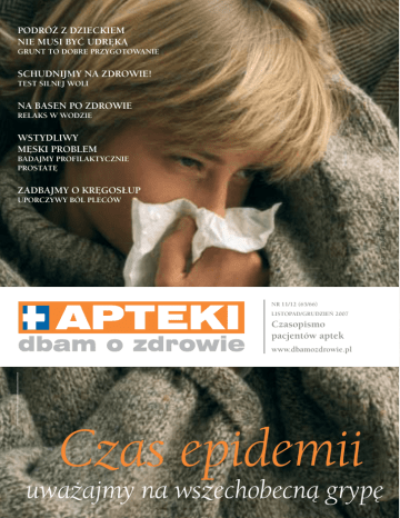 PODRÓŻ Z DZIECKIEM NIE MUSI BYĆ UDRĘKĄ GRUNT TO DOBRE PRZYGOTOWANIE SCHUDNIJMY NA ZDROWIE! TEST SILNEJ WOLI NA BASEN PO ZDROWIE RELAKS W WODZIE WSTYDLIWY MĘSKI PROBLEM BADAJMY PROFILAKTYCZNIE PROSTATĘ foto: Getty Images\Flash Press Media ZADBAJMY O KRĘGOSŁUP UPORCZYWY BÓL PLECÓW NR 11/12 7/8 (61/62) (65/66) LIPIEC/SIERPIEŃ 2007 2007 LISTOPAD/GRUDZIEŃ Czasopismo pacjentów aptek www.dbamozdrowie.pl Czas epidemii uważajmy na wszechobecną grypę infolinia: 0-800 APTEKI [278-354] www.dbamozdrowie.pl 1 2 infolinia: 0-800 APTEKI [278-354] www.dbamozdrowie.pl 1 Aktualności PROMOCJA DO KOŃCA ROKU SZANOWNI PAŃSTWO! Przygotowaliśmy dla Państwa PROMOCJE DO KOŃCA ROKU, która pozwoli szybciej uzbierać punkty na wybraną nagrodę z przygotowanego dla Państwa katalogu. Juz teraz aż do końca roku 1 pkt można uzyskać już za 3 zł., przy zakupie leków nie refundowanych. Zachęcamy do dalszego uczestnictwa w programie. W razie pytań i wątpliwości prosimy o kontakt z infolinią 0 800 278 354 (APTEKI). ZAPRASZAMY DO ZAKUPU NOWOŚCI KSIĘGARNI WYSYŁKOWEJ PROGRAMU DBAM O ZDROWIE: • „O DZIEWCZĘTACH DLA DZIEWCZĄT” – to znakomita książka dla dziewcząt w trudnym okresie dojrzewania. Odpowiada na wiele ważnych pytań, które młode kobiety wstydzą się zadać rodzicom. Ten poradnik pomoże uporządkować wiedzę w każdej najważniejszej dla dziewcząt dziedzinie. • „O CHŁOPCACH DLA CHŁOPCÓW” – to poradnik napisany przez lekarza seksuologa, który przystępnie, z wielkim taktem i humorem wprowadza młodego czytelnika w tajniki okresu dojrzewania. Tajemnice dojrzewania, miłość, popęd seksualny, metody antykoncepcji – to niektóre z tematów omówionych w tej książce. Zamówienia prosimy przesyłać na formularzu zamieszczonym wewnątrz gazetki lub na stronie internetowej www.dbamozdrowie.pl 2 Od redakcji DRODZY CZYTELNICY W ostatnim tegorocznym numerze „Dbam o Zdrowie” zachęcamy do zapoznania się z artykułem, jakże popularnym na przełomie jesieni i zimy na temat grypy. Dotyka właściwie każdego z nas, a jeśli porządnie jej nie wyleczymy musimy liczyć się z poważnymi skutkami ubocznymi. Więcej w artykule „Jesienna choroba – grypa” W kąciku rodzica doradzamy młodym mamom, jak bezpiecznie wybrać się ze swoją pociechą w podróż. A przecież święta i ferie zimowe sprzyjają wyjazdom i nie ma żadnych przeciwwskazań, aby zabrać na nie nawet niemowlaka. Okres przedświąteczny, który właśnie się rozpoczął nie powinien w codziennej bieganinie przysłonić nam konieczności zadbania o siebie i zapewnienia sobie choć chwili relaksu. Dlatego polecamy kolejny rodzaj aktywności, która poprawi samopoczucie każdemu, bez względu na wiek. Basen to doskonałe miejsce na wypoczynek połączony z aktywnym sposobem spędzenia wolnego czasu. Można tutaj robić prawie wszystko – począwszy od pływania w basenie, poprzez świetną zabawę na zjeżdżalniach, kończąc zaś na relaksie podczas masażu wodnego. I nawet w najbardziej zimny, wietrzny jesienno – zimowy dzień możemy bez problemu korzystać z tej formy aktywnego wypoczynku. Wszystkim Uczestnikom programu „Dbam o Zdrowie” i wiernym Czytelnikom, życzymy jak najzdrowszych i najpogodniejszych Świąt Bożego Narodzenia oraz wszystkiego co najlepsze w nadchodzącym 2008 roku! Redakcja Przewodnik po aptece „Dbam o zdrowie” - czasopismo pacjentów aptek Wydawca: Bez Recepty Sp. z o.o. (spółka Polskiej Grupy Farmaceutycznej), 91-342 Łódź, ul. Zbąszyńska 3, tel. (0 42) 613 34 44. Prezes wydawnictwa: Wojciech Rosicki. Redakcja: adres jak wyżej, redaguje zespół: Redaktor Naczelny: Krzysztof Chrzanowski, Sekretarz Redakcji: Grzegorz Dróżdż, Redaktor Graficzny: Izabela Raduszewska. Dział Reklamy: Tomasz Cieślak, tel. (0 42) 613 35 83, 0 601 075 736, e-mail: [email protected], Sebastian Stanisławski, tel. (0 42) 613 35 89, e-mail: [email protected]. Skład: JURCZYK DESIGN, www.jurczykdesign.com. Zdjęcia: FPM, Indigo. Nadzór farmaceutyczny: Jerzy Stasiak, Druk: Drukarnia Prasowa SA, Łódź Redakcja nie odpowiada za treść reklam. Nie zwraca materiałów niezamówionych. Zastrzega sobie prawo do dokonywania skrótów redakcyjnych, nadawania tytułów i śródtytułów. Za treść opisów preparatów odpowiedzialność ponoszą Zleceniodawcy. infolinia: 0-800 APTEKI [278-354] www.dbamozdrowie.pl SPIS TREŚCI Z OKŁADKI: GRYPA - JESIENNA CHOROBA 8 MĘSKA SPRAWA 16 SCHUDNIJMY NA ZDROWIE 22 ZDROWIE, RELAKS 36 I ZABAWA NA BASENIE PODRÓŻ Z DZIECKIEM 46 NIE MUSI BYĆ UDRĘKĄ UPORCZYWY BÓL PLECÓW 56 ŚWIATOWY DZIEŃ SERCA 4 CHRYPKA BYWA GROŹNA 32 CORAZ WIĘCEJ MOŻLIWOŚCI DEPILACJI CIAŁA 60 POPRAWNE ODŻYWIANIE W MIAŻDŻYCY 68 PRZYGOTOWUJEMY SIĘ DO ZIMOWEGO SZALEŃSTWA 82 LISTA LAUREATÓW 87 KRZYŻÓWKA 90 PORADNIA 92 KSIĘGARNIA 96 3 POD PATRONATEM „BEZ RECEPTY” I „APTEK DBAM O ZDROWIE” Światowy Dzień Serca SCHUDNIJ, RZUĆ PALENIE, BĄDŹ POGODNY, ZACZNIJ SIĘ RUSZAĆ! – NAMAWIALI KARDIOLODZY PODCZAS CENTRALNYCH OBCHODÓW POLSKIEJ EDYCJI ŚWIATOWEGO DNIA SERCA, KTÓRE TYM RAZEM ODBYŁY SIĘ W ŁODZI. ZDROWY STYL ŻYCIA PROMOWALI TEŻ ZNANI ARTYŚCI, SPORTOWCY I DZIENNIKARZE. W tym roku już po raz szósty obchodziliśmy w naszym kraju Światowy Dzień Serca. 30 września w łódzkiej Manufakturze propagowana była głównie profilaktyka chorób serca. Festyny Światowego Dnia Serca odbywały się na całym świecie pod hasłem: „Razem po zdrowe serca” – Team up for healthy hearts! Światowy Dzień Serca obchodzony jest z inicjatywy World Heart Federation, w ostatnią niedzielę września w ponad 100 krajach na całym świecie. Jego celem jest przekazywanie wiedzy o tym, 4 co robić, aby serce było w dobrej kondycji. Jest o co walczyć, bo choroby serca i układu krążenia są najczęstszą przyczyną zgonów na świecie. Szacuje się, że z tego powodu umiera rocznie 17,5 miliona ludzi – aż 80% w nisko i średnio rozwinię