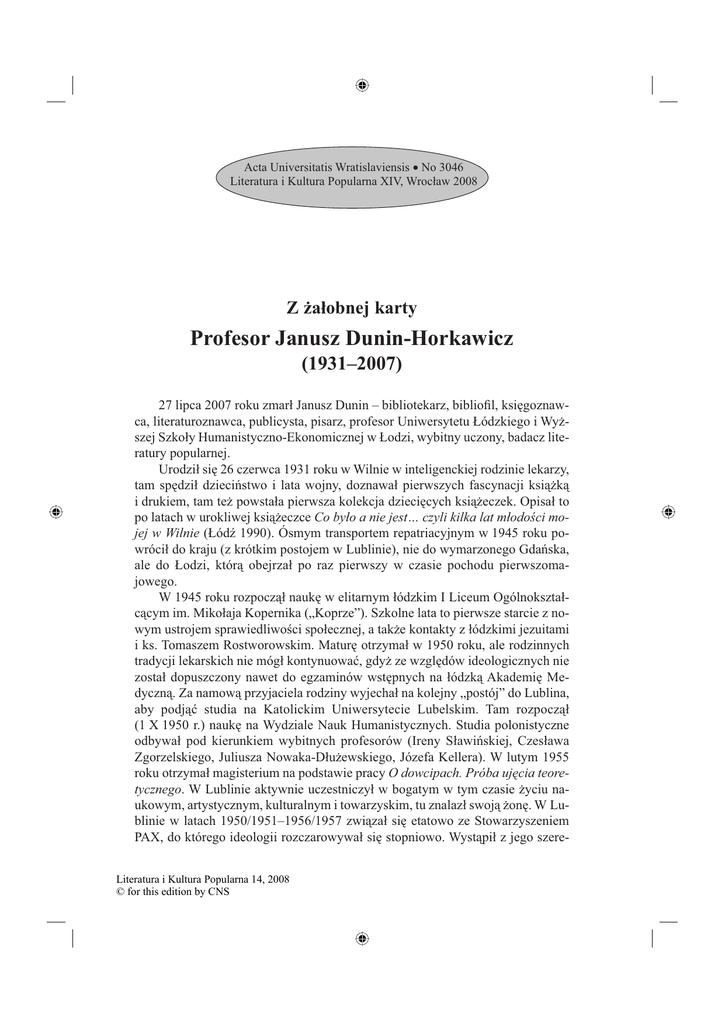 Acta Universitatis Wratislaviensis • No 3046 Literatura i Kultura Popularna XIV, Wrocław 2008 Z żałobnej karty Profesor Janusz Dunin-Horkawicz (1931–2007) 27 lipca 2007 roku zmarł Janusz Dunin – bibliotekarz, bibliofil, księgoznawca, literaturoznawca, publicysta, pisarz, profesor Uniwersytetu Łódzkiego i Wyższej Szkoły Humanistyczno-Ekonomicznej w Łodzi, wybitny uczony, badacz literatury popularnej. Urodził się 26 czerwca 1931 roku w Wilnie w inteligenckiej rodzinie lekarzy, tam spędził dzieciństwo i lata wojny, doznawał pierwszych fascynacji książką i drukiem, tam też powstała pierwsza kolekcja dziecięcych książeczek. Opisał to po latach w urokliwej książeczce Co było a nie jest… czyli kilka lat młodości mojej w Wilnie (Łódź 1990). Ósmym transportem repatriacyjnym w 1945 roku powrócił do kraju (z krótkim postojem w Lublinie), nie do wymarzonego Gdańska, ale do Łodzi, którą obejrzał po raz pierwszy w czasie pochodu pierwszomajowego. W 1945 roku rozpoczął naukę w elitarnym łódzkim I Liceum Ogólnokształcącym im. Mikołaja Kopernika („Koprze”). Szkolne lata to pierwsze starcie z nowym ustrojem sprawiedliwości społecznej, a także kontakty z łódzkimi jezuitami i ks. Tomaszem Rostworowskim. Maturę otrzymał w 1950 roku, ale rodzinnych tradycji lekarskich nie mógł kontynuować, gdyż ze względów ideologicznych nie został dopuszczony nawet do egzaminów wstępnych na łódzką Akademię Medyczną. Za namową przyjaciela rodziny wyjechał na kolejny „postój” do Lublina, aby podjąć studia na Katolickim Uniwersytecie Lubelskim. Tam rozpoczął (1 X 1950 r.) naukę na Wydziale Nauk Humanistycznych. Studia polonistyczne odbywał pod kierunkiem wybitnych profesorów (Ireny Sławińskiej, Czesława Zgorzelskiego, Juliusza Nowaka-Dłużewskiego, Józefa Kellera). W lutym 1955 roku otrzymał magisterium na podstawie pracy O dowcipach. Próba ujęcia teoretycznego. W Lublinie aktywnie uczestniczył w bogatym w tym czasie życiu naukowym, artystycznym, kulturalnym i towarzyskim, tu znalazł swoją żonę. W Lublinie w latach 1950/1951–1956/1957 związał się etatowo ze Stowarzyszeniem PAX, do którego ideologii rozczarowywał się stopniowo. Wystąpił z jego szereLiteratura i Kultura Popularna 14, 2008 © for this edition by CNS 150 Z żałobnej karty gów, został więc z dniem 31 maja 1957 roku zwolniony z pracy w Łódzkim Oddziale Wydawniczym PAX. Lata szkolne, studenckie i „paksowskie” opisał w wydanych na 75-lecie KUL-u wspomnieniach: Przystanek na wyspie wolności. Pejzaż KUL-owski z partią i PAX-em na horyzoncie (Lublin 1993). W 1957 roku rozpoczął pracę w Bibliotece Uniwersytetu Łódzkiego. W BUŁ pracował do 1987 roku, czyli dokładnie 30 lat. Przeszedł w niej wszystkie stopnie zawodowej kariery bibliotekarza. Przez wiele lat kierował działem gromadzenia zbiorów i żarliwie zabiegał o pozyskiwanie najcenniejszych dzieł, zwłaszcza o piśmiennictwo emigracyjne i drugiego obiegu. Przez jedną kadencję (1984–1987) pełnił funkcję dyrektora Biblioteki Uniwersytetu Łódzkiego. W ramach prac naukowych BUŁ realizował kilka tematów dotyczących m.in. powieści zeszytowych, serii zeszytowych oraz serii literackich i pozaliterackich, uwieńczonych publikacjami (1978, 1984, 1991). Wiele pisał w czasopismach bibliotekarskich na tematy zawodowe (zarówno z zakresu pragmatyki, jak i problematyki naukowej i teoretycznej). Był autorem cyklicznych felietonów (niektórych z żoną) na łamach „Bibliotekarza”, „Relaksu”, „Kolekcjonera Polskiego”, „Nowych Książek” i „Odgłosów”. Wraz z rozpoczęciem pracy w BUŁ zaczął się kolejny etap Jego przygody z bibliofilstwem, początkowo w Klubie Miłośników Książki przy Zarządzie Stowarzyszenia Bibliotekarzy Polskich, gdzie należał do najbardziej aktywnych jego członków. A w 1967 roku był jednym z inicjatorów i członkiem-założycielem Łódzkiego Towarzystwa Przyjaciół Książek. Udzielał się w nim społecznie (odczyty, referaty, prelekcje, spotkania autorskie, szopki itp.) przez 50 lat, aż do ostatniej chwili, bo jeszcze 23 maja 2007 roku wystąpił na zorganizowanym przez ŁTPK swoim benefisie z okazji otrzymania na wniosek ŁTPK – Nagrody Prezydenta Miasta Łodzi. Był także członkiem innych towarzystw bibliofilskich w Warszawie i Toruniu. Swoją działalność bibliofilską potwierdził m.in. w następujących publikacjach: Ekslibrisy, książki, ludzie... (Łódź 1974), Philobiblion polski (Wrocław 1983), Moja Łódź pełna książek... (Łódź 2002) i wielu innych. Jako kolekcjoner i bibliofil zgromadził duże i wartościowe kolekcje: ekslibrisów i grafik, druków bibliofilskich, literatury księgoznawczej, literatury drugiego obiegu księgarskiego (książki kramarskiej, brukowej, powieści zeszytowej), książek dla dzieci i młodzieży, vilniana (lithuanica), varia, szpargalia, rara et curiosa. Będąc na emeryturze, świadomie pozbywał się poszczególnych kolekcji, które już opisał i wykorzystał, organizując aukcje pod hasłem Książki, które miałem, dokumentując je drukowanymi katalogami opatrzonymi obszernym naukowym omówieniem – wstępem właściciela na temat kolekcji. Odbyły się cztery takie aukcje – w 1995, 1999, 2002, 2005 roku. Kolekcja książek, opisana w katalogu wystawy Dawna książka dla dzieci. Katalog Janusza Dunina (Wałbrzych 1988), znalazła się w Miejskiej Bibliotece Publicznej im. Marszałka Józefa Piłsudskiego, zbiór okładek i druków awangardowych trafił do Muzeum Sztuki Książki w Muzeum Literatura i Kultura Popularna 14, 2008 © for this edition by CNS Profesor Janusz Dunin-Horkawicz 151 Narodowym we Wrocławiu. Część papierów i korespondencję zakupiła w ostatnim czasie Biblioteka Uniwersytecka w Łodzi. Pozbywanie się kolekcji ocenił sam Janusz Dunin jako niezapomnianą bibliofilską przygodę i głębszą refleksję nad sensem kolekcjonerst