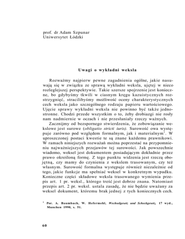 prof. dr Adam Szpunar Uniwersytet Łódzki Uwagi o wykładni weksla Rozważmy najpierw pewne zagadnienia ogólne, jakie nasuwają się w związku ze sprawą wykładni weksla, ujętej w nieco rozleglejszej perspektywie. Takie szersze spojrzenie jest konieczne, bo gdybyśmy tkwili w ciasnym kręgu kazuistycznych rozstrzygnięć, stracilibyśmy możliwość oceny charakterystycznych cech weksla jako szczególnego rodzaju papieru wartościowego. Ujęcie sprawy wykładni weksla nie powinno być także jednostronne. Chodzi przede wszystkim o to, żeby drobiazgi nie rosły nam nadmiernie w oczach i nie przesłaniały rzeczy ważnych. Zacznijmy od bezspornego stwierdzenia, że zobowiązanie wekslowe jest surowe (obligatio stricti iuris). Surowość owa występuje zarówno pod względem formalnym, jak i materialnym 1 . W uproszczonej postaci kwestie te są znane każdemu prawnikowi. W ramach niniejszych rozważań można poprzestać na przypomnieniu najważniejszych przejawów tej surowości. Jak powszechnie wiadomo, weksel jest dokumentem posiadającym dokładnie przez prawo określoną formę. Z tego punktu widzenia jest rzeczą obojętną, czy mamy do czynienia z wekslem trasowanym, czy też własnym. Surowość formalna występuje również niezależnie od tego, jakie funkcje ma spełniać weksel w konkretnym wypadku. Konieczne części składowe weksla trasowanego wymienia przepis art. 1 pr. weksl., którego treść jest dobrze znana. Natomiast przepis art. 2 pr. weksl. ustala zasadę, że nie będzie uważany za weksel dokument, któremu brak jednej z tych koniecznych cech. 1 Por. A. Baumbach, W. Hefermehl, Wechselgesetz und Scheckgesetz, 17 wyd., Munchen 1990, s. 51. 60 Uwagi o wykładni weksla Od tej zasady wprowadza art. 2 pr.weksl. wyjątki co do terminu płatności, miejsca płatności, wreszcie miejsca wystawienia weksla. Podobnie przedstawia się sprawa przy wekslu własnym (art. 101 pr. weksl.). Innym przejawem surowości formalnej zobowiązania wekslowego są przepisy dotyczące terminów oraz określonych czynności wierzycieli wekslowych (przedłożenie dokumentu, protest itd.). Zaniedbania w tym względzie mogą prowadzić do utraty roszczeń wekslowych przez wierzyciela. Przejawy materialnej surowości przenikają całe prawo wekslowe. Tak więc, jednym z przejawów tej surowości jest solidarna odpowiedzialność wszystkich dłużników wekslowych (por. art. 47 i nast. pr. weksl.). Zakres ich odpowiedzialności zostaje zasadniczo określony przez treść dokumentu. Innym przejawem surowości materialnej jest ograniczenie zarzutów przysługujących dłużnikom wekslowym (art. 17 pr. weksl.). Nie wchodząc w szczegóły, można poprzestać na refleksji, o której będziemy stale pamiętać w toku dalszych rozważań. Materialna surowość zobowiązania wekslowego nie jest celem samym w sobie, lecz ma umożliwić obiegowość weksla. Pozbawienie weksla tej cechy sprawiłoby, że straciłby on swe znaczenie w życiu gospodarczym. Trzeba przypomnieć, że charakterystyczne cechy weksla wykształciły się w drodze długiego rozwoju historycznego. Decydującą rolę odegrały tutaj czynniki gospodarcze, natomiast prawna sankcja, wprowadzona przez poszczególne ustawodawstwa miała charakter wtórny. Pozornie ujemne cechy surowości zobowiązania wekslowego są w istocie jego zaletami. Należy j e d n a k stanowczo unikać przesadnego formalizowania w tej dziedzinie. Surowość zobowiązania wekslowego nie powinna być traktowana jako jakiś dogmat. Należy zatem wytyczyć rozsądne granice formalizmowi prawa wekslowego 2 . Nadmiernego formalizmu unika zresztą sam ustawodawca. Przykładowo można wymienić 2 Podkreślał to wielokrotnie St. Wróblewski, Prawo wekslowe i czekowe. Komentarz, Kraków 1936. Przykładowo można tu wymienić oznaczenie stron obrotu wekslowego (s. 30). To samo dotyczy uwag (s. 1031 na temat nieprzerwanego szeregu indosów. 61 REJENT Nr 2 - luty 1994 r. art. 69 pr. weksl. co do skutków zmiany tekstu weksla. Zmiana ta nie powoduje nieważności weksla. Tendencja do unikania nadmiernego formalizmu występuje, gdy chodzi o wykładnię wyrażonych w dokumencie oświadczeń stron. W tym punkcie skupiają się - jak w ognisku soczewki - zagadnienia należące do całego prawa wekslowego. Tej właśnie sprawie są poświęcone niniejsze uwagi. Istotnym ich celem jest rozproszenie pewnych nieporozumień i uproszczeń, jakie występują często w zapatrywaniach prawników na ten temat oraz w życiu gospodarczym. Nie jest od nich wolne także orzecznictwo, które zbyt surowo traktuje wszelkie odchylenia od ustalonego wzoru. 1. Impulsem do podjęcia tej tematyki była niedawno ogłoszona uchwała Sądu Najwyższego z dnia 21 kwietnia 1993 r. (OSP 1993, poz. 246). Uchwała ta dotyczy w istocie dwóch, całkowicie odrębnych zagadnień: zdolności wekslowej oraz wykładni tekstu weksla. Tylko tą drugą sprawą zajmiemy się w toku dalszych rozważań. W tym zakresie uchwała jest interesująca i rzuca nowe światło na problemy wykładni weksla. Przed przystąpieniem do analizy wywodów uchwały na ten temat należy dokonać rekonstrukcji stanu faktycznego. Z przedstawionego w trybie art. 391 k.p.c. pytania prawnego wynika, że w konkretnym wypadku chodziło o weksel, w którym polecenie zapłaty brzmiało „zapłaci", zamiast przyrzeczenia „zapłacę". Pozostałe warunki ważności weksla własnego były jednak spełnione. Sąd Wojewódzki powziął wątpliwość, czy dokument taki może być uznany za ważny weksel. Z treści dokumentu wynikało zatem, że w istocie chodziło o weksel własny. Brak było nazwiska trasata. Samo brzmienie polecenia zapłaty zdawało się wskazywać na to, że posłużono się formularzem weksla trasowanego, na którym nie dokonano odpowiedniej poprawki. J a k z tego widać, pytanie prawne było dość wąsko sformułowane. Aby udzielić na nie odpowiedzi, Sąd Najwyższy dokonał gruntownej analizy przepisów prawa wekslowego oraz