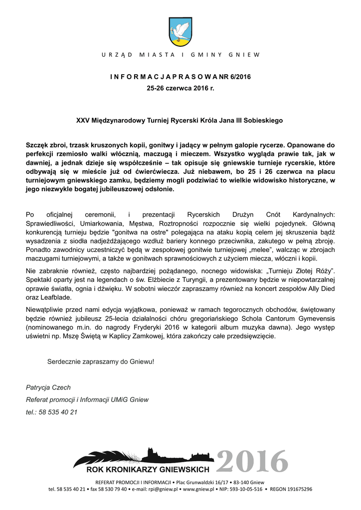 U R Z Ą D M I A S TA I G M I N Y G N I E W I N F O R M A C J A P R A S O W A NR 6/2016 25-26 czerwca 2016 r. XXV Międzynarodowy Turniej Rycerski Króla Jana III Sobieskiego Szczęk zbroi, trzask kruszonych kopii, gonitwy i jadący w pełnym galopie rycerze. Opanowane do perfekcji rzemiosło walki włócznią, maczugą i mieczem. Wszystko wygląda prawie tak, jak w dawniej, a jednak dzieje się współcześnie – tak opisuje się gniewskie turnieje rycerskie, które odbywają się w mieście już od ćwierćwiecza. Już niebawem, bo 25 i 26 czerwca na placu turniejowym gniewskiego zamku, będziemy mogli podziwiać to wielkie widowisko historyczne, w jego niezwykle bogatej jubileuszowej odsłonie. Po oficjalnej ceremonii, i prezentacji Rycerskich Drużyn Cnót Kardynalnych: Sprawiedliwości, Umiarkowania, Męstwa, Roztropności rozpocznie się wielki pojedynek. Główną konkurencją turnieju będzie "gonitwa na ostre" polegająca na ataku kopią celem jej skruszenia bądź wysadzenia z siodła nadjeżdżającego wzdłuż bariery konnego przeciwnika, zakutego w pełną zbroję. Ponadto zawodnicy uczestniczyć będą w zespołowej gonitwie turniejowej „melee”, walcząc w zbrojach maczugami turniejowymi, a także w gonitwach sprawnościowych z użyciem miecza, włóczni i kopii. Nie zabraknie również, często najbardziej pożądanego, nocnego widowiska: „Turnieju Złotej Róży”. Spektakl oparty jest na legendach o św. Elżbiecie z Turyngii, a prezentowany będzie w niepowtarzalnej oprawie światła, ognia i dźwięku. W sobotni wieczór zapraszamy również na koncert zespołów Ally Died oraz Leafblade. Niewątpliwie przed nami edycja wyjątkowa, ponieważ w ramach tegorocznych obchodów, świętowany będzie również jubileusz 25-lecia działalności chóru gregoriańskiego Schola Cantorum Gymevensis (nominowanego m.in. do nagrody Fryderyki 2016 w kategorii album muzyka dawna). Jego występ uświetni np. Mszę Świętą w Kaplicy Zamkowej, która zakończy całe przedsięwzięcie. Serdecznie zapraszamy do Gniewu! Patrycja Czech Referat promocji i Informacji UMiG Gniew tel.: 58 535 40 21 REFERAT PROMOCJI I INFORMACJI • Plac Grunwaldzki 16/17 • 83-140 Gniew tel. 58 535 40 21 • fax 58 530 79 40 • e-mail: [email protected] • www.gniew.pl • NIP: 593-10-05-516 • REGON 191675296 U R Z Ą D M I A S TA I G M I N Y G N I E W PROGRAM XXV MIĘDZYNARODOWEGO TURNIEJ RYCERSKI KRÓLA JANA III ZAMEK GNIEW, 25-26 CZERWCA 2016 SOBOTA, 25 czerwca 12.00 CEREMONIA OTWARCIA TURNIEJU Prezentacja Rycerskich Drużyn Cnót Kardynalnych: SPRAWIEDLIWOŚCI, UMIARKOWANIA, MĘSTWA, ROZTROPNOŚCI, 12.00 - 19.00 HISTORYCZNY PARK ROZRYWKI - prezentacje rzemiosł dawnych, historyczny dom mody, strzelnica z łuku i kuszy, wieża wspinaczkowa i widokowa, przygotowywanie koni i ubieranie rycerzy w zbroje turniejowe, 12.30 GONITWY TURNIEJOWE – RUNDA I – Męstwo vs Umiarkowanie - konne gonitwy sprawnościowe z mieczem, włócznią i kopią oraz starcia rycerzy w zbrojach, których celem jest skruszenie kopii i wysadzenie przeciwnika z siodła 14.00 GONITWY TURNIEJOWE – RUNDA II – Roztropność vs Męstwo 15.30 GONITWY TURNIEJOWE – RUNDA III – Roztropność vs Sprawiedliwość 17.00 GONITWY TURNIEJOWE – RUNDA IV – Umiarkowanie vs Sprawiedliwość 18.30 MELEĖ – gra turniejowa rycerzy konnych z maczugami 19.30 KONCERT ZESPOŁÓW ALLY DIED oraz LEAFBLADE 22.00 WIDOWISKO HISTORYCZNE „TURNIEJ ZŁOTEJ RÓŻY” – nocne pojedynki „Rycerzy Gniewu” w niepowtarzalnej oprawie ognia, światła i dźwięku NIEDZIELA, 26 czerwca 12.00 - 17.00 HISTORYCZNY PARK ROZRYWKI 13.00 GONITWY TURNIEJOWE – RUNDA V – Męstwo vs Sprawiedliwość 14.00 GONITWY TURNIEJOWE – RUNDA VI – Roztropność vs Umiarkowanie 15.00 MELEĖ – GACIOHURT 15.30 CEREMONIA ZAKOŃCZENIA TURNIEJU 16.00 MSZA ŚWIĘTA W KAPLICY ZAMKOWEJ z udziałem chóru gregoriańskiego SCHOLA CANTORUM GYMEVENSIS REFERAT PROMOCJI I INFORMACJI • Plac Grunwaldzki 16/17 • 83-140 Gniew tel. 58 535 40 21 • fax 58 530 79 40 • e-mail: [email protected] • www.gniew.pl • NIP: 593-10-05-516 • REGON 191675296