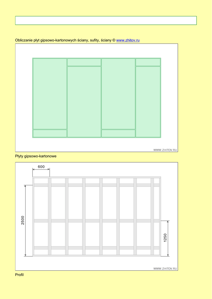 Obliczanie płyt gipsowo-kartonowych ściany, sufity, ściany © www.zhitov.ru Płyty gipsowo-kartonowe Profil 2 2 Kwadrat partycji: 12.6 m lub 25.2 m z dwóch stron Liczba arkuszy płyt kartonowo-gipsowych: 10 sztuk (2 warstwa) Profil Przewodnik: 14.6 m lub 5 kawałki 3 m Profil stojak: 33.1 m lub 12 kawałki 3 m Wkręty samowiercące do ścian gipsowo: 191 sztuk lub 382 sztuk z dwóch stron Śruby do ramki: 158 sztuk Tylko śruby z łbem stożkowym: 349 sztuk lub 540 sztuk z dwóch stron Taśmy uszczelniające: 14.6 m Taśmy zbrojącej: 37 m lub 74 m z dwóch stron Materiał izolacji cieplnej: 12.6 m2 или 0.63 m3 w grubości 50 mm Podkład: 2.52 litrów lub 5.04 litrów z dwóch stron Kit: 11.34 kg lub 22.68 kg z dwóch stron PuTTY Wykańczanie: 15.12 kg lub 30.24 kg z dwóch stron Farby: 2.52 litrów lub 5.04 litrów z dwóch stron © www.zhitov.ru