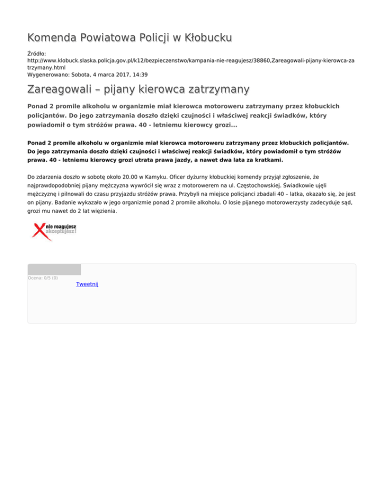 Komenda Powiatowa Policji w Kłobucku Źródło: http://www.klobuck.slaska.policja.gov.pl/k12/bezpieczenstwo/kampania-nie-reagujesz/38860,Zareagowali-pijany-kierowca-za trzymany.html Wygenerowano: Sobota, 4 marca 2017, 14:39 Zareagowali – pijany kierowca zatrzymany Ponad 2 promile alkoholu w organizmie miał kierowca motoroweru zatrzymany przez kłobuckich policjantów. Do jego zatrzymania doszło dzięki czujności i właściwej reakcji świadków, który powiadomił o tym stróżów prawa. 40 - letniemu kierowcy grozi... Ponad 2 promile alkoholu w organizmie miał kierowca motoroweru zatrzymany przez kłobuckich policjantów. Do jego zatrzymania doszło dzięki czujności i właściwej reakcji świadków, który powiadomił o tym stróżów prawa. 40 - letniemu kierowcy grozi utrata prawa jazdy, a nawet dwa lata za kratkami. Do zdarzenia doszło w sobotę około 20.00 w Kamyku. Oficer dyżurny kłobuckiej komendy przyjął zgłoszenie, że najprawdopodobniej pijany mężczyzna wywrócił się wraz z motorowerem na ul. Częstochowskiej. Świadkowie ujęli mężczyznę i pilnowali do czasu przyjazdu stróżów prawa. Przybyli na miejsce policjanci zbadali 40 – latka, okazało się, że jest on pijany. Badanie wykazało w jego organizmie ponad 2 promile alkoholu. O losie pijanego motorowerzysty zadecyduje sąd, grozi mu nawet do 2 lat więzienia. Ocena: 0/5 (0) Tweetnij