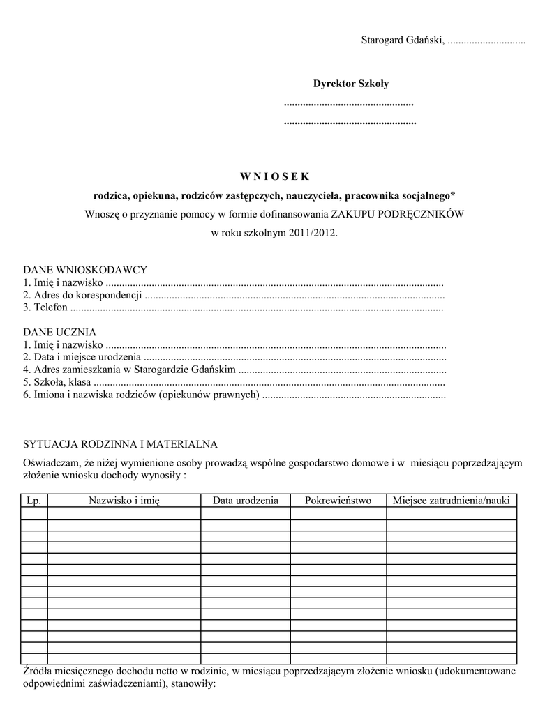 Starogard Gdański, ............................. Dyrektor Szkoły ................................................ ................................................. WNIOSEK rodzica, opiekuna, rodziców zastępczych, nauczyciela, pracownika socjalnego* Wnoszę o przyznanie pomocy w formie dofinansowania ZAKUPU PODRĘCZNIKÓW w roku szkolnym 2011/2012. DANE WNIOSKODAWCY 1. Imię i nazwisko ............................................................................................................................. 2. Adres do korespondencji ............................................................................................................... 3. Telefon .......................................................................................................................................... DANE UCZNIA 1. Imię i nazwisko .............................................................................................................................. 2. Data i miejsce urodzenia ................................................................................................................ 4. Adres zamieszkania w Starogardzie Gdańskim ............................................................................. 5. Szkoła, klasa .................................................................................................................................. 6. Imiona i nazwiska rodziców (opiekunów prawnych) .................................................................... SYTUACJA RODZINNA I MATERIALNA Oświadczam, że niżej wymienione osoby prowadzą wspólne gospodarstwo domowe i w miesiącu poprzedzającym złożenie wniosku dochody wynosiły : Lp. Nazwisko i imię Data urodzenia Pokrewieństwo Miejsce zatrudnienia/nauki Źródła miesięcznego dochodu netto w rodzinie, w miesiącu poprzedzającym złożenie wniosku (udokumentowane odpowiednimi zaświadczeniami), stanowiły: 1) wynagrodzenie za pracę (netto) ……………………………………………………..…………………………...zł 2) dochody z prowadzenia działalności gospodarczej …………...…………………………………………………zł 3) dochody z gospodarstwa rolnego ...………………………………………………………………………………zł 4) emerytury, renty inwalidzkie, socjalne i rodzinne ...……………………………………………………………..zł 5) świadczenia rodzinne: a) zasiłek rodzinny oraz dodatki do zasiłku rodzinnego …………………………...………….…………..zł b) zasiłek pielęgnacyjny …………………………………………………………..……….…...…………zł c) świadczenia pielęgnacyjne ……………….……………………………..…………………………........zł 6) zasiłek dla bezrobotnych …………………………………………………………………………………………zł 7) zasiłek okresowy/ zasiłek stały …………………………………………………………………………………..zł 8) alimenty/ zaliczka alimentacyjna ………………………………………………………………………………...zł 9) dodatek mieszkaniowy …………………………………………………………………………………………...zł 10) inne dochody (wymienić jakie) …………………………………………………………………………………zł Łączne dochody netto gospodarstwa domowego ………………………………………………….……zł Dochód netto na osobę w rodzinie wynosi …………………………………..........……………...……..zł Załączniki*: 1) Zaświadczenia o uzyskiwanych zarobkach netto, za ostatni miesiąc poprzedzający złożenie wniosku. 2) Zaświadczenie z Powiatowego Urzędu Pracy w Starogardzie Gdańskim, jeżeli osoba jest zarejestrowana jako bezrobotna z prawem bądź bez prawa do zasiłku. 3) Oświadczenie jeżeli osoba nie jest zarejestrowana w Powiatowym Urzędzie Pracy i nigdzie nie pracuje. 4) Decyzja Ośrodka Pomocy Społecznej o wysokości pobieranych świadczeń (w tym np. zasiłków, dodatków mieszkaniowych, alimentów) lub zaświadczenie o nie korzystaniu (np. zasiłków rodzinnych, dodatków mieszkaniowych, zasiłków okresowych) z Ośrodka Pomocy Społecznej. W przypadku korzystania ze świadczeń pieniężnych w formie zasiłku stałego lub okresowego można przełożyć – zamiast zaświadczenia o wysokości dochodów – zaświadczenie o korzystaniu ze świadczeń pieniężnych w formie zasiłku stałego lub okresowego. 5) Zaświadczenie o otrzymywaniu stypendium o charakterze socjalnym ze środków publicznych. 6) Oświadczenie o uzyskiwanych dochodach z prac dorywczych. 7) Decyzja Zakładu Ubezpieczeń Społecznych o wysokości pobieranego świadczenia (renta, zasiłek przedemerytalny, emerytura). 8) W przypadku ubiegania się o pomoc dla ucznia słabo widzącego, niesłyszącego, z upośledzeniem umysłowym o stopniu lekkim oraz ucznia z niepełnosprawnościami sprężonymi, w przypadku gdy jedną z nich jest niepełnosprawność wymieniona wyżej, posiadającym orzeczenie o potrzebie kształcenia specjalnego, realizujący obowiązek nauki szkolnej 2010/2011 lub obowiązek nauki w szkołach dla dzieci i młodzieży – zamiast zaświadczenia o wysokości dochodów – należy dołączyć kopię orzeczenia o potrzebie kształcenia specjalnego wydanego przez publiczną poradnie psychologiczno – pedagogiczną. 9) W przypadku ubiegania się o pomoc dla ucznia pochodzącego z rodziny, w której dochód na osobę w rodzinie przekracza kryterium dochodowe – zamiast zaświadczenia o wysokości dochodów – należy dołączyć uzasadnienie. _______________________________________ * właściwe podkreślić Świadomy/a odpowiedzialności karnej z art. 233 Kodeksu Karnego potwierdzam własnoręcznym podpisem pr