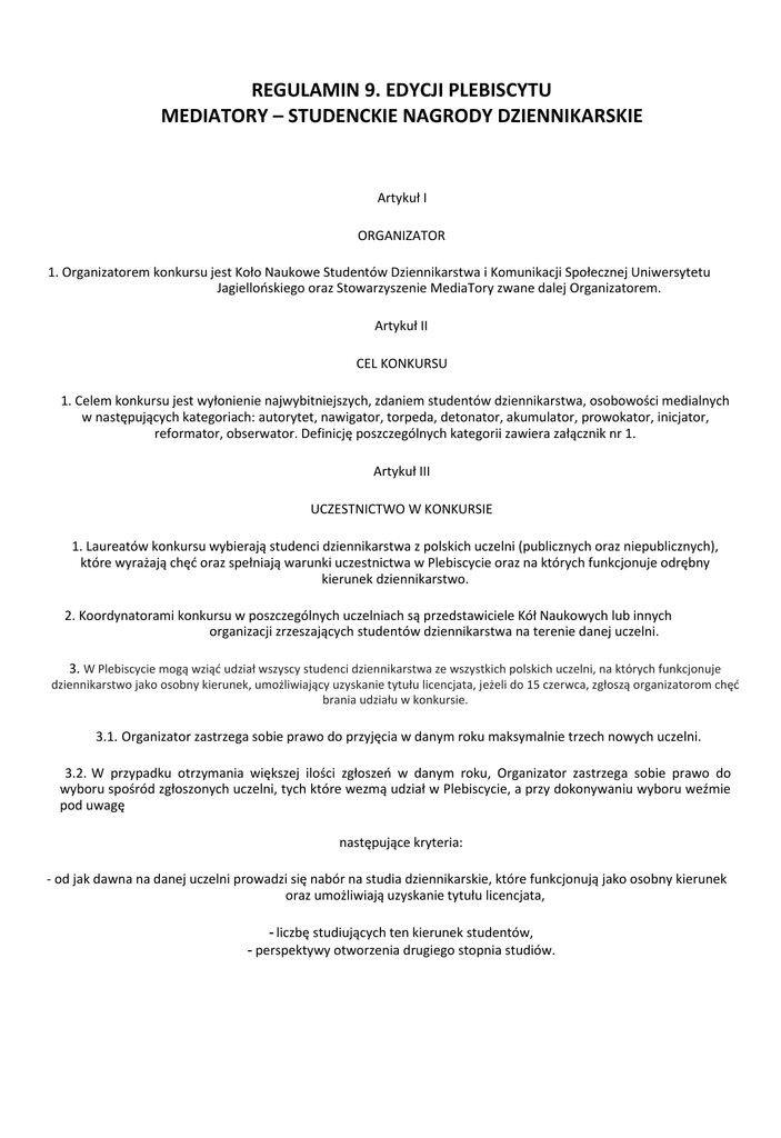 REGULAMIN 9. EDYCJI PLEBISCYTU MEDIATORY – STUDENCKIE NAGRODY DZIENNIKARSKIE Artykuł I ORGANIZATOR 1. Organizatorem konkursu jest Koło Naukowe Studentów Dziennikarstwa i Komunikacji Społecznej Uniwersytetu Jagiellońskiego oraz Stowarzyszenie MediaTory zwane dalej Organizatorem. Artykuł II CEL KONKURSU 1. Celem konkursu jest wyłonienie najwybitniejszych, zdaniem studentów dziennikarstwa, osobowości medialnych w następujących kategoriach: autorytet, nawigator, torpeda, detonator, akumulator, prowokator, inicjator, reformator, obserwator. Definicję poszczególnych kategorii zawiera załącznik nr 1. Artykuł III UCZESTNICTWO W KONKURSIE 1. Laureatów konkursu wybierają studenci dziennikarstwa z polskich uczelni (publicznych oraz niepublicznych), które wyrażają chęć oraz spełniają warunki uczestnictwa w Plebiscycie oraz na których funkcjonuje odrębny kierunek dziennikarstwo. 2. Koordynatorami konkursu w poszczególnych uczelniach są przedstawiciele Kół Naukowych lub innych organizacji zrzeszających studentów dziennikarstwa na terenie danej uczelni. 3. W Plebiscycie mogą wziąć udział wszyscy studenci dziennikarstwa ze wszystkich polskich uczelni, na których funkcjonuje dziennikarstwo jako osobny kierunek, umożliwiający uzyskanie tytułu licencjata, jeżeli do 15 czerwca, zgłoszą organizatorom chęć brania udziału w konkursie. 3.1. Organizator zastrzega sobie prawo do przyjęcia w danym roku maksymalnie trzech nowych uczelni. 3.2. W przypadku otrzymania większej ilości zgłoszeń w danym roku, Organizator zastrzega sobie prawo do wyboru spośród zgłoszonych uczelni, tych które wezmą udział w Plebiscycie, a przy dokonywaniu wyboru weźmie pod uwagę następujące kryteria: - od jak dawna na danej uczelni prowadzi się nabór na studia dziennikarskie, które funkcjonują jako osobny kierunek oraz umożliwiają uzyskanie tytułu licencjata, - liczbę studiujących ten kierunek studentów, - perspektywy otworzenia drugiego stopnia studiów. Artykuł IV PRZEBIEG KONKURSU 1. Wydarzenia, materiały oraz postaci medialne, które w ich opinii zasługują na nominację w poszczególnych kategoriach Plebiscytu, a więc: nawigator, torpeda, detonator, akumulator , prowokator, inicjator, reformator, obserwator oraz propozycje w kategorii autorytet wskazują Koła Naukowe kierunków dziennikarskich na uczelniach partnerskich oraz Koło Naukowe Studentów Dziennikarstwa i Komunikacji Społecznej Uniwersytetu Jagiellońskiego 2. Kandydaci, zgłoszeni przez uczelnie partnerskie, nie stają się automatycznie nominowanymi w Plebiscycie. Szczegóły przebiegu Plebiscytu określa załącznik nr 2. 3. Ostatecznego wyboru listy nominacji dokonuje Jury Preselekcyjne, na podstawie częstotliwości pojawiających się propozycji oraz ich merytorycznego uzasadnienia. W skład Jury wchodzą członkowie Stowarzyszenia oraz zespołu organizującego Plebiscyt pozostający studentami. 4. Jury Preselekcyjne przedstawia Stowarzyszeniu ostateczną listę nominowanych, kierując się wskazaniami uczelni partnerskich oraz merytorycznym uzasadnieniem kandydatur w kategoriach: nawigator, torpeda, detonator, akumulator, prowokator, inicjator, reformator, obserwator. Stowarzyszenie sprawdza, czy przy wyborze nominacji uwzględnione zostało pełne spektrum medialne oraz czy nominowane materiały nie naruszają rzetelności dziennikarskiej. Ostateczna lista nominowanych zawiera maksymalnie pięć nominacji w każdej kategorii oraz listę propozycji w kategorii autorytet. 5. Organizator przesyła koordynatorom wzór karty do głosowania. Na karcie znajduje się w każdej z ośmiu kategorii określonych w pkt. 1 maksymalnie pięć nominacji, wyłonionych zgodnie z zasadami określonymi w pkt. 3 oraz propozycje w kategorii autorytet. Listę propozycji w kategorii autorytet tworzą nazwiska, które pojawiały się najczęściej w nadsyłanych przez uczelnie typach nominacji w ciągu pięciu lat oraz propozycje Jury Preselekcyjnego. Ostateczne kryteria znalezienie się nazwisk na liście w kategorii autorytet to: bycie przykładem dla młodych dziennikarzy, duży wkład w rozwój polskiego dziennikarstwa oraz znajdowanie się za momentem kulminacyjnym swojej kariery. Lista ta, ma spełniać tylko rolę pomocniczą, ponieważ każdy student biorący udział w głosowaniu jest uprawniony do wpisania swojej propozycji w wolnym polu. 6. Koordynatorzy przeprowadzają głosowanie wśród studentów swojej uczelni. Zasady głosowania określa szczegółowo załącznik nr 3. 7. Koordynator przesyła Organizatorowi wszystkie wypełnione przez studentów ankiety. Organizator podlicza wszystkie ważne głosy. 8. Wyniki konkursu zostają ogłoszone podczas uroczystej gali przygotowanej specjalnie w tym celu przez Organizatora, w której udział biorą Nominowani, przedstawiciele uczelni biorących udział w konkursie oraz zaproszeni goście. Artykuł V WYKLUCZENIE Z UDZIAŁU W PLEBISCYCIE 1. Warunkiem uczestnictwa w Plebiscycie MediaTory 2015 jest przesłanie propozycji nominacji w wyznaczonym przez Organizatora czasie. Lista powinna zawierać propozycje nominacji w każdej kategorii, z zastrzeżeniem, że nie może być ich mniej niż trzy w każdej kategorii. Łączna liczba propozycji nominacji ma wynosić co najmniej 24 typy. 2. W razie nie przesłania Organizatorowi typów nominacji, Organizator może wyznaczyć dodatkowy termin na uzupełnienie braków lub wykluczyć daną uczelnię, która nie spełniła warunków określonych w punkcie 1 Artykułu V. 3. Decyzję podejmuje zarząd Stowarzyszenia MediaTory, a ogłasza ją Prezes Stowarzyszenia. Decyzja zarządu Stowarzyszenia jest ostateczna i nie ma możliwości odwołania od niej. 4. Wykluczenie może dotyczyć tylko bieżącej edycji Plebiscytu. Wykluczona uczelnia ma prawo do starania się o uczestnictwo w Plebiscycie w następnym roku na zasadach zgodnych z regulaminem kolejnej edycji. ZAŁĄCZNIK 1. 1. Kandydatem do nagrody może zostać każ