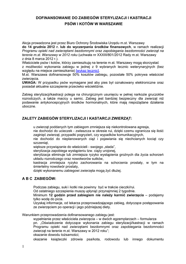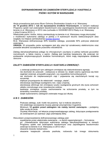 DOFINANSOWANIE DO ZABIEGÓW STERYLIZACJI I KASTRACJI PSÓW I KOTÓW W WARSZAWIE Akcja prowadzona jest przez Biuro Ochrony Środowiska Urzędu m.st. Warszawy do 14 grudnia 2012 r. lub do wyczerpania środków finansowych, w ramach realizacji Programu opieki nad zwierzętami bezdomnymi oraz zapobiegania bezdomności zwierząt na terenie m.st. Warszawy w 2012 roku (uchwała nr XXXIII/801/2012 Rady m.st. Warszawy z dnia 8 marca 2012 r.). Właściciele psów i kotów, którzy zamieszkują na terenie m.st. Warszawy mogą skorzystać z możliwości wykonania zabiegu w jednej z 9 wybranych lecznic weterynaryjnych (bez względu na miejsce zamieszkania) [wykaz lecznic]. M.st. Warszawa dofinansowuje 50% kosztów zabiegu, pozostałe 50% pokrywa właściciel zwierzęcia. UWAGA: W przypadku psów wymagane jest aby pies był oznakowany elektroniczne oraz posiadał aktualne szczepienie przeciwko wściekliźnie. Zabieg sterylizacji/kastracji polega na chirurgicznym usunięciu w pełnej narkozie gruczołów rozrodczych, a także macicy u samic. Zabieg jest bardziej bezpieczny dla zwierząt niż podawanie antykoncepcyjnych środków hormonalnych, które mają niepożądane działania uboczne. ZALETY ZABIEGÓW STERYLIZACJI I KASTARCJI ZWIERZĄT: u zwierząt poddanych tym zabiegom zmniejsza się niekontrolowana agresja, nie dochodzi do ucieczek - zwłaszcza w okresie rui, dzięki czemu ogranicza się ilość zaginięć zwierząt, przypadki pogryzień, czy wypadków komunikacyjnych, nie dochodzi do nieplanowanych ciąż i pojawiania się niechcianych kociąt czy szczeniąt, większe przywiązanie do właścicieli - swojego „stada”, sterylizacja zapobiega wystąpieniu tzw. ciąży urojonej, sterylizacja eliminuje lub zmniejsza ryzyko wystąpienia groźnych dla życia schorzeń układu rozrodczego oraz nowotworów sutków, kastracja zmniejsza ryzyko zachorowania na schorzenia prostaty, w tym na śmiertelny nowotwór prostaty, dzięki wykonanemu zabiegowi zwierzęta mogą żyć dłużej. A B C ZABIEGÓW: Podczas zabiegu, suki i kotki nie powinny być w trakcie cieczki/rui. Od ostatniego szczepienia muszą upłynąć przynajmniej 2 tygodnie. Minimum 12 godzin przed zabiegiem nie należy karmić zwierzęcia – podajemy tylko wodę do picia. Uzyskaj informacje, od lekarza przeprowadzającego zabieg, dotyczące postępowania ze zwierzęciem po operacji i jego późniejszej diety. Warunkiem przeprowadzenia dofinansowanego zabiegu jest: wypełnienie przez właściciela zwierzęcia – w dwóch egzemplarzach – formularza pn. „Oświadczenie dotyczące wykonania zabiegu sterylizacji/kastracji w ramach Programu opieki nad zwierzętami bezdomnymi oraz zapobiegania bezdomności zwierząt na terenie m.st. Warszawy w 2012 roku”; okazanie dowodu tożsamości; okazanie książeczki zdrowia psa/kota, rodowodu lub innego dokumentu 1 potwierdzającego prawa do zwierzęcia. Opracowane 26 czerwca 2012 r. 2
