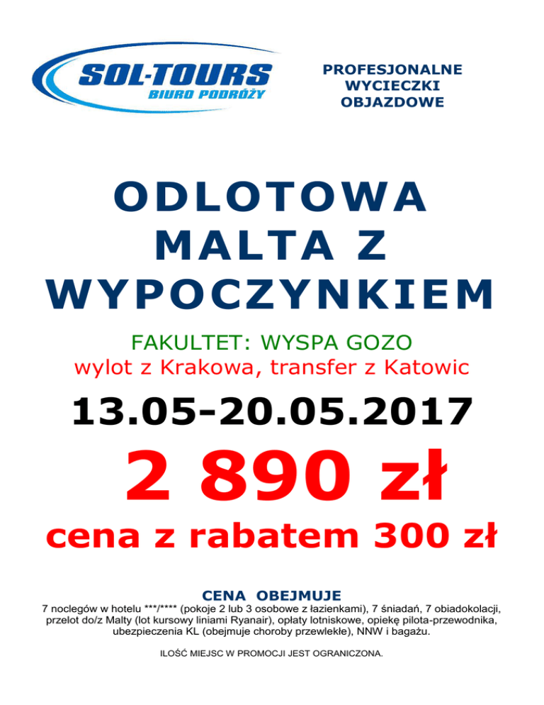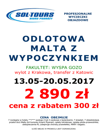 PROFESJONALNE WYCIECZKI OBJAZDOWE ODLOTOWA MALTA Z WYPOCZYNKIEM FAKULTET: WYSPA GOZO wylot z Krakowa, transfer z Katowic 13.05-20.05.2017 2 890 zł cena z rabatem 300 zł CENA OBEJMUJE 7 noclegów w hotelu ***/**** (pokoje 2 lub 3 osobowe z łazienkami), 7 śniadań, 7 obiadokolacji, przelot do/z Malty (lot kursowy liniami Ryanair), opłaty lotniskowe, opiekę pilota-przewodnika, ubezpieczenia KL (obejmuje choroby przewlekłe), NNW i bagażu. ILOŚĆ MIEJSC W PROMOCJI JEST OGRANICZONA.