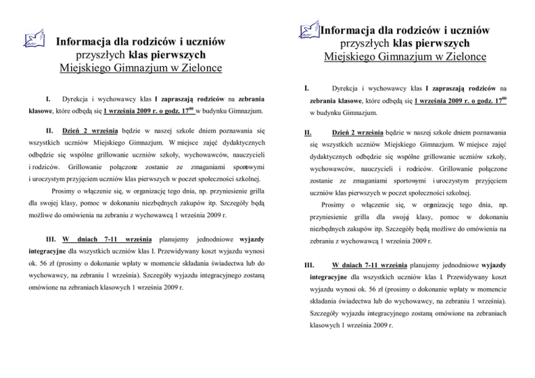 Informacja dla rodziców i uczniów przyszłych klas pierwszych Miejskiego Gimnazjum w Zielonce Informacja dla rodziców i uczniów przyszłych klas pierwszych Miejskiego Gimnazjum w Zielonce I. I. Dyrekcja i wychowawcy klas I zapraszają rodziców na zebrania klasowe, które odbędą się 1 września 2009 r. o godz. 1700 w budynku Gimnazjum. II. Dzień 2 września będzie w naszej szkole dniem poznawania się Dyrekcja i wychowawcy klas I zapraszają rodziców na zebrania klasowe, które odbędą się 1 września 2009 r. o godz. 1700 w budynku Gimnazjum. II. Dzień 2 września będzie w naszej szkole dniem poznawania wszystkich uczniów Miejskiego Gimnazjum. W miejsce zajęć dydaktycznych się wszystkich uczniów Miejskiego Gimnazjum. W miejsce zajęć odbędzie się wspólne grillowanie uczniów szkoły, wychowawców, nauczycieli dydaktycznych odbędzie się wspólne grillowanie uczniów szkoły, i rodziców. wychowawców, nauczycieli i rodziców. Grillowanie połączone Grillowanie połączone zostanie ze zmaganiami sportowymi i uroczystym przyjęciem uczniów klas pierwszych w poczet społeczności szkolnej. Prosimy o włączenie się, w organizację tego dnia, np. przyniesienie grilla zostanie ze zmaganiami sportowymi i uroczystym przyjęciem uczniów klas pierwszych w poczet społeczności szkolnej. dla swojej klasy, pomoc w dokonaniu niezbędnych zakupów itp. Szczegóły będą możliwe do omówienia na zebraniu z wychowawcą 1 września 2009 r. Prosimy o włączenie się, w organizację tego dnia, np. przyniesienie grilla dla swojej klasy, pomoc w dokonaniu niezbędnych zakupów itp. Szczegóły będą możliwe do omówienia na III. W dniach 7-11 września planujemy jednodniowe wyjazdy zebraniu z wychowawcą 1 września 2009 r. integracyjne dla wszystkich uczniów klas I. Przewidywany koszt wyjazdu wynosi ok. 56 zł (prosimy o dokonanie wpłaty w momencie składania świadectwa lub do III. W dniach 7-11 września planujemy jednodniowe wyjazdy wychowawcy, na zebraniu 1 września). Szczegóły wyjazdu integracyjnego zostaną integracyjne dla wszystkich uczniów klas I. Przewidywany koszt omówione na zebraniach klasowych 1 września 2009 r. wyjazdu wynosi ok. 56 zł (prosimy o dokonanie wpłaty w momencie składania świadectwa lub do wychowawcy, na zebraniu 1 września). Szczegóły wyjazdu integracyjnego zostaną omówione na zebraniach klasowych 1 września 2009 r.
