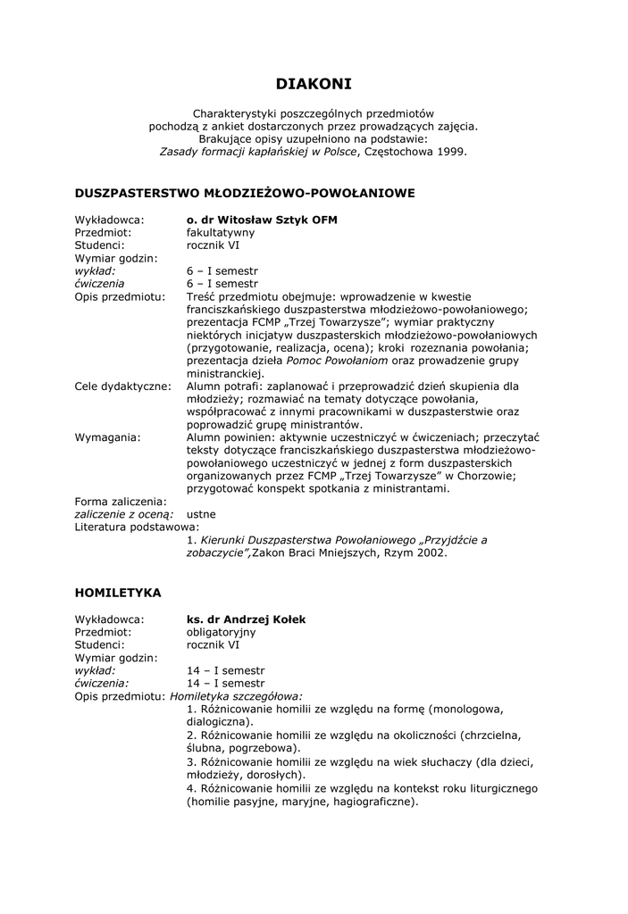DIAKONI Charakterystyki poszczególnych przedmiotów pochodzą z ankiet dostarczonych przez prowadzących zajęcia. Brakujące opisy uzupełniono na podstawie: Zasady formacji kapłańskiej w Polsce, Częstochowa 1999. DUSZPASTERSTWO MŁODZIEŻOWO-POWOŁANIOWE Wykładowca: Przedmiot: Studenci: Wymiar godzin: wykład: ćwiczenia Opis przedmiotu: Cele dydaktyczne: Wymagania: o. dr Witosław Sztyk OFM fakultatywny rocznik VI 6 – I semestr 6 – I semestr Treść przedmiotu obejmuje: wprowadzenie w kwestie franciszkańskiego duszpasterstwa młodzieżowo-powołaniowego; prezentacja FCMP „Trzej Towarzysze”; wymiar praktyczny niektórych inicjatyw duszpasterskich młodzieżowo-powołaniowych (przygotowanie, realizacja, ocena); kroki rozeznania powołania; prezentacja dzieła Pomoc Powołaniom oraz prowadzenie grupy ministranckiej. Alumn potrafi: zaplanować i przeprowadzić dzień skupienia dla młodzieży; rozmawiać na tematy dotyczące powołania, współpracować z innymi pracownikami w duszpasterstwie oraz poprowadzić grupę ministrantów. Alumn powinien: aktywnie uczestniczyć w ćwiczeniach; przeczytać teksty dotyczące franciszkańskiego duszpasterstwa młodzieżowopowołaniowego uczestniczyć w jednej z form duszpasterskich organizowanych przez FCMP „Trzej Towarzysze” w Chorzowie; przygotować konspekt spotkania z ministrantami. Forma zaliczenia: zaliczenie z oceną: ustne Literatura podstawowa: 1. Kierunki Duszpasterstwa Powołaniowego „Przyjdźcie a zobaczycie”,Zakon Braci Mniejszych, Rzym 2002. HOMILETYKA Wykładowca: ks. dr Andrzej Kołek Przedmiot: obligatoryjny Studenci: rocznik VI Wymiar godzin: wykład: 14 – I semestr ćwiczenia: 14 – I semestr Opis przedmiotu: Homiletyka szczegółowa: 1. Różnicowanie homilii ze względu na formę (monologowa, dialogiczna). 2. Różnicowanie homilii ze względu na okoliczności (chrzcielna, ślubna, pogrzebowa). 3. Różnicowanie homilii ze względu na wiek słuchaczy (dla dzieci, młodzieży, dorosłych). 4. Różnicowanie homilii ze względu na kontekst roku liturgicznego (homilie pasyjne, maryjne, hagiograficzne). 5. Różnicowanie homilii ze względu na sposób komunikacji (kazania wygłaszane w komunikacji bezpośredniej, kazania wygłaszane w mediach). 6. Koncepcja rekolekcji i misji parafialnych. Ćwiczenia: W ramach ćwiczeń studenci przygotowują, wygłaszają i oceniają homilie obrzędowe (chrzcielne, ślubne, pogrzebowe) oraz przygotowują plan rekolekcji parafialnych. Cele dydaktyczne: Alumn powinien przyswoić sobie umiejętność poprawnego przygotowania różnych typów homilii, różnicowanych podanymi wyżej uwarunkowaniami. Prowadzone ćwiczenia miałyby zweryfikować umiejętność stosowania poznanych zasad w praktyce przez przygotowanie i wygłoszenie homilii obrzędowych. Wymagania: Alumn powinien na bieżąco przyswajać wiedzę przekazywaną na wykładach, śledzić literaturę teologiczno-homiletyczną oraz systematycznie tworzyć jednostki przepowiadania w wyżej podanym zakresie. Forma zaliczenia: zaliczenie z oceną: z ćwiczeń egzamin: testowy, z wyznaczonej lektury i wykładów dotyczących homilii obrzędowych. Literatura podstawowa: 1. Siwek G., Homilie obrzędowe, Kraków 1997. 2. Staniek E., Z kaznodziejskiego warsztatu, Kraków 1997. 3. Simon H., Przepowiadanie podczas chrztu, ślubu i pogrzebu. Studia Liturgiczno-Pastoralne (Opole) 1989, s. 215-229. 4. Szewczyk L., Zrozpaczonym głosić nadzieję. Zdań kilka o homiliach pogrzebowych, w: Tenże (red.). Homilie pogrzebowe. Pomoce kaznodziejskie 3, Katowice 2004. KATECHETYKA, PEDAGOGIKA I KATECHEZA SPECJALNA Wykładowca: Przedmiot: Studenci: Wymiar godzin: wykład: ćwiczenia: Opis przedmiotu: Cele dydaktyczne: Wymagania: Forma zaliczenia: egzamin: o. dr Witosław Sztyk OFM obligatoryjny rocznik VI 28 – I semestr 28 – I semestr Treść zajęć wykładowych i ćwiczeń dotyczy: dydaktyki ogólnej i katechetycznej; katechetyki szczegółowej; regulacji prawnych katechezy; awansu zawodowego; relacji pomiędzy katechezą a kulturą. Alumn potrafi: wykorzystać podstawowe założenia dydaktyki; określić, dostosować i wykorzystać różnorakie metody i środki katechetyczne; nazwać i wykorzystać podstawowe metody aktywizujące; przedstawić różne metody motywowania uczniów do nauki; profilaktycznie przeciwdziałać rodzeniu się braku dyscypliny oraz wykazać się gamą wielorakich reakcji na jej brak. Aktywny udział w zajęciach. średnia z ocen uzyskanych w ciągu semestru (testy) Literatura podstawowa: 1. Arends R. I., Uczmy się nauczać, Wydawnictwa szkolne i pedagogiczne, Warszawa 1994. 2. Okoń W., Wprowadzenie do dydaktyki ogólnej, Wydawnictwo Akademickie „Żak”, Warszawa 2003. 3. Polito M., Attivare le risorse del gruppo classe, Erickson, Trento 2000. 4. Stala J. (red.), Dydaktyka katechezy, cz. I i II, Biblos, Tarnów 2004. 5. Stala J. (red.), Katechetyka szczegółowa, Biblos, Tarnów 2003. 6. Szpet J., Dydaktyka katechezy, Uniwersytet im. A. Mickiewicza w Poznaniu, Poznań 1999. LITURGIKA Wykładowca: Przedmiot: Studenci: Wymiar godzin: ćwiczenia: Opis przedmiotu: Cele dydaktyczne: Wymagania: ks. dr Jerzy Paliński obligatoryjny rocznik VI 28 – I semestr Treść przedmiotu obejmuje przedstawienie teoretyczne a następnie ćwiczenia praktyczne dotyczące sprawowania Mszy św., sprawowania sakramentów i sakramentaliów, sprawowania nabożeństw. Alumn potrafi samodzielnie przygotować i sprawować wszystkie sakramenty, sakramentalia i nabożeństwa. Alumn powinien przeczytać OWMR, przygotować celebracje Mszy św., innych sakramentów i sakramentaliów (każdy alumn przygotowuje indywidualnie celebrację i ją przedstawia do końca grudnia). Forma zaliczenia: zaliczenie z oceną: ustne Literatura podstawowa: 1. Ogólne Wprowadzenie do Mszału Rzymskiego. 2. Mszał Rzymski. 3. Lekcjonarz mszalny. 4. Instrukcja „Redemptionis sacramentum” – o tym co należy zachowywać a czego unikać w związku z Najświ