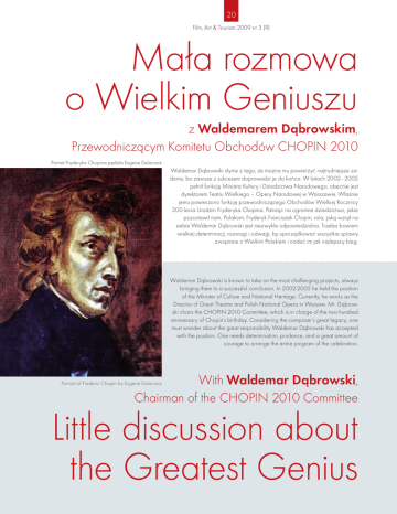 20 Film, Art & Tourism 2009 nr 3 (9) Mała rozmowa o Wielkim Geniuszu z Waldemarem Dąbrowskim, Przewodniczącym Komitetu Obchodów CHOPIN 2010 Portret Fryderyka Chopina pędzla Eugene Delacroix Waldemar Dąbrowski słynie z tego, że można mu powierzyć najtrudniejsze zadanie, bo zawsze z sukcesem doprowadzi je do końca. W latach 2002 – 2005 pełnił funkcję Ministra Kultury i Dziedzictwa Narodowego, obecnie jest dyrektorem Teatru Wielkiego – Opery Narodowej w Warszawie. Właśnie jemu powierzono funkcję przewodniczącego Obchodów Wielkiej Rocznicy 200-lecia Urodzin Fryderyka Chopina. Patrząc na ogromne dziedzictwo, jakie pozostawił nam, Polakom, Fryderyk Franciszek Chopin, rola, jaką wziął na siebie Waldemar Dąbrowski jest niezwykle odpowiedzialna. Trzeba bowiem wielkiej determinacji, rozwagi i odwagi, by uporządkować wszystkie sprawy związane z Wielkim Polakiem i nadać im jak najlepszy bieg. Waldemar Dąbrowski is known to take on the most challenging projects, always bringing them to a successful conclusion. In 2002-2005 he held the position of the Minister of Culture and National Heritage. Currently, he works as the Director of Great Theatre and Polish National Opera in Warsaw. Mr. Dąbrowski chairs the CHOPIN 2010 Committee, which is in charge of the two-hundred anniversary of Chopin’s birthday. Considering the composer’s great legacy, one must wonder about the great responsibility Waldemar Dąbrowski has accepted with the position. One needs determination, prudence, and a great amount of courage to arrange the entire program of the celebration. With Waldemar Dąbrowski, Chairman of the CHOPIN 2010 Committee Portrait of Frederic Chopin by Eugene Delacroix Little discussion about the Greatest Genius 21 personalities Film, Art & Tourism 2009 nr 3 (9) Ewa Kotus: Nigdy przedtem, ani też potem, fortepian nie uzyskał takiego artystycznego znaczenia i świetności jak w twórczości Fryderyka Chopina. Żaden muzyk nie potrafił też tak pięknie opowiadać w utworach o swym kraju, jak to czynił nasz Wielki Rodak. Fortepian powinien być naszym symbolem, godłem narodowym. · Waldemar Dąbrowski: Myślę, że w jakimś sensie jest. Wielka polska kultura pianistyczna w dużej mierze zrodziła się właśnie z Chopina i z faktu, że to On nadał fortepianowi rangę królewską. Przez wiele pokoleń był to rodzaj zobowiązania dla polskich pianistów. Polskie kariery pianistyczne są niezwykłe, na przestrzeni wieków mamy już przecież do czynienia z polską szkołą pianistyczną. Ostatnio w Rosji Minister Kultury przedstawił mi Denisa Matsujewa. To młody pianista, przystojny, bogaty, można powiedzieć: król życia. Zapytałem go, czy włączy się w obchody Roku Chopinowskiego. „Wobec Fryderyka Chopina mam takie zobowiązania jak wobec własnego ojca” – powiedział. „Kim bylibyśmy my, pianiści bez Chopina, kogo byśmy grali? Liszta, może trochę Schumanna. A czym by był fortepian? Takim sobie instrumentem… Tak więc, w sprawie Chopina zawsze jestem do dyspozycji”. Artur Rubinstein powiedział, że Fryderyk Chopin pierwszy w historii kazał fortepianowi śpiewać. Nie używał go jako instrumentu perkusyjnego, ale podniósł go do rangi solisty. · Od czasów Chopina fortepian rzeczywiście zaczął śpiewać. To przy tym instrumencie kompozytor wyrażał swój genialny talent. W zasadzie nie zdradził fortepianu. Napisał wprawdzie także osiemnaście pieśni, nieliczne utwory muzyki kameralnej itd., ale pozostał bezwzględnie wierny temu jednemu instrumentowi. Wydobył z niego wszystko, co można było z niego wydobyć w tamtych czasach i myślę, że znacznie przekroczył granice swojej epoki, przy całej miłości do hedonistycznego stylu życia. Bo trzeba powiedzieć, że Chopin był arystokratą duchem, miał także pragnienie istnienia w aurze środowisk „uprzywilejowanych”, ale w swojej sztuce pozostawał całkowicie sobą. Poza tym miał w sobie ten rodzaj elegancji, która czyniła go centralną postacią salonów Paryża, Wiednia… Fryderyk Chopin był bowiem niezwykle utalentowany − nie tylko muzycznie. · Tak, był człowiekiem wielu talentów. Znakomicie pisał, świetnie rysował, znał biegle kilka języków obcych, miał ogromne poczucie humoru, wspaniale Ewa Kotus: Never before and after has the piano been more celebrated than in Chopin’s Works. There is no other musician who would be able to musically express such a great amount of feelings and emotions for his/ her homeland as did Frederic Chopin. The piano should be our national symbol, an emblem. · Waldemar Dąbrowski: I think it is to a certain extent. Chopin’s music has spawned the Polish piano culture. The composer was the one to give this instrument a royal status. For many generations Frederic Chopin has been an inspiration for Polish pianists. Centuries have witnessed impressive careers of Polish piano players on the international scene. There is a phenomenon known as the Polish piano school. During my visit to Moscow the Russian Minister of Culture introduced me to Denis Matsujew, a young, handsome, rich pianist that you could describe as the “king of life”. I asked him if he would be interested in joining the 2010 Chopin Anniversary. “I have the same obligations towards Chopin as I have for my own father,” he replied. “What would all the pianists be without Chopin? What pieces would we play? A bit of Liszt, a bit of Schumann. What would the piano be? Just an ordinary instrument… When it comes to Chopin, I’m always at everyone’s disposal.” Arthur Rubinstein said that Chopin was the first pianist to make the piano sing. He didn’t use it for accompaniment but turned it into a solo performer. · Since the days of Chopin the piano as an instrument has truly been singing. It was the piano on which the composer could express his great talent. Having written eighteen songs and several chamber music pieces, he would always remain faithful t
