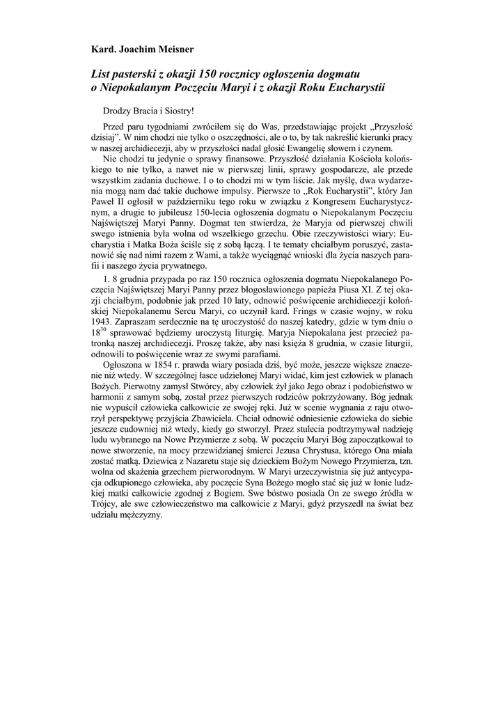Kard. Joachim Meisner List pasterski z okazji 150 rocznicy ogłoszenia dogmatu o Niepokalanym Poczęciu Maryi i z okazji Roku Eucharystii Drodzy Bracia i Siostry! Przed paru tygodniami zwróciłem się do Was, przedstawiając projekt „Przyszłość dzisiaj”. W nim chodzi nie tylko o oszczędności, ale o to, by tak nakreślić kierunki pracy w naszej archidiecezji, aby w przyszłości nadal głosić Ewangelię słowem i czynem. Nie chodzi tu jedynie o sprawy finansowe. Przyszłość działania Kościoła kolońskiego to nie tylko, a nawet nie w pierwszej linii, sprawy gospodarcze, ale przede wszystkim zadania duchowe. I o to chodzi mi w tym liście. Jak myślę, dwa wydarzenia mogą nam dać takie duchowe impulsy. Pierwsze to „Rok Eucharystii”, który Jan Paweł II ogłosił w październiku tego roku w związku z Kongresem Eucharystycznym, a drugie to jubileusz 150-lecia ogłoszenia dogmatu o Niepokalanym Poczęciu Najświętszej Maryi Panny. Dogmat ten stwierdza, że Maryja od pierwszej chwili swego istnienia była wolna od wszelkiego grzechu. Obie rzeczywistości wiary: Eucharystia i Matka Boża ściśle się z sobą łączą. I te tematy chciałbym poruszyć, zastanowić się nad nimi razem z Wami, a także wyciągnąć wnioski dla życia naszych parafii i naszego życia prywatnego. 1. 8 grudnia przypada po raz 150 rocznica ogłoszenia dogmatu Niepokalanego Poczęcia Najświętszej Maryi Panny przez błogosławionego papieża Piusa XI. Z tej okazji chciałbym, podobnie jak przed 10 laty, odnowić poświęcenie archidiecezji kolońskiej Niepokalanemu Sercu Maryi, co uczynił kard. Frings w czasie wojny, w roku 1943. Zapraszam serdecznie na tę uroczystość do naszej katedry, gdzie w tym dniu o 1830 sprawować będziemy uroczystą liturgię. Maryja Niepokalana jest przecież patronką naszej archidiecezji. Proszę także, aby nasi księża 8 grudnia, w czasie liturgii, odnowili to poświęcenie wraz ze swymi parafiami. Ogłoszona w 1854 r. prawda wiary posiada dziś, być może, jeszcze większe znaczenie niż wtedy. W szczególnej łasce udzielonej Maryi widać, kim jest człowiek w planach Bożych. Pierwotny zamysł Stwórcy, aby człowiek żył jako Jego obraz i podobieństwo w harmonii z samym sobą, został przez pierwszych rodziców pokrzyżowany. Bóg jednak nie wypuścił człowieka całkowicie ze swojej ręki. Już w scenie wygnania z raju otworzył perspektywę przyjścia Zbawiciela. Chciał odnowić odniesienie człowieka do siebie jeszcze cudowniej niż wtedy, kiedy go stworzył. Przez stulecia podtrzymywał nadzieję ludu wybranego na Nowe Przymierze z sobą. W poczęciu Maryi Bóg zapoczątkował to nowe stworzenie, na mocy przewidzianej śmierci Jezusa Chrystusa, którego Ona miała zostać matką. Dziewica z Nazaretu staje się dzieckiem Bożym Nowego Przymierza, tzn. wolna od skażenia grzechem pierworodnym. W Maryi urzeczywistnia się już antycypacja odkupionego człowieka, aby poczęcie Syna Bożego mogło stać się już w łonie ludzkiej matki całkowicie zgodnej z Bogiem. Swe bóstwo posiada On ze swego źródła w Trójcy, ale swe człowieczeństwo ma całkowicie z Maryi, gdyż przyszedł na świat bez udziału mężczyzny. 50 Kard. Joachim Meisner Ponieważ Maryja przez swe Niepokalane Poczęcie pod sercem swej matki Anny stała się otwarta na Boga, Syn Boży zstąpił na ziemię i stał się otwarty na człowieka. To wspaniałe wydarzenie jest dla wielu współczesnych, również chrześcijan, niezrozumiałe, gdyż brakuje zrozumienia dla znaczenia bezgrzeszności i świętości. Poprzez głoszenie niezwykłej łaski udzielonej Maryi, co uroczyście zapoczątkowano przed 150laty, staje się jasne, że w życiu człowieka nie ma nic ważniejszego od jego stosunku do Boga, a to dochodzi do skutku jedynie przez wszechmocne Boże działanie zbawcze. 2. W uroczystość Wniebowzięcia Najświętszej Maryi Panny, w Lourdes Ojciec Święty świętował wspomnienie ogłoszenia dogmatu z 1854 r. teraz wzywa cały Kościół do obchodu „Roku Eucharystii”. Został on ogłoszony w czasie światowego Kongresu Eucharystycznego w Guadalajara w Meksyku, odbywającego się od 10 do 17 października 2004 r. Zakończony zostanie w październiku 2005 r., kiedy zakończy się Synod Biskupów poświęcony Eucharystii. Nie jest to trudne, aby dostrzec ścisłą więź między wpatrywaniem się w Maryję a czcią oddawaną Eucharystii. Przybranie przez Syna Bożego człowieczeństwa w Maryi i Jego uobecnienie się pod postaciami chleba i wina tworzą wewnętrzną łączność. „To ..., co widzialne było w naszym Zbawicielu, przeszło w sakramenty [Kościoła]” – mówił papież Leon Wielki. Widzialne człowieczeństwo przyjął Jezus od swej Matki Maryi. Kiedy w Komunii św. przyjmujemy prawdziwe Ciało Pana, zostaje nam podarowana łączność z Jego Matką. Znamy pieśń pochwalną śpiewaną chętnie już od ponad 600 lat w czasie Mszy św.: „Ave verum corpus natum de Maria Virgine – Bądź pozdrowione prawdziwe Ciało zrodzone z Maryi”. Jest nam tu przedstawiona nie tylko pewna prawda wiary, ale ukazane osobiste odniesienie między Eucharystią a Matką Chrystusa. Ten nasz stosunek do Maryi jest podkreślony i wyjaśniony przez to, że Chrystus z krzyża oddał swoją Matkę Apostołowi Janowi, a przez niego chrześcijanom wszystkich czasów za ich Matkę. To właśnie ten moment, kiedy w czasie Mszy św., a dokładniej w czasie przeistoczenia, Chrystus staje się obecny. Apostoł wziął Ją do swego domu. Maryja miała szczególne miejsce w powstającym Kościele, co zostało ukazane we wspólnocie uczniów z Maryją oczekujących w Wieczerniku na przyjście Ducha Świętego. Wskazanie Maryi wypowiedziane do sług na weselu w Kanie Galilejskiej może otrzymać znaczenie ogólne: „Zróbcie wszystko, cokolwiek wam powie” (J 2,5). Jan i inni Apostołowie słyszeli także szczególne wskazanie Jezusa na Ostatniej Wieczerzy: „To czyńcie na moją pami