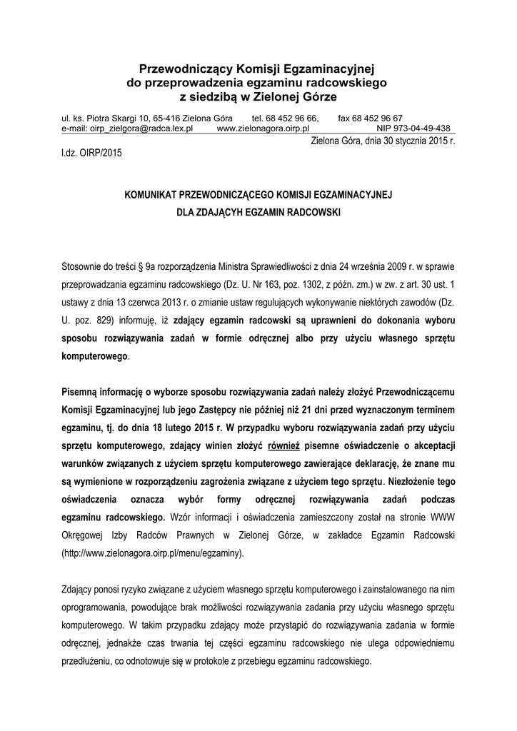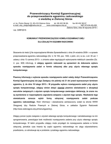 Przewodniczący Komisji Egzaminacyjnej do przeprowadzenia egzaminu radcowskiego z siedzibą w Zielonej Górze ul. ks. Piotra Skargi 10, 65-416 Zielona Góra tel. 68 452 96 66, e-mail: [email protected] www.zielonagora.oirp.pl fax 68 452 96 67 NIP 973-04-49-438 Zielona Góra, dnia 30 stycznia 2015 r. l.dz. OIRP/2015 KOMUNIKAT PRZEWODNICZĄCEGO KOMISJI EGZAMINACYJNEJ DLA ZDAJĄCYH EGZAMIN RADCOWSKI Stosownie do treści § 9a rozporządzenia Ministra Sprawiedliwości z dnia 24 września 2009 r. w sprawie przeprowadzania egzaminu radcowskiego (Dz. U. Nr 163, poz. 1302, z późn. zm.) w zw. z art. 30 ust. 1 ustawy z dnia 13 czerwca 2013 r. o zmianie ustaw regulujących wykonywanie niektórych zawodów (Dz. U. poz. 829) informuję, iż zdający egzamin radcowski są uprawnieni do dokonania wyboru sposobu rozwiązywania zadań w formie odręcznej albo przy użyciu własnego sprzętu komputerowego. Pisemną informację o wyborze sposobu rozwiązywania zadań należy złożyć Przewodniczącemu Komisji Egzaminacyjnej lub jego Zastępcy nie później niż 21 dni przed wyznaczonym terminem egzaminu, tj. do dnia 18 lutego 2015 r. W przypadku wyboru rozwiązywania zadań przy użyciu sprzętu komputerowego, zdający winien złożyć również pisemne oświadczenie o akceptacji warunków związanych z użyciem sprzętu komputerowego zawierające deklarację, że znane mu są wymienione w rozporządzeniu zagrożenia związane z użyciem tego sprzętu. Niezłożenie tego oświadczenia oznacza wybór formy odręcznej rozwiązywania zadań podczas egzaminu radcowskiego. Wzór informacji i oświadczenia zamieszczony został na stronie WWW Okręgowej Izby Radców Prawnych w Zielonej Górze, w zakładce Egzamin Radcowski (http://www.zielonagora.oirp.pl/menu/egzaminy). Zdający ponosi ryzyko związane z użyciem własnego sprzętu komputerowego i zainstalowanego na nim oprogramowania, powodujące brak możliwości rozwiązywania zadania przy użyciu własnego sprzętu komputerowego. W takim przypadku zdający może przystąpić do rozwiązywania zadania w formie odręcznej, jednakże czas trwania tej części egzaminu radcowskiego nie ulega odpowiedniemu przedłużeniu, co odnotowuje się w protokole z przebiegu egzaminu radcowskiego. W przypadku wystąpienia w trakcie trwania egzaminu radcowskiego jakichkolwiek okoliczności wyłączających możliwość korzystania z własnego sprzętu komputerowego zdający sporządza pracę zawierającą rozwiązanie zadania – w formie odręcznej, jednakże czas trwania tej części egzaminu radcowskiego nie ulega przedłużeniu. Powyższe odnotowuje się w protokole z przebiegu egzaminu radcowskiego. Zdający rozwiązując zadanie przy użyciu własnego sprzętu komputerowego, w każdym momencie zdawania egzaminu radcowskiego może zrezygnować z tej formy rozwiązywania zadań i sporządzić pracę zawierającą rozwiązanie zadania w formie odręcznej, jednakże czas trwania tej części egzaminu radcowskiego nie ulega przedłużeniu. W takim przypadku Przewodniczący Komisji Egzaminacyjnej lub jego Zastępca informuje zdającego o możliwości i sposobie odbioru od zdającego dotychczas sporządzonej pracy zawierającej rozwiązanie zadania, jeśli została zapisana przez zdającego, w celu kontynuowania rozwiązania zadania w formie odręcznej. Powyższe odnotowuje się w protokole z przebiegu egzaminu radcowskiego. Zdający, który wybierze możliwość rozwiązywania zadań przy użyciu sprzętu komputerowego, winien sprzęt ten dostarczyć na egzamin we własnym zakresie. W przypadku wątpliwości zdającego czy sprzęt komputerowy, na którym zamierza rozwiązywać zadania podczas egzaminu spełnia wymagania techniczne (które zostały podane do wiadomości publicznej na stronie WWW Ministerstwa Sprawiedliwości w zakładce „Zawodowe Egzaminy Prawnicze” (http://ms.gov.pl/pl/zawodoweegzaminy-prawnicze/), zdający winnien - przed egzaminem i we własnym zakresie - skorzystać z pomocy informatyka. Tylko właściwie przygotowany i spełniający wymogi techniczne sprzęt komputerowy zapewni prawidłowe działanie Aplikacji do zdawania egzaminu. Przygotowanie sprzętu komputerowego - zgodnie z parametrami jest obowiązkiem osoby, która zadeklarowała taką formę rozwiązywania zadań. Minimalne wymagania (przetestowane wymagania komputera, przy których aplikacja pracuje prawidłowo. Należy mieć na uwadze, że zainstalowane na komputerze zdającego i pracujące w tle inne aplikacje mogą spowolnić działanie aplikacji egzaminacyjnej, dlatego sugeruje się odinstalowanie zbędnych aplikacji na czas trwania egzaminu), które powinien spełniać komputer zdającego dla prawidłowego działania aplikacji do zdawania egzaminu prawniczego są następujące: - procesor Pentium 1 GHz lub jego odpowiednik; - 512 MB pamięci RAM (zalecane 1024MB); - system operacyjny (32/64-bit): Windows XP SP3, Windows Vista, Windows 7, Windows 8; Windows 8.1 - zainstalowany program Microsoft .NET Framework 3.5 SP1 (Microsoft.NET 3.5 SP1 jest domyślnie zintegrowany jako składnik systemu Windows 7, w przypadku systemu Windows XP, Vista, Windows 8, Windows 8.1 należy go doinstalować) - 100 MB wolnego miejsca na dysku systemowym komputera; - wolny port USB; - konto użytkownika o prawach administratora lokalnego do komputera (aby sprawdzić czy zalogowany użytkownik posiada uprawnienia administratora lokalnego do komputera należy w linii poleceń wykonać komendę net user %username% i sprawdzić czy na wyświetlonej liście znajduje się następujący wpis „Członkostwa grup lokalnych *Administratorzy”) - odinstalowany program antywirusowy; - wyłączony wygaszacz ekranu; - opcja (schemat) zasilania ustawiona na funkcję „prezentacja” / „wysoka wydajność” ( komputer powinien być skonfigurowany w taki sposób aby w przypadku bezczynności nie używał funkcji wstrzymywania systemu (tryb uśpienia) i wygaszacza ekranu). - zegar komputera ustawiony zgodnie z obowiąz