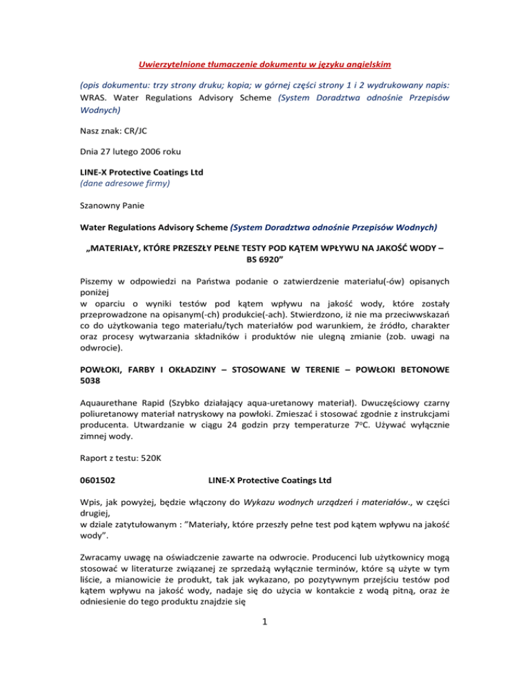 Uwierzytelnione tłumaczenie dokumentu w języku angielskim (opis dokumentu: trzy strony druku; kopia; w górnej części strony 1 i 2 wydrukowany napis: WRAS. Water Regulations Advisory Scheme (System Doradztwa odnośnie Przepisów Wodnych) Nasz znak: CR/JC Dnia 27 lutego 2006 roku LINE-X Protective Coatings Ltd (dane adresowe firmy) Szanowny Panie Water Regulations Advisory Scheme (System Doradztwa odnośnie Przepisów Wodnych) „MATERIAŁY, KTÓRE PRZESZŁY PEŁNE TESTY POD KĄTEM WPŁYWU NA JAKOŚĆ WODY – BS 6920” Piszemy w odpowiedzi na Państwa podanie o zatwierdzenie materiału(-ów) opisanych poniżej w oparciu o wyniki testów pod kątem wpływu na jakość wody, które zostały przeprowadzone na opisanym(-ch) produkcie(-ach). Stwierdzono, iż nie ma przeciwwskazań co do użytkowania tego materiału/tych materiałów pod warunkiem, że źródło, charakter oraz procesy wytwarzania składników i produktów nie ulegną zmianie (zob. uwagi na odwrocie). POWŁOKI, FARBY I OKŁADZINY – STOSOWANE W TERENIE – POWŁOKI BETONOWE 5038 Aquaurethane Rapid (Szybko działający aqua-uretanowy materiał). Dwuczęściowy czarny poliuretanowy materiał natryskowy na powłoki. Zmieszać i stosować zgodnie z instrukcjami producenta. Utwardzanie w ciągu 24 godzin przy temperaturze 7oC. Używać wyłącznie zimnej wody. Raport z testu: 520K 0601502 LINE-X Protective Coatings Ltd Wpis, jak powyżej, będzie włączony do Wykazu wodnych urządzeń i materiałów., w części drugiej, w dziale zatytułowanym : ”Materiały, które przeszły pełne test pod kątem wpływu na jakość wody”. Zwracamy uwagę na oświadczenie zawarte na odwrocie. Producenci lub użytkownicy mogą stosować w literaturze związanej ze sprzedażą wyłącznie terminów, które są użyte w tym liście, a mianowicie że produkt, tak jak wykazano, po pozytywnym przejściu testów pod kątem wpływu na jakość wody, nadaje się do użycia w kontakcie z wodą pitną, oraz że odniesienie do tego produktu znajdzie się 1 w dziale Materiały, Część druga Wykazu wodnych urządzeń i materiałów; można wprowadzić skrót: „System Doradztwa odnośnie Przepisów Wodnych – Produkt zatwierdzony” lub „WRAS - Produkt zatwierdzony”. Zatwierdzenie tego produktu nie oznacza zatwierdzenia jego mechanicznych lub fizycznych własności dla jakiegokolwiek użytkowania. Komitet Techniczny Systemu zastrzega sobie prawo do korekty zatwierdzenia. Niniejszy produkt automatycznie podlegać będzie ponownej ocenie kontrolnej w styczniu 2011 roku. Z poważaniem, ( - ) Chris Ramsey (Panna), nieczytelny podpis Administrator ds. Materiałów System Doradztwa odnośnie Przepisów Wodnych (str. 2 dokumentu, nienumerowana): Lee Smith LINE-X Protective Coatings Ltd (dane adresowe) Szanowny Panie Smith, AQUA-URETAN – NR REFERENCYJNY W WYKAZIE 060 1502 Pozycja ta pojawi się w następnym wydaniu Wykazu wodnych urządzeń i materiałów Wykaz jest dostępny pod następującym adresem: WRc-NSF Ltd (dane teleadresowe firmy – por. dołączony dokument) Pozycja jest publikowana dwa razy w ciągu roku, w kwietniu i październiku. Prosimy odwiedzić naszą stronę internetową: www.wras.co.uk w celu uzyskania dalszych informacji. Z poważaniem, ( - ) Chris Ramsey (Panna), nieczytelny podpis Administrator ds. Materiałów System Doradztwa odnośnie Przepisów Wodnych (str. 3 dokumentu, nienumerowana): MATERIAŁY, KTÓRE PRZESZŁY PEŁNE TESTY POD KĄTEM WPŁYWU NA JAKOŚĆ WODY I SĄ STOSOWANE W PRODUKCJI URZĄDZEŃ WODNYCH I INSTALACJI WODNYCH ORAZ ICH MONTAŻU, PODŁĄCZENIACH, ODŁĄCZENIACH I NAPRAWIE Materiał lub produkt, o którym mowa w niniejszym liście, nadaje się do kontaktu z oraz do wytwarzania składników urządzeń wodnych do użytkowania w kontakcie z wodą dla celów domowych. Orzeczenie to odnosi się wyłącznie do wpływu na jakość wody, z którą produkt może wejść w kontakt i nie oznacza zatwierdzenia jego mechanicznych oraz fizycznych własności dla jakiegokolwiek celu. Niektóre produkty są zatwierdzane przy pełnej wiedzy, że dla wielu materiałów plastikowych oraz naturalnych i syntetycznych kauczuków różnice w odniesieniu do czasu utwardzania oraz temperatur mogą mieć znaczący wpływ na jakość 2 wody. Zastrzega się prawo do zażądania przetestowania składników wyprodukowanych z jakiegokolwiek z tych materiałów przed umieszczeniem tych składników w wykazie, jeżeli w projekcie zastosowania wystąpi jakikolwiek powód do mniemania, iż różnią się one od materiałów oryginalnie testowanych i zawartych w wykazie. Wpisy w Wykazie odnoszące się do składników wyprodukowanych z wykazanych materiałów są dokonywane przy domniemaniu, że składniki są wyprodukowane z dokładnie tych samych materiałów, jak testowane próbki, bez żadnych modyfikacji oraz bez dodawania lub zastępowania jakichkolwiek składników oraz że, jeśli ma to zastosowanie, czas utwardzania i temperatura będą tak bliskie jak to tylko jest możliwe tym zalecanym przez producentów materiałów lub produktów oraz zastosowanym przy produkcji próbek testowych. W celu uniknięcia wpływu na jakość wody, materiały muszą być poddane utwardzaniu we właściwej temperaturze przez wymagany okres czasu. Nie zawsze jest to osiągalne w przypadku, gdy materiały są mieszane w terenie, często w przybliżonych proporcjach, oraz utwardzane w terenie w warunkach zimna, złej wentylacji. Wpisy dotyczące produktów lub produktów wytwarzanych w warunkach fabrycznych, we właściwy sposób kontrolowanych, nie mogą być zagwarantowane w przypadku warunków w terenie. --------------------------------------------------------------------------------------------------------------------------------Stwierdzam, że powyższy tekst jest wiernym i całkowitym tłumaczeniem przedstawionego mi dokumentu w języku angielskim. Kraków, dnia 16 stycznia 2010 roku . Ref. 02/16/01/10. 3