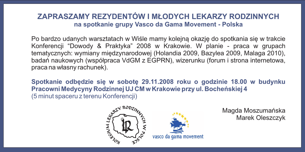 ZAPRASZAMY REZYDENTÓW I M£ODYCH LEKARZY RODZINNYCH na spotkanie grupy Vasco da Gama Movement - Polska Po bardzo udanych warsztatach w Wiœle mamy kolejn¹ okazjê do spotkania siê w trakcie Konferencji “Dowody & Praktyka” 2008 w Krakowie. W planie - praca w grupach tematycznych: wymiany miêdzynarodowej (Holandia 2009, Bazylea 2009, Malaga 2010), badañ naukowych (wspó³praca VdGM z EGPRN), wizerunku (forum i strona internetowa, praca na w³asny rachunek). Spotkanie odbêdzie siê w sobotê 29.11.2008 roku o godzinie 18.00 w budynku Pracowni Medycyny Rodzinnej UJ CM w Krakowie przy ul. Bocheñskiej 4 (5 minut spaceru z terenu Konferencji) Magda Moszumañska Marek Oleszczyk