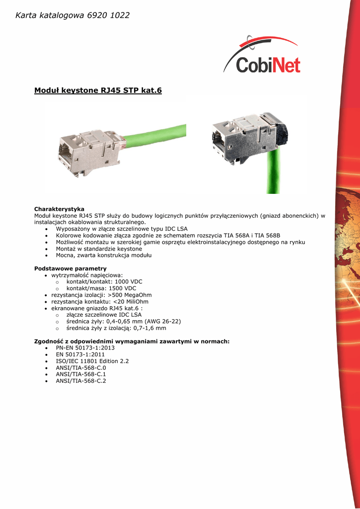 Karta katalogowa 6920 1022 Moduł keystone RJ45 STP kat.6 Charakterystyka Moduł keystone RJ45 STP służy do budowy logicznych punktów przyłączeniowych (gniazd abonenckich) w instalacjach okablowania strukturalnego. Wyposażony w złącze szczelinowe typu IDC LSA Kolorowe kodowanie złącza zgodnie ze schematem rozszycia TIA 568A i TIA 568B Możliwość montażu w szerokiej gamie osprzętu elektroinstalacyjnego dostępnego na rynku Montaż w standardzie keystone Mocna, zwarta konstrukcja modułu Podstawowe parametry wytrzymałość napięciowa: o kontakt/kontakt: 1000 VDC o kontakt/masa: 1500 VDC rezystancja izolacji: >500 MegaOhm rezystancja kontaktu: <20 MiliOhm ekranowane gniazdo RJ45 kat.6 : o złącze szczelinowe IDC LSA o średnica żyły: 0,4-0,65 mm (AWG 26-22) o średnica żyły z izolacją: 0,7-1,6 mm Zgodność z odpowiednimi wymaganiami zawartymi w normach: PN-EN 50173-1:2013 EN 50173-1:2011 ISO/IEC 11801 Edition 2.2 ANSI/TIA-568-C.0 ANSI/TIA-568-C.1 ANSI/TIA-568-C.2