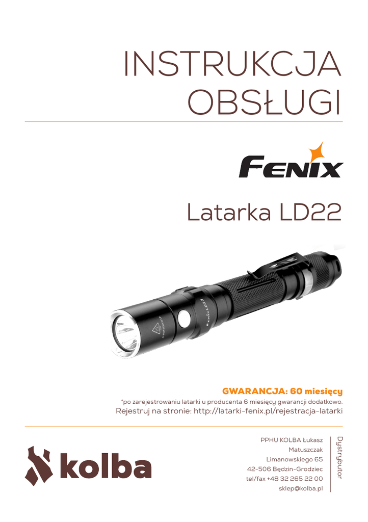 INSTRUKCJA OBSŁUGI Latarka LD22 GWARANCJA: 60 miesięcy *po zarejestrowaniu latarki u producenta 6 miesięcy gwarancji dodatkowo. Rejestruj na stronie: http://latarki-fenix.pl/rejestracja-latarki Matuszczak Limanowskiego 65 42-506 Będzin-Grodziec tel/fax +48 32 265 22 00 [email protected] Dystrybutor PPHU KOLBA Łukasz 2 Zasilanie W komplecie oprócz latarki znajdują się: • 1 × AA 1,5 V • zapasowe oringi • pokrowiec Ważne Do latarek nie stosować innych form zasilania niż • pasek/linka mocująca • klips wymienione wyżej. Zwłaszcza wszelkich akumulatorów o większych napięciach! Uwagi dotyczące użytkowania i konserwacji • Nie należy rozkręcać głowicy, gdyż może to pro- Uruchomienie latarki Przed pierwszym uruchomieniem sprawdź po- wadzić do trwałego uszkodzenia latarki i naruszenia warunków gwarancji prawność rodzaju zasilania (w szczególności wysokość • Należy unikać przegrzania baterii. Jeżeli korpus napięcia źródła prądu). Odkręć pokrywę baterii, znaj- latarki jest gorący, należy przełączyć latarkę na dującą się w tylnej części korpusu. Zainstaluj baterie niższy tryb lub wyłączyć ją w celu schłodzenia zgodnie z polaryzacją. Zakręć pokrywę i upewnij się, że • Należy zawsze używać źródła zasilania tego sa- dobrze dokręcona jest również głowica latarki, znaj- mego producenta, tego samego rodzaju, o takim dująca się w przedniej część korpusu. Uruchomienie następuje poprzez wciśnięcie włącznika głównego znajdującego się na tylnej części korpusu. samym poziomie naładowania • Jeżeli latarka nie będzie używana przez dłuższy czas zaleca się wyjęcie baterii, w celu uniknięcia wycieku elektrolitu lub eksplozji baterii Funkcje latarki • Na czas transportu oraz dłuższego przechowy- Latarka LD22 pracuje w sześciu trybach. Do prze- wania zaleca się odkręcenie pokrywy zasobnika chodzenia pomiędzy nimi używa się włącznika zmiany na baterie o pół obrotu, w celu uniknięcia przy- trybów, znajdującego się na korpusie latarki. Zmiana trybu ciągłego na migający następuje po przytrzymaniu tego włącznika. padkowego włączenia latarki • W przypadku zużycia się lub uszkodzenia uszczelki, należy wymienić ją na nową • Zaleca się okresowe czyszczenie styków latarki, Tryby ciągłe: • Turbo • Wysoki zwłaszcza gdy zaczyna ona mrugać lub nie można jej włączyć • Nie należy ładować baterii jednorazowych • Średni • Niski UWAGA! Tryby migania prowadzić do przegrzewania się baterii, a w konse- • S.O.S kwencji do wybuchu i uszkodzeniu ciała! Nie stosowanie się do powyższych zasad może • Stroboskop Stroboskop – Silne, szybko migające światło, o stałej wysokiej częstotliwości dezorientujące Latarka emituje światło o bardzo dużym natężeniu, które może powodować uszkodzenie wzro- przeciwnika. ku. Nie należy kierować wiązki światła bezpośred- Tryb SOS – Sygnał SOS (... - - - ...) zgodny z przy- nio w stronę oczu. jętym międzynarodowym standardem. 3 KARTA GWARANCYJNA Nazwa towaru Typ Latarka LD22 Numer fabryczny Data sprzedaży Pieczątka i podpis punktu sprzedaży Data przyjęcia Data wydania Opis usterki Pieczęć serwisu 4 WARUNKI GWARANCJI 1. Sprawne urządzenie nie podlega wymianie. 2. Ujawnione w okresie gwarancji wady będą usuwane bezpłatnie w terminie 21 dni roboczych od daty zgłoszenia reklamacji. 3. W przypadku, gdy naprawa wymaga importu części zamiennych z zagranicy termin naprawy może ulec wydłużeniu. przekraczającej zakres normalnych czynności eksploatacyjnych. 7. Gwarancji nie podlegają części obudowy i akcesoria podlegające normalnemu zużyciu w czasie eksploatacji jak zarysowanie, zabrudzenie trudne do usunięcia, wytarcie napisów itp. 8. Gwarancja nie obejmuje materiałów eksploatacyjnych. 4. Niniejszą gwarancją są objęte usterki spowo- 9. Karta gwarancyjna jest ważna po okazaniu dowo- dowane wadliwymi częściami i/lub defektami du zakupu, jeżeli jest ostemplowana przez sprze- produkcyjnymi. dawcę, posiada czytelnie i poprawnie wypełnione 5. Nabywcy przysługuje prawo wymiany sprzętu na nowy, jeżeli w okresie gwarancji upoważniony zakład stwierdzi, że usunięcie wady nie jest możliwe wszystkie rubryki bez zmian i skreśleń. 10.Reklamujący jest zobowiązany dostarczyć urządzenie do punktu sprzedaży. lub zostaną dokonane cztery naprawy przez upo- 11. Ewentualny koszt nieuzasadnionych roszczeń wy- ważniony punkt naprawczy, a sprzęt będzie nadal nikających z warunków gwarancji oraz testowania wykazywał wady uniemożliwiające używanie go zgodnie z przeznaczeniem. 6. N abywc a traci uprawnienia gwarancy jne ponosi Nabywca. 12.W celu przyspieszenia realizacji naprawy gwarancyjnej należy wraz z reklamowanym towarem w przypadku: dostarczyć dokładny opis usterki uwzględniają- • mechanicznego lub termicznego uszkodze- cy w szczególności jej zewnętrzne objawy oraz nia sprzętu, • niewłaściwej eksploat acji (niezgodnej z instrukcją) • n i ew ł a ś c i we g o p r ze c h ow y w a n i a l u b transportowania, • uszkodzeń spowodowanych przez wypad- DOKŁADNY ADRES ZWROTNY wraz z TELEFONEM KONTAKTOWYM. 13.Ewentualne spory związane z realizacją obowiązków gwarancyjnych będą rozstrzygane przez sąd właściwy dla siedziby PPHU Kolba. 14. Zakup urządzenia objętego niniejszą gwarancją jest ki losowe (pożar, wyładowania atmosferycz- równoznaczne z przyjęciem poniższych warunków. ne, zalanie, działanie środków chemicznych 15.Gwarancja na sprzedany towar konsumpcyjny nie oraz okoliczności i sił wyższego rzedu itp.), wyłącza, nie ogranicza, ani nie zawiesza upraw- samowolnej ingerencji nabywcy oraz innych nień kupującego wynikających z niezgodności to- nieuprawnionych osób we wnętrze produktu waru z umową. OŚWIADCZAM, ŻE ZAPOZNAŁEM SIĘ I AKCEPTUJĘ WARUNKI NINIEJSZEJ GWARANCJI ___________________________________________________