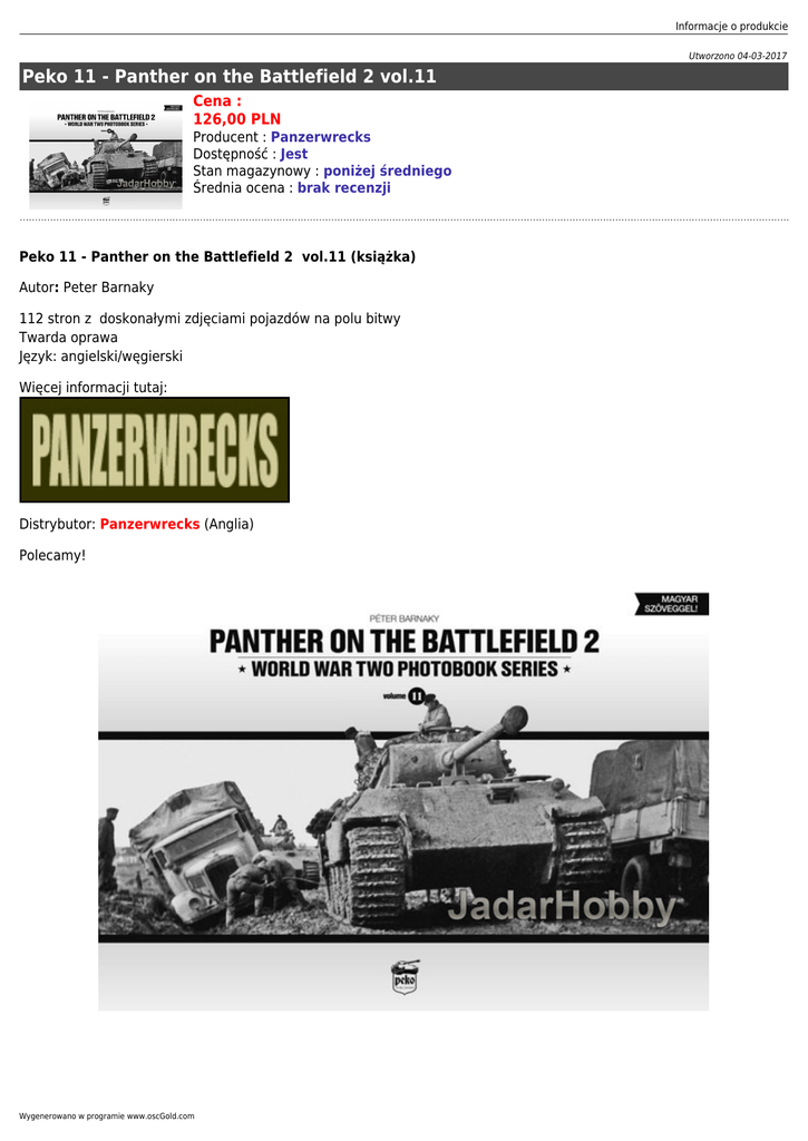 Informacje o produkcie Utworzono 04-03-2017 Peko 11 - Panther on the Battlefield 2 vol.11 Cena : 126,00 PLN Producent : Panzerwrecks Dostępność : Jest Stan magazynowy : poniżej średniego Średnia ocena : brak recenzji Peko 11 - Panther on the Battlefield 2 vol.11 (książka) Autor: Peter Barnaky 112 stron z doskonałymi zdjęciami pojazdów na polu bitwy Twarda oprawa Język: angielski/węgierski Więcej informacji tutaj: Distrybutor: Panzerwrecks (Anglia) Polecamy! Wygenerowano w programie www.oscGold.com Informacje o produkcie Wygenerowano w programie www.oscGold.com Informacje o produkcie Wygenerowano w programie www.oscGold.com